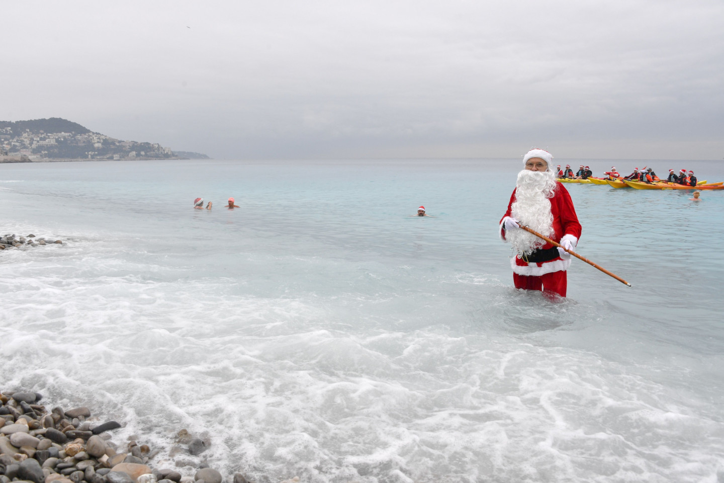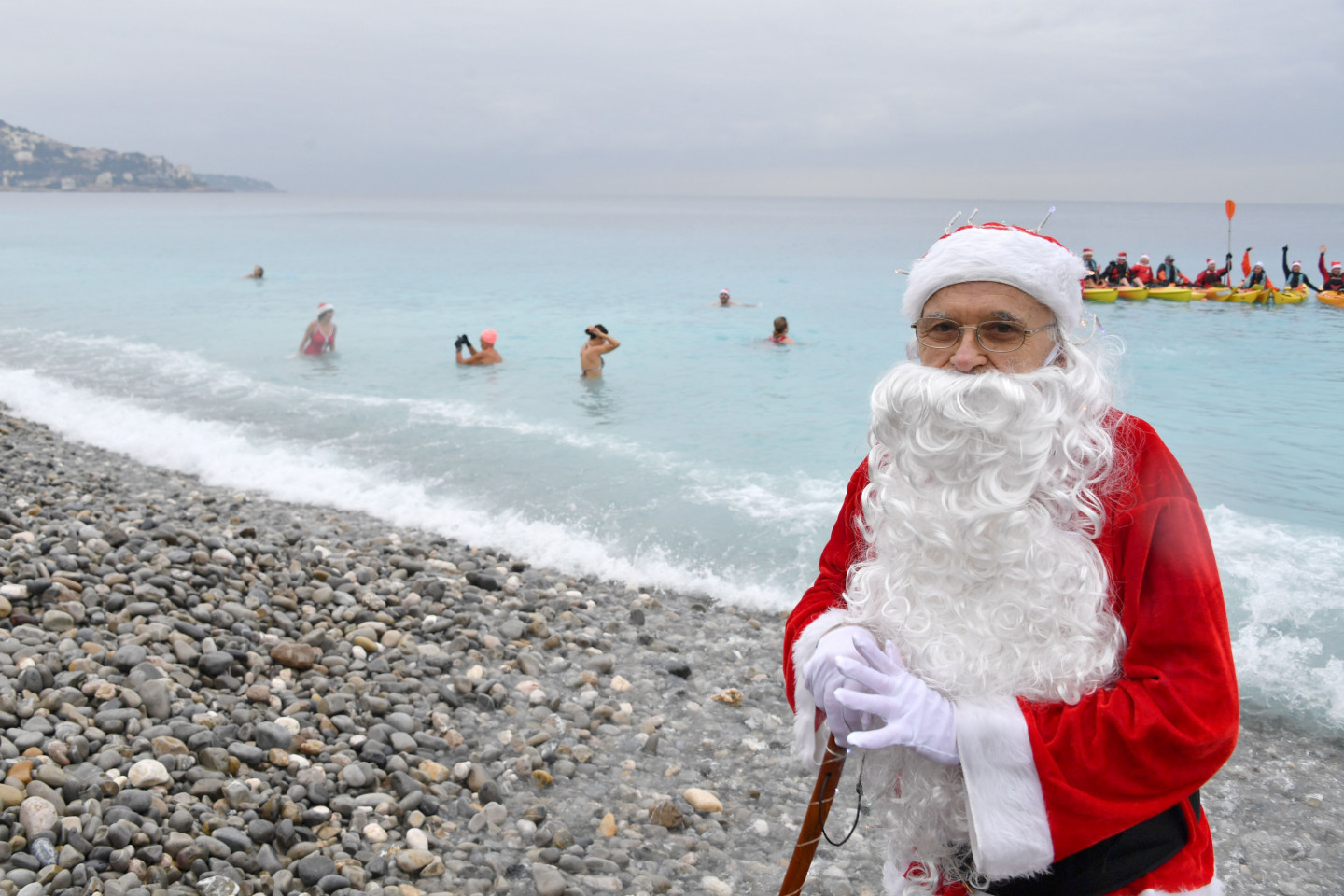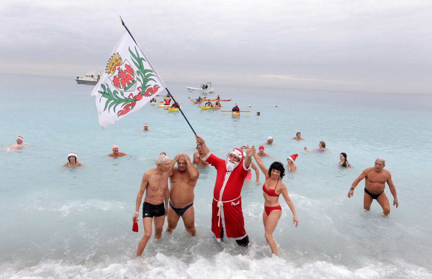 Farncijā, Nīcā tardicionāli vīrietis, kas pārģērbies par Ziemassvētku vecīti, devies izpeldēties.
