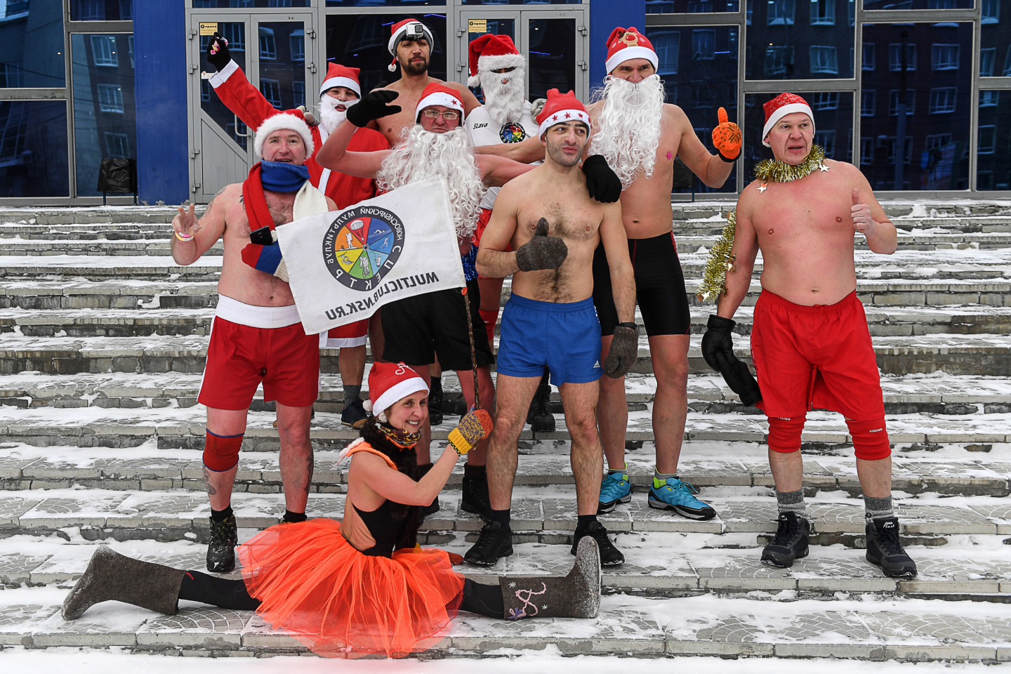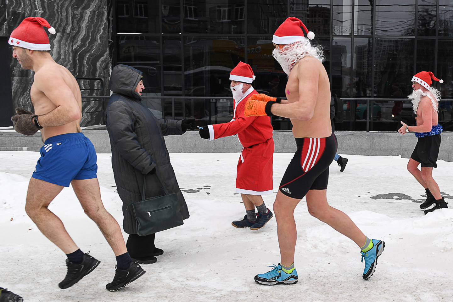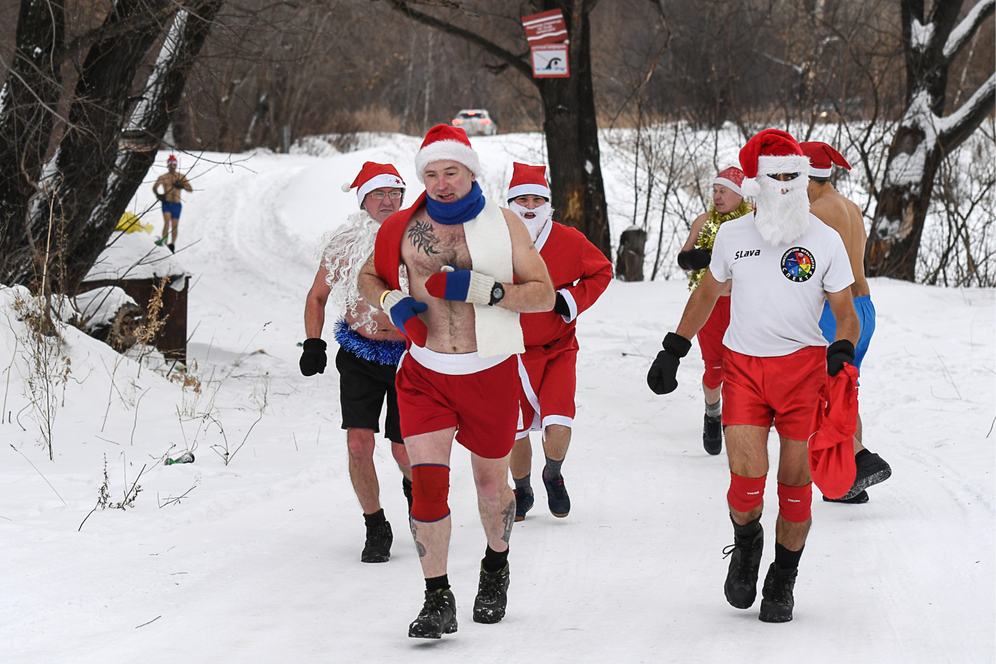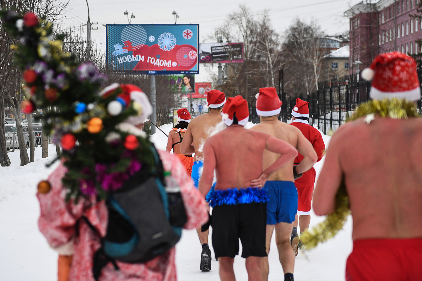 Krievijas pilsētā Novosibirskā vietējā ziemas peldēšanas kluba dalībnieki sarīkojuši skrējienu, kurā bija tērpušies peldšortos un Ziemassvētku vecīša cepurēs.