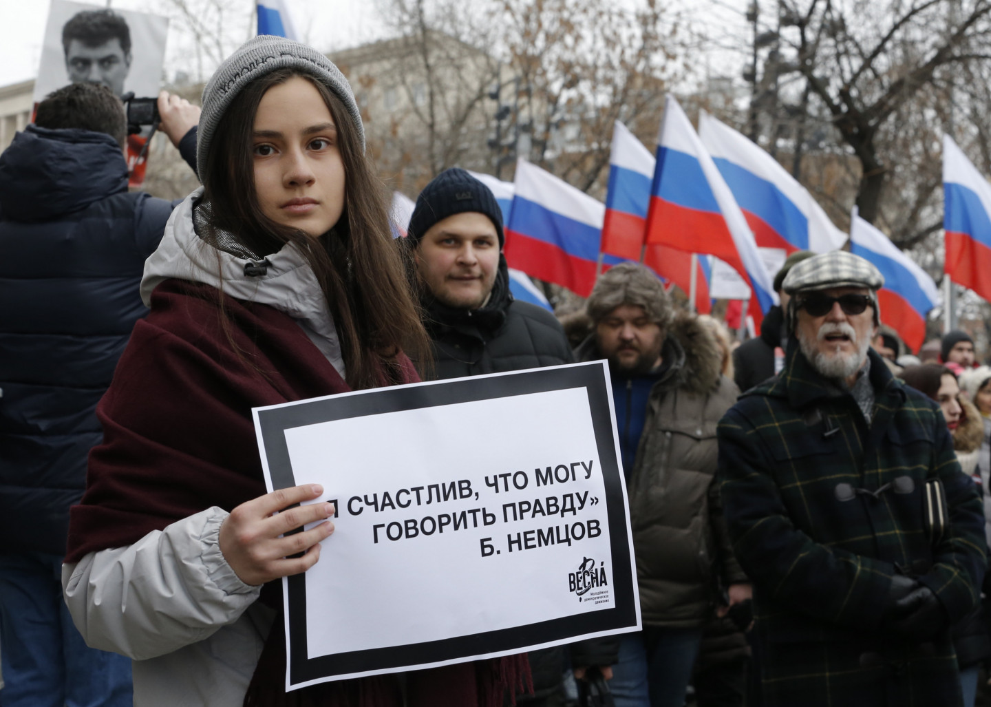 Tūkstošiem cilvēku svētdien Maskavas centrā piedalījās gājienā, pieminot pirms četriem gadiem noslepkavoto Krievijas opozīcijas politiķi Borisu Ņemcovu. Tikmēr Sanktpēterburgā, kur varas iestādes gājienu rīkot neatļāva, mītiņā pie Somijas stacijas piedalījās aptuveni 800 cilvēku, kurus no visām pusēm stingri uzraudzīja policija. Galvaspilsētā saskaņā ar opozīcijas aplēsēm gājienā piedalījās aptuveni 10 000 cilvēku, savukārt Krievijas Iekšlietu ministrija minējusi krietni mazāku skaitli - aptuveni 6000. Cilvēki nesa Ņemcova portretus un plakātus ar pazīstamiem viņa citātiem - "Krievijas galvenā problēma ir cinisms un cietsirdība", "Mums vajadzīgas pārmaiņas", "Taisnība ir mūsu pusē!". Lai gan gājiena maršruts neveda gar tiltu pār Maskavas upi, kur netālu no Kremļa 2015.gada 27.februārī tika nošauts Ņemcovs, daudzi cilvēki apmeklēja šo vietu, lai noliktu ziedus pie viņa portreta, ko apsargā brīvprātīgie. Maskavas varas iestādes nav uzklausījušas sabiedrības aicinājumus šai vietā novietot piemiņas zīmi vai iemūžināt nogalinātā politiķa piemiņu citā veidā, kamēr Vašingtonā viņa vārdā jau nosaukts laukums un Viļņā - skvērs.