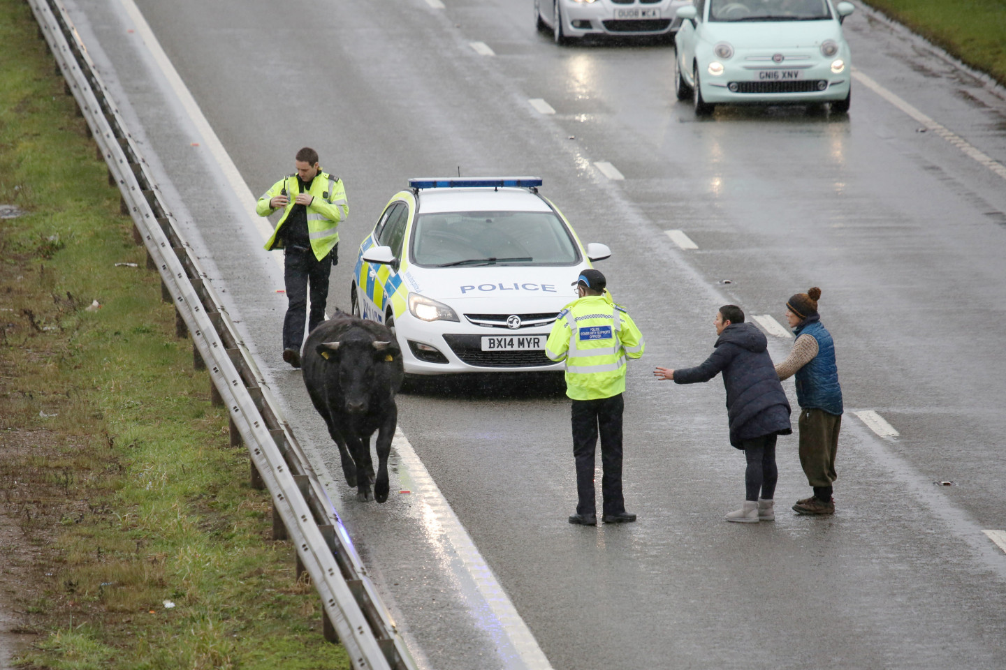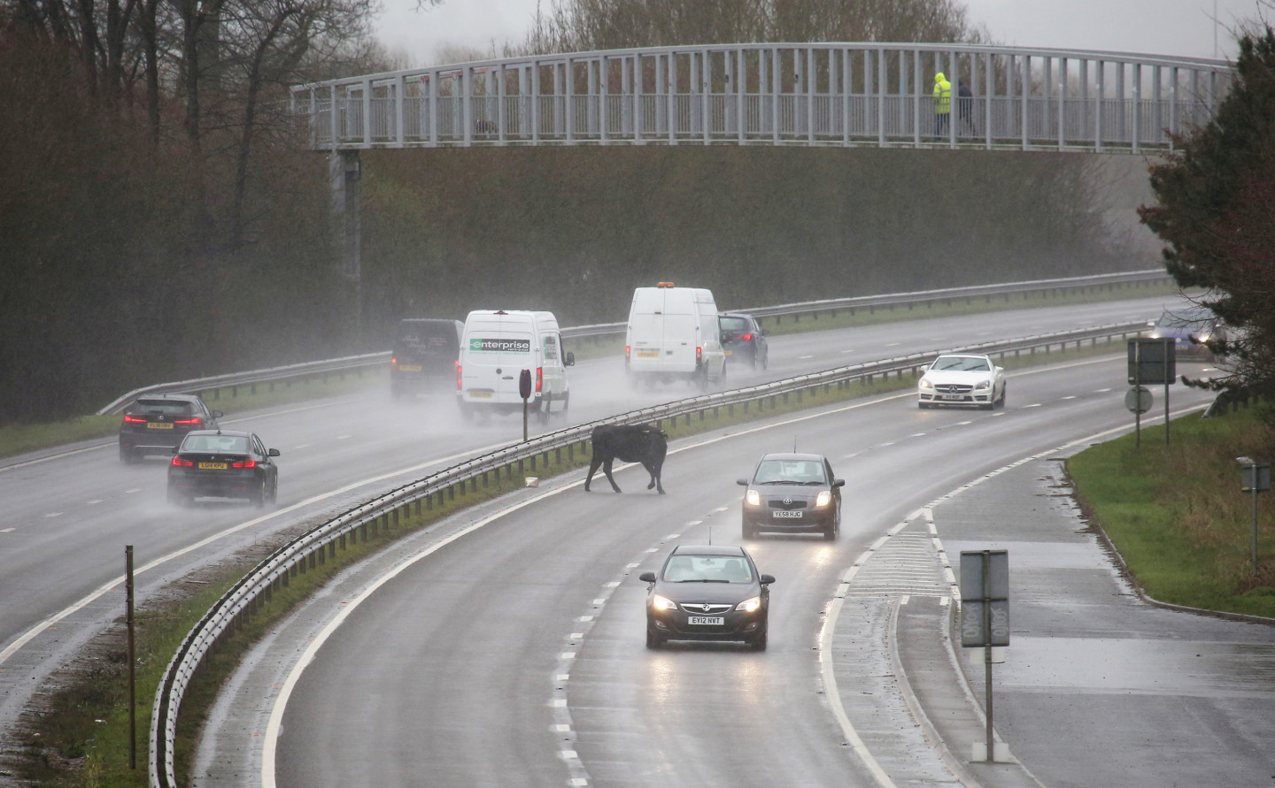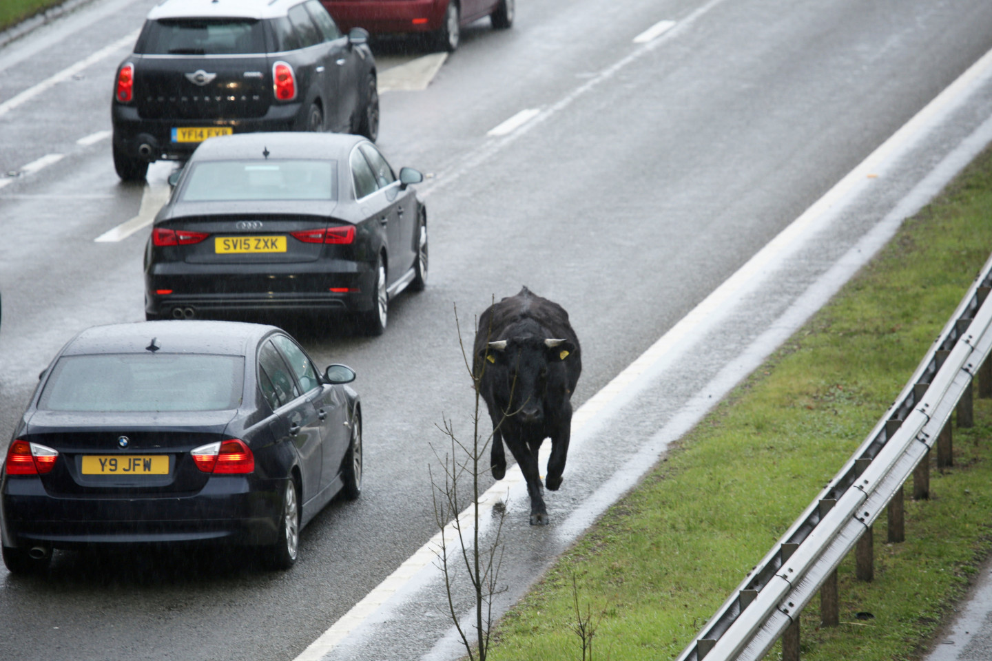 Lielbritānijā, Lesteršīrā, uz šosejas, naski skrienot starp mašīnām, pamanīts kāds izbēdzis bullis.