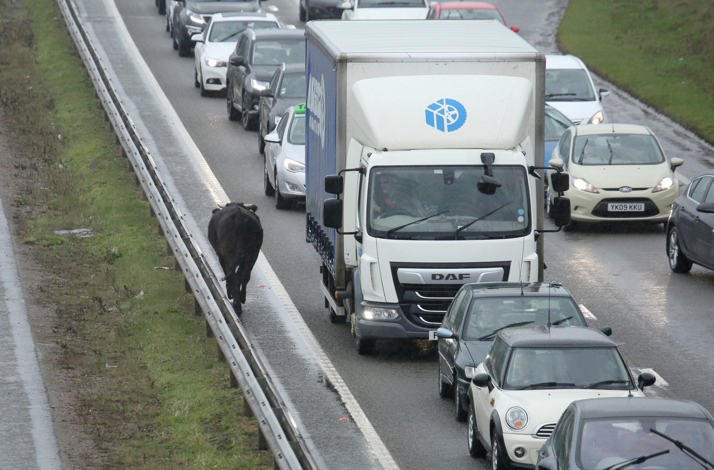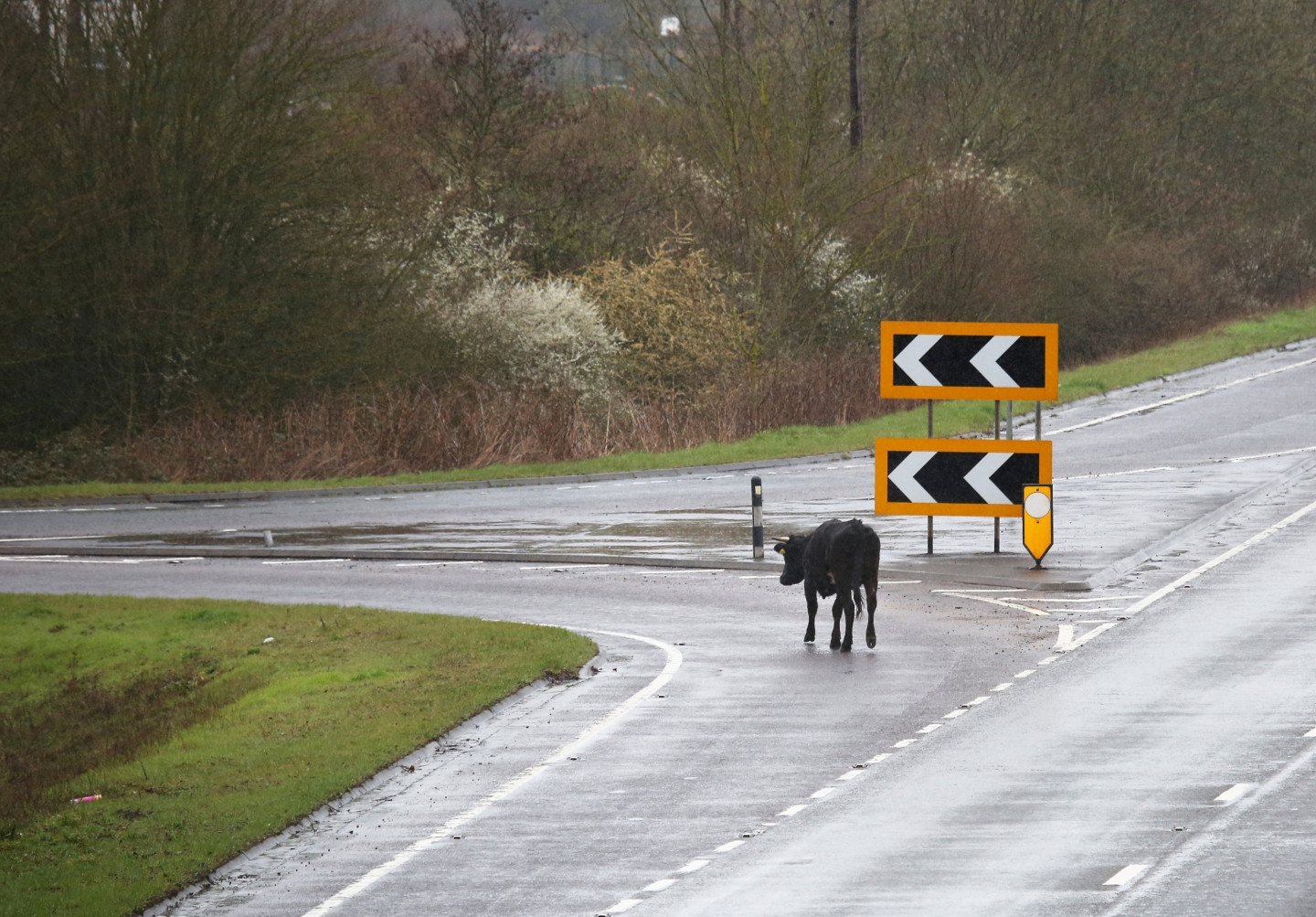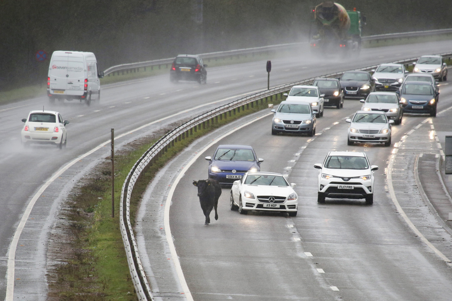 Lielbritānijā, Lesteršīrā, uz šosejas, naski skrienot starp mašīnām, pamanīts kāds izbēdzis bullis.