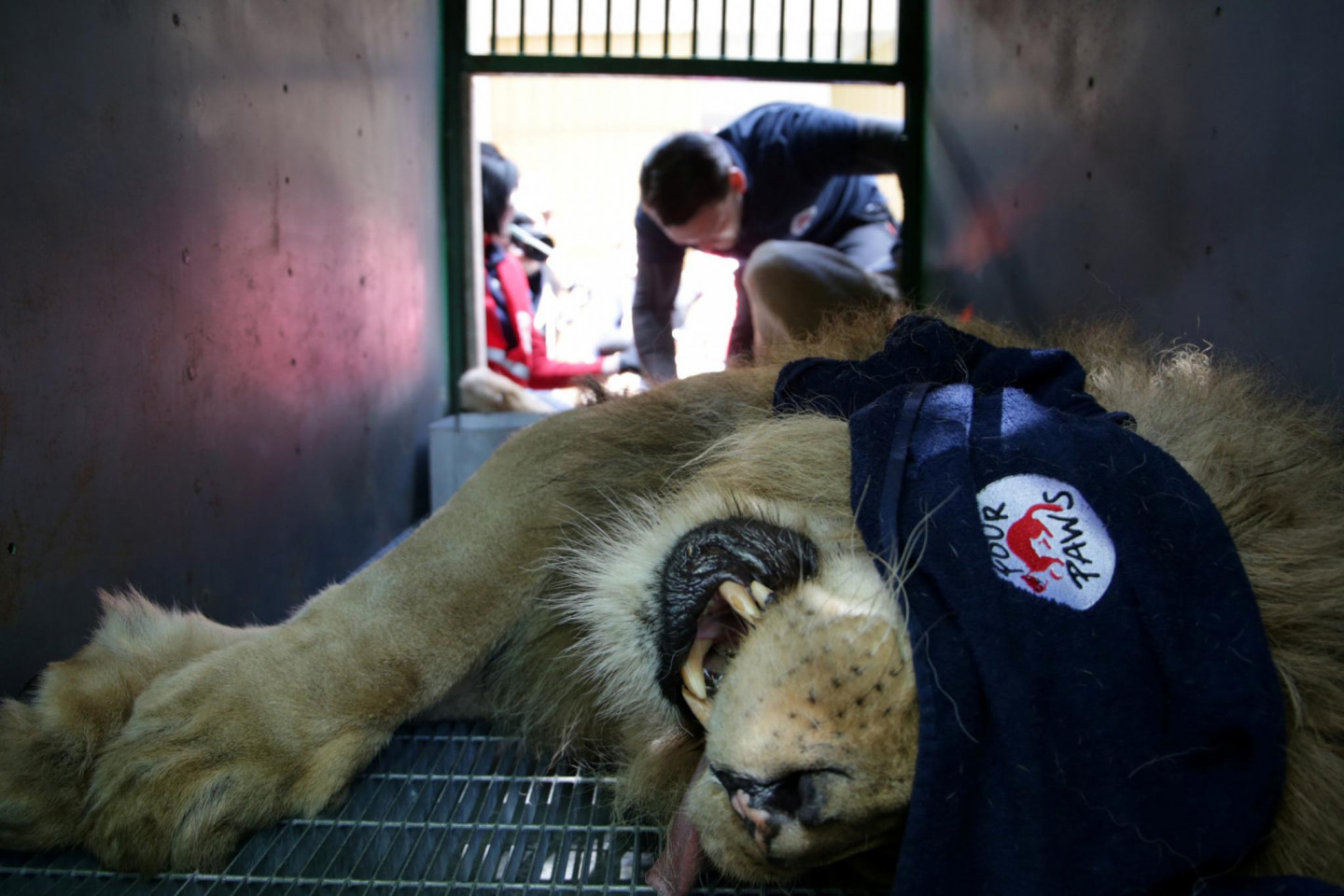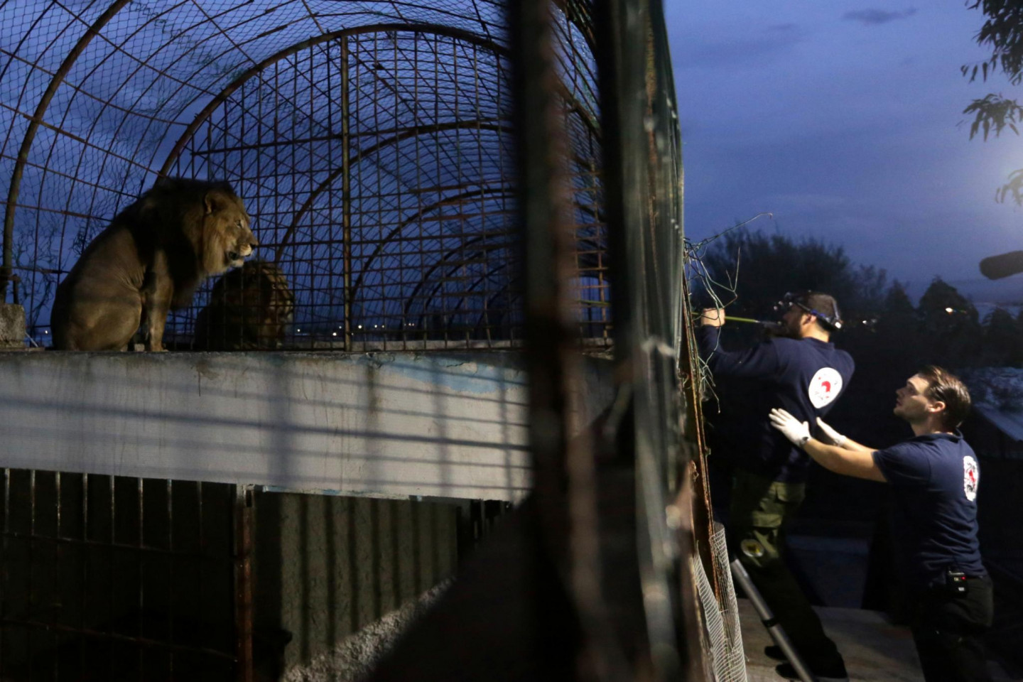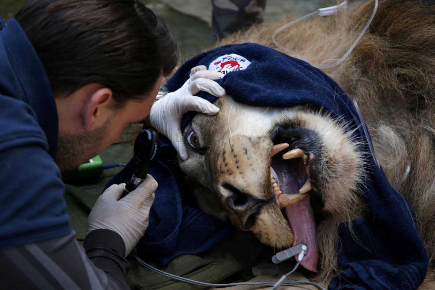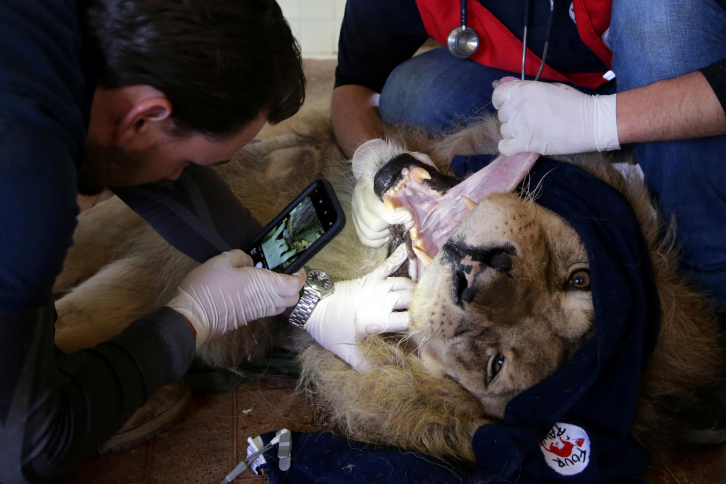 Vienā no Albānijas zooloģiskajiem dārziem tiek pārbaudīta lauvu veselība.