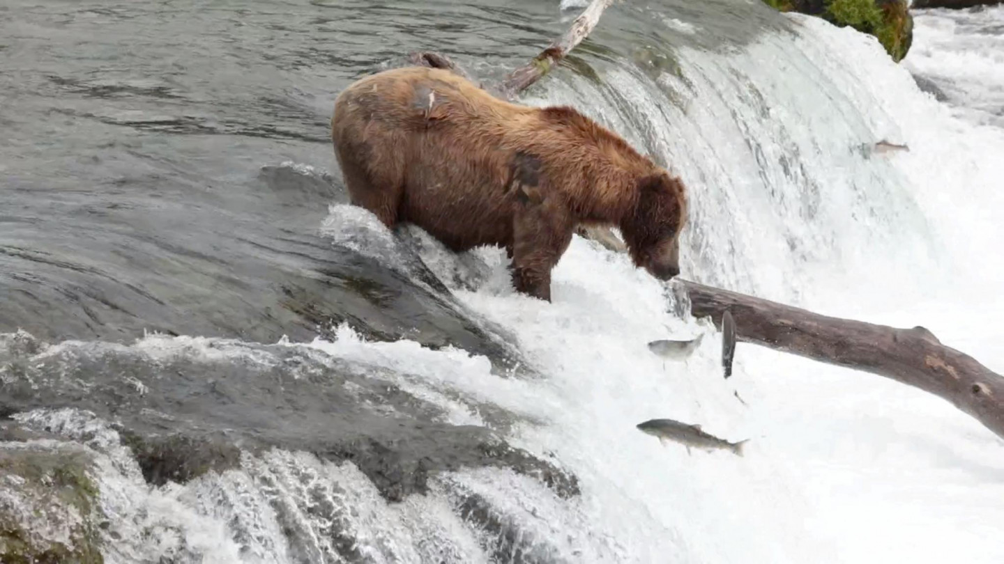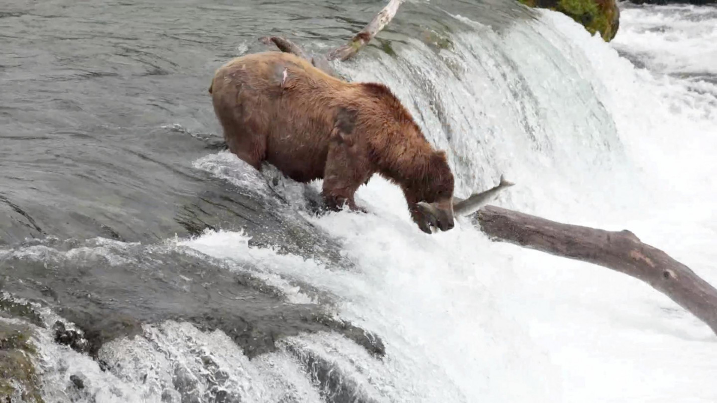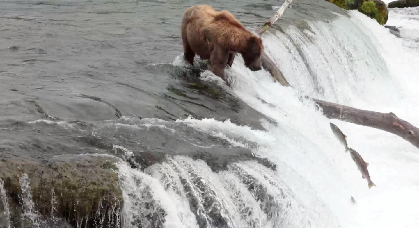 Aļaskā izdevies iemūžīnāt, kā brūnais lācis noķer peldošu lasi!