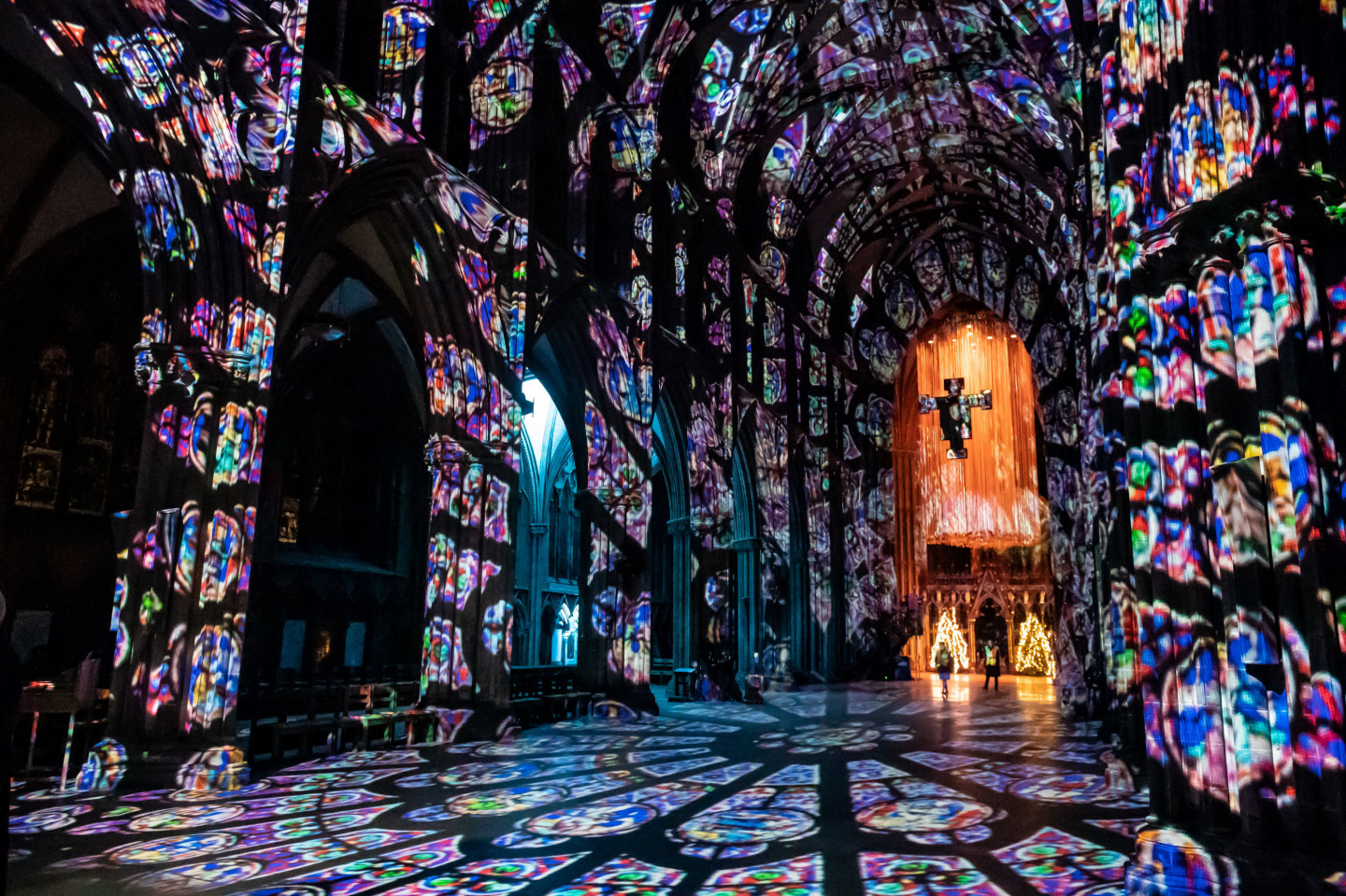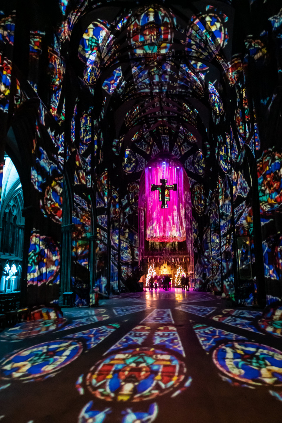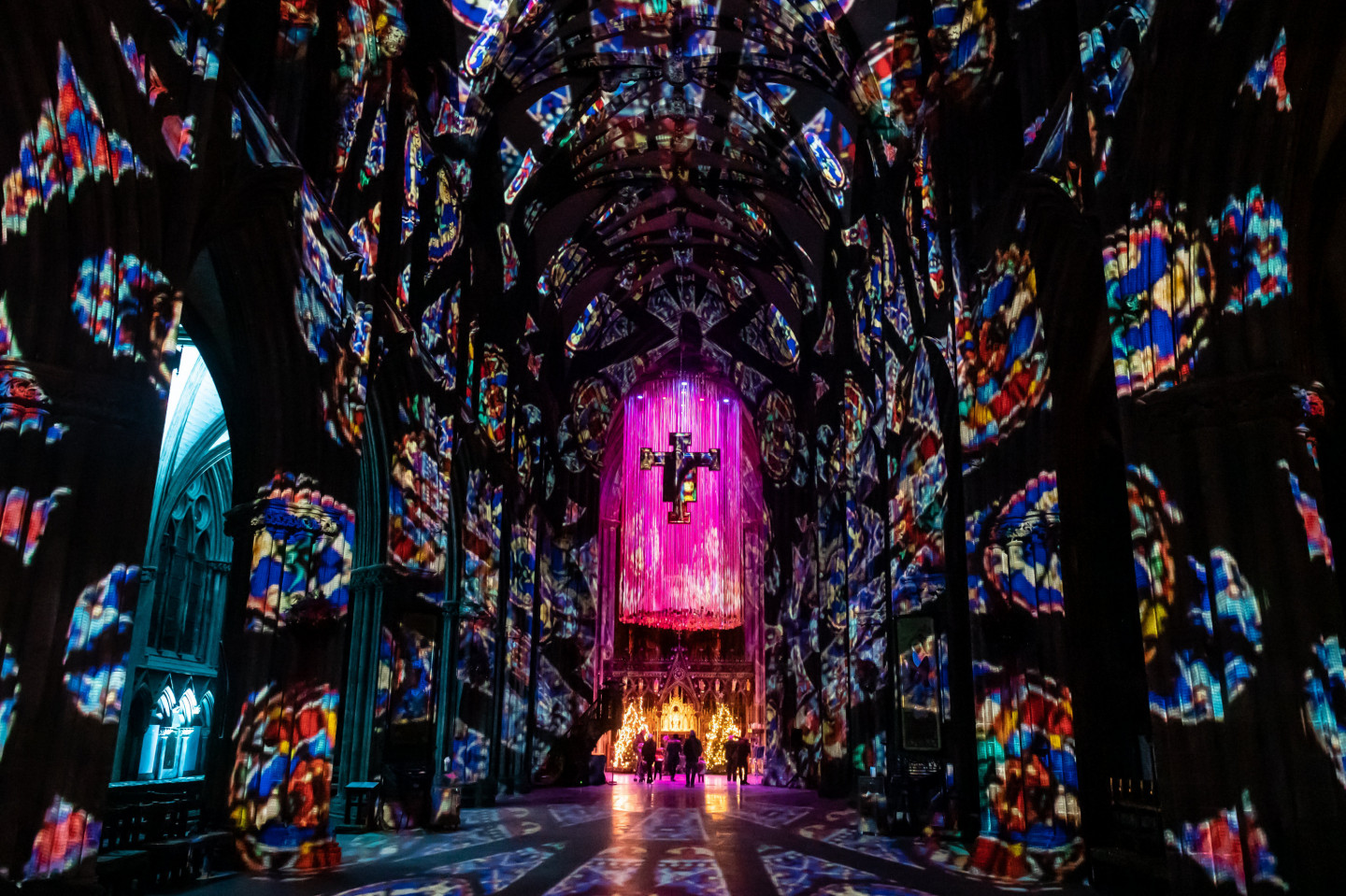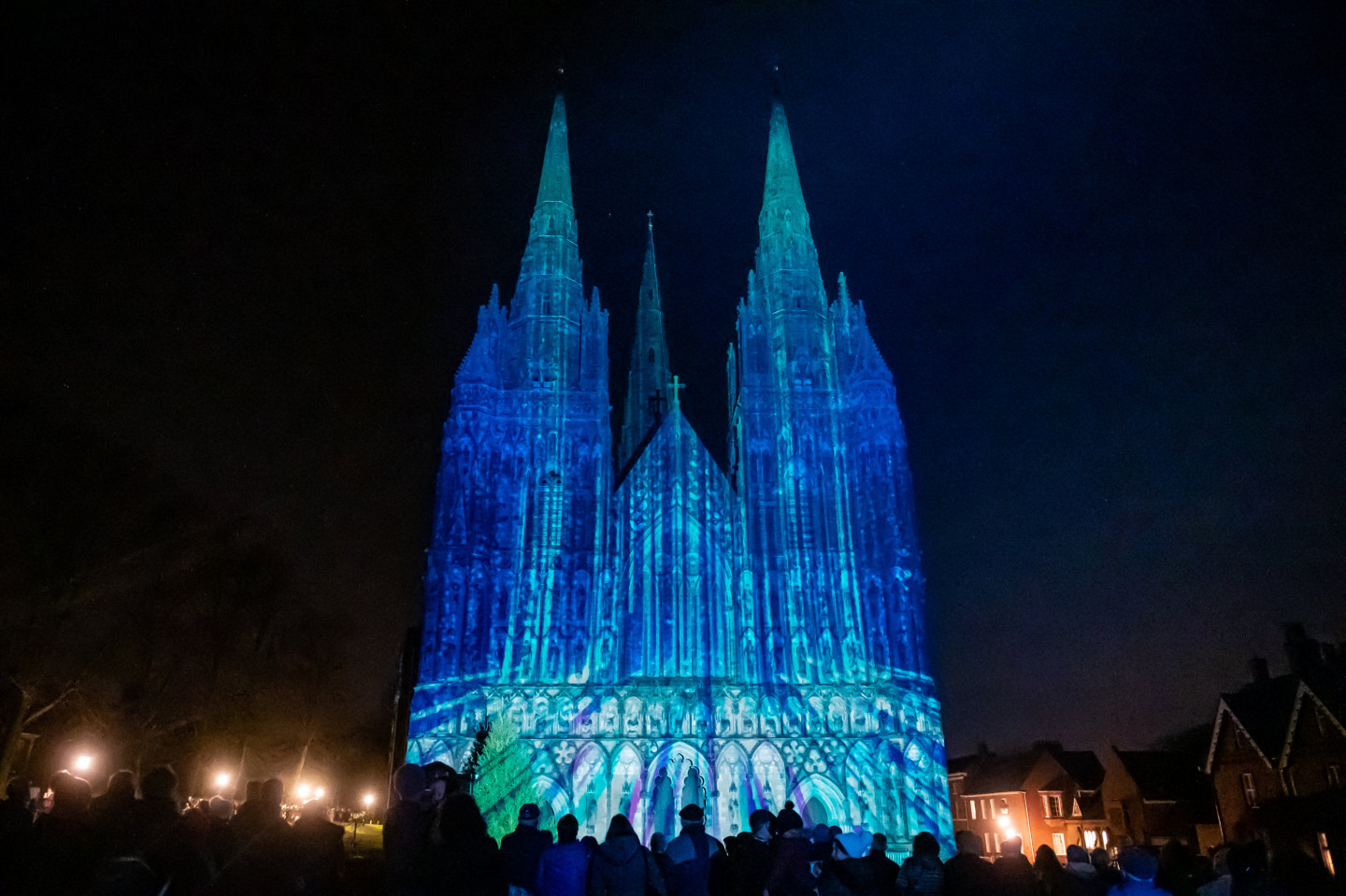 Svētkos krāšņi izgaismota viduslaiku katedrāle Lielbritānija