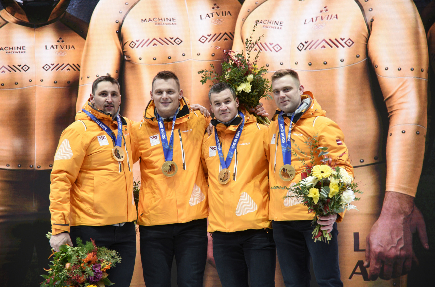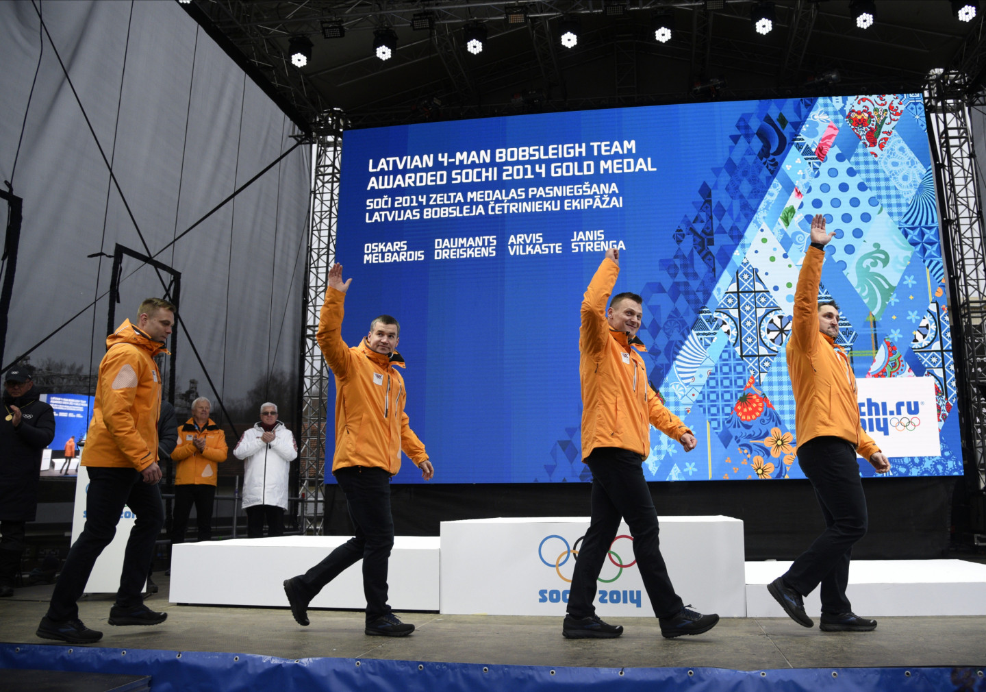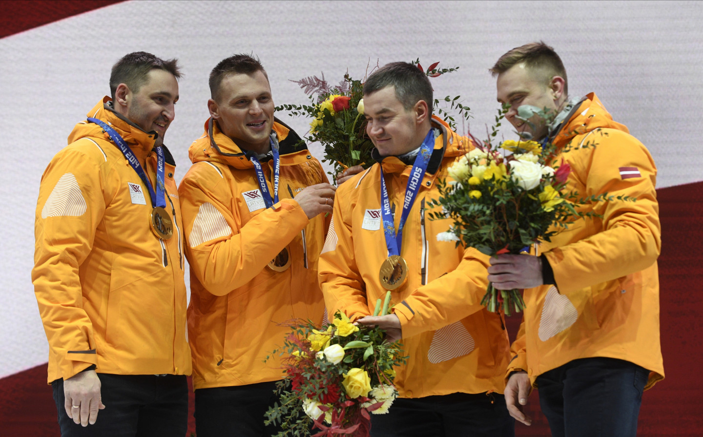 Latvijas bobsleja pilots Oskars Melbārdis ar stūmējiem Daumantu Dreiškenu, Arvi Vilkasti un Jāni Strengu sestdien Siguldā svinīgā ceremonijā saņēma 2014.gada Soču olimpisko spēļu zelta medaļas četriniekiem, bet Melbārdis ar Dreiškenu kaklā kāra arī bronzas godalgas divniekiem.