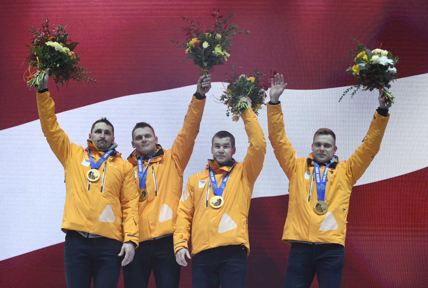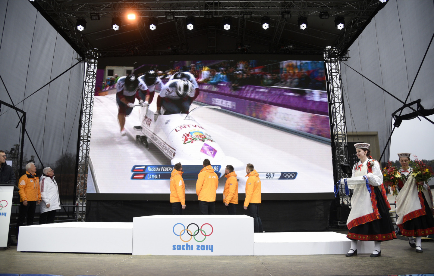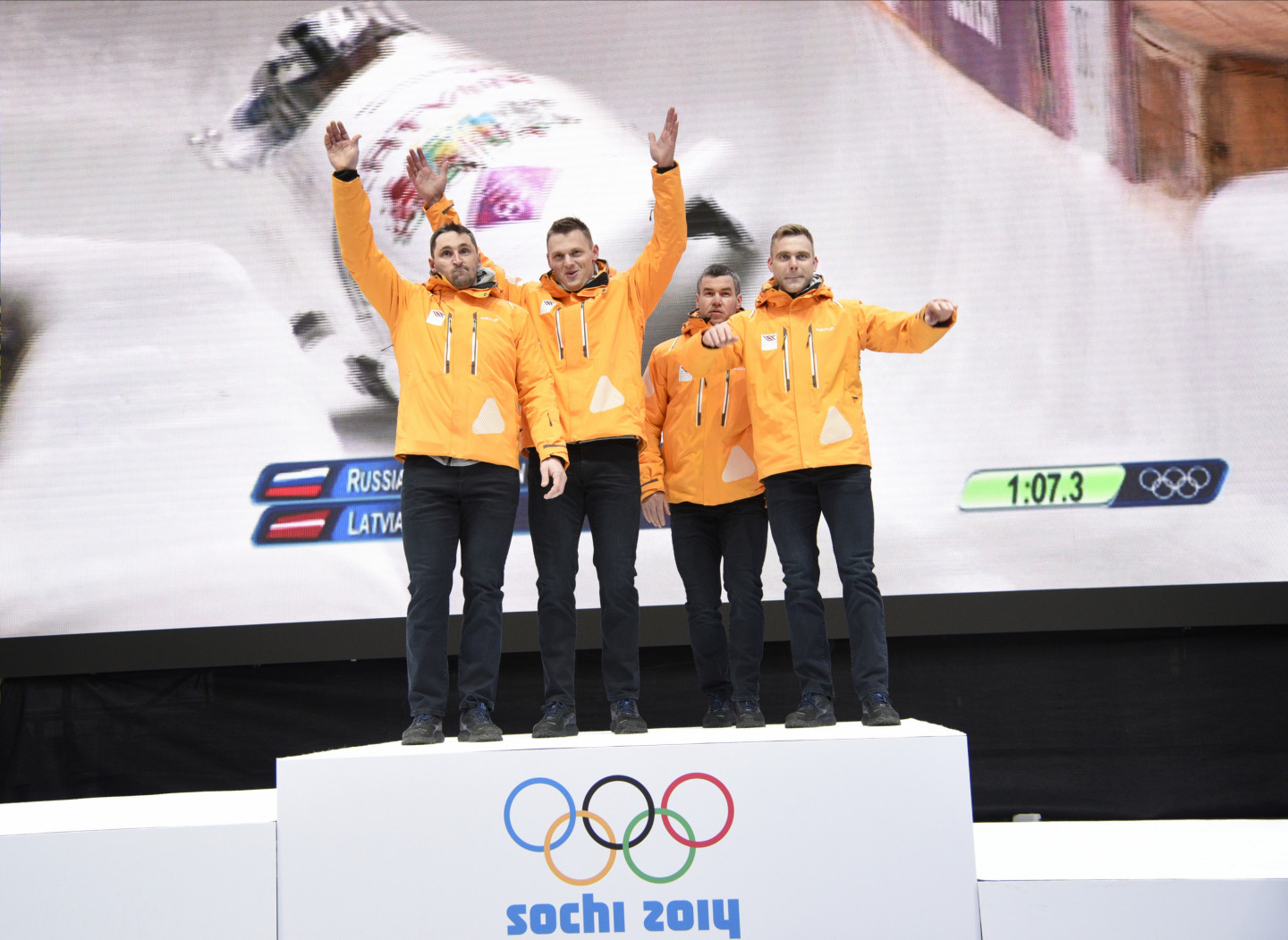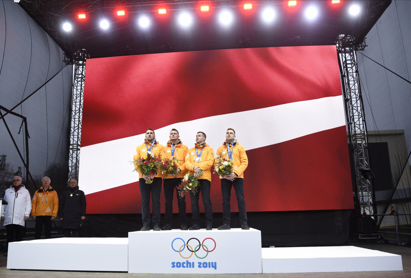 Latvijas bobsleja pilots Oskars Melbārdis ar stūmējiem Daumantu Dreiškenu, Arvi Vilkasti un Jāni Strengu sestdien Siguldā svinīgā ceremonijā saņēma 2014.gada Soču olimpisko spēļu zelta medaļas četriniekiem, bet Melbārdis ar Dreiškenu kaklā kāra arī bronzas godalgas divniekiem.
