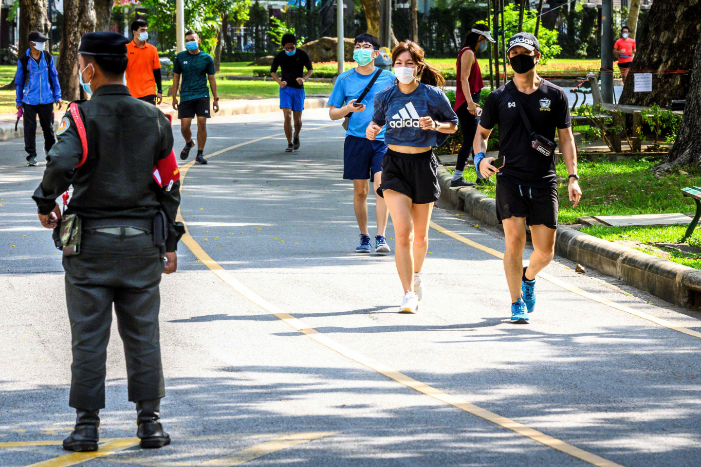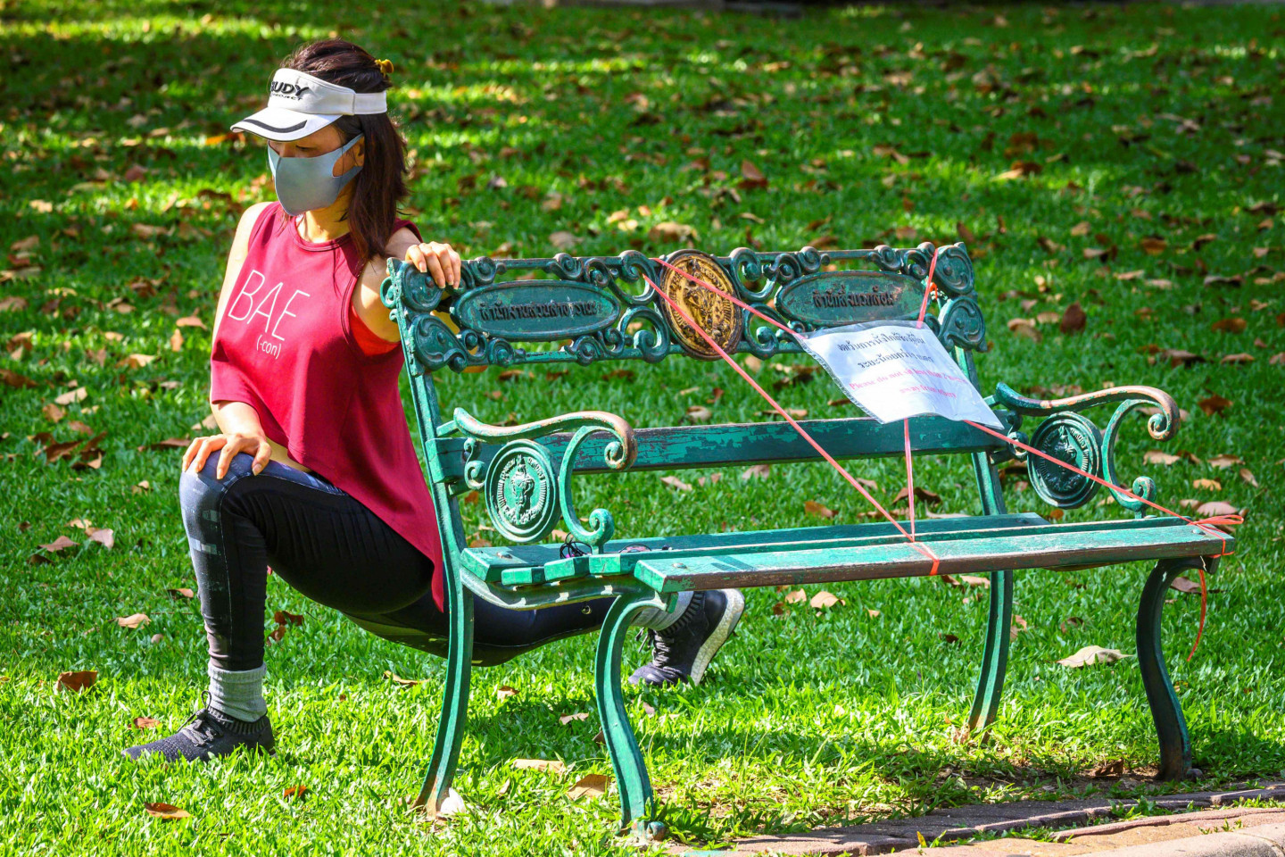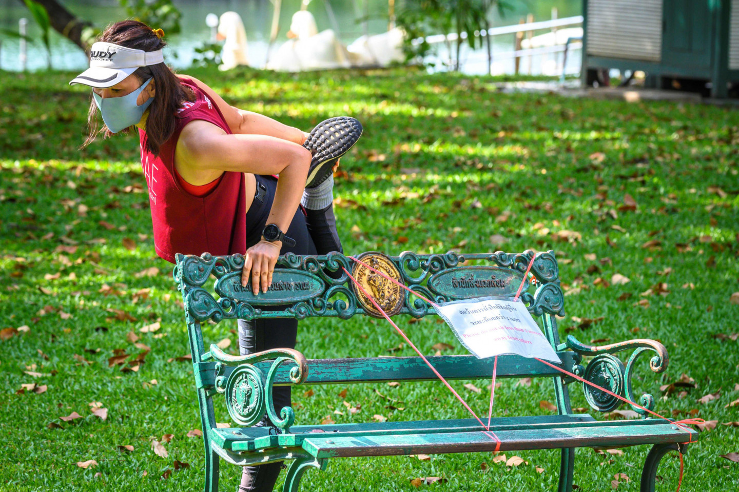 No šodienas Taizemē ieviesti Covid-19 ierobežojumu mīkstinājumi, kas atļauj vairākiem uzņēmumiem atsākt darbu. Taču valdība brīdinājusi, ka tiks pieņemti daudz striktāki mēri, ja būs vērojams jauns vīrusa uzliesmojums. Foto uzņemti Lumpini parkā pēc ierobežojumu mīkstināšanas.