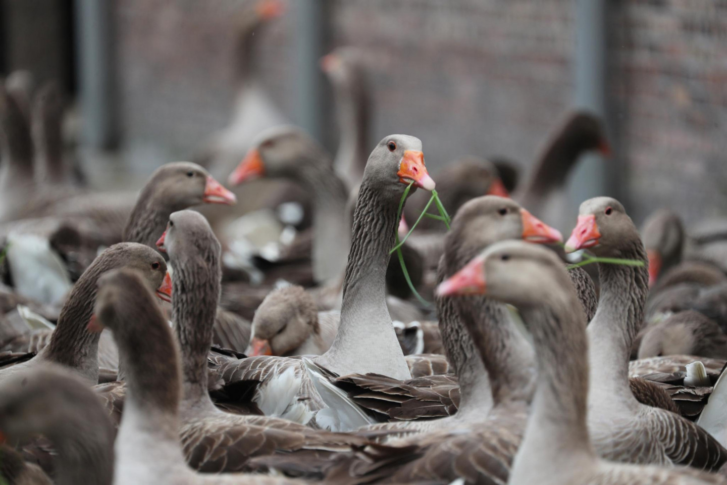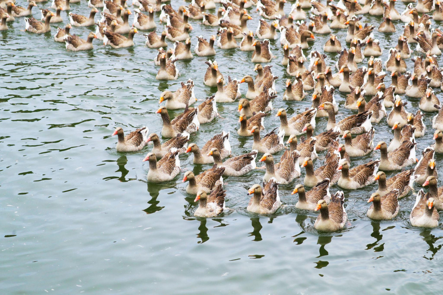 Fermera Ķīnā prāvais zosu ganāmpulks ekoloģiskajā saimniecībā.