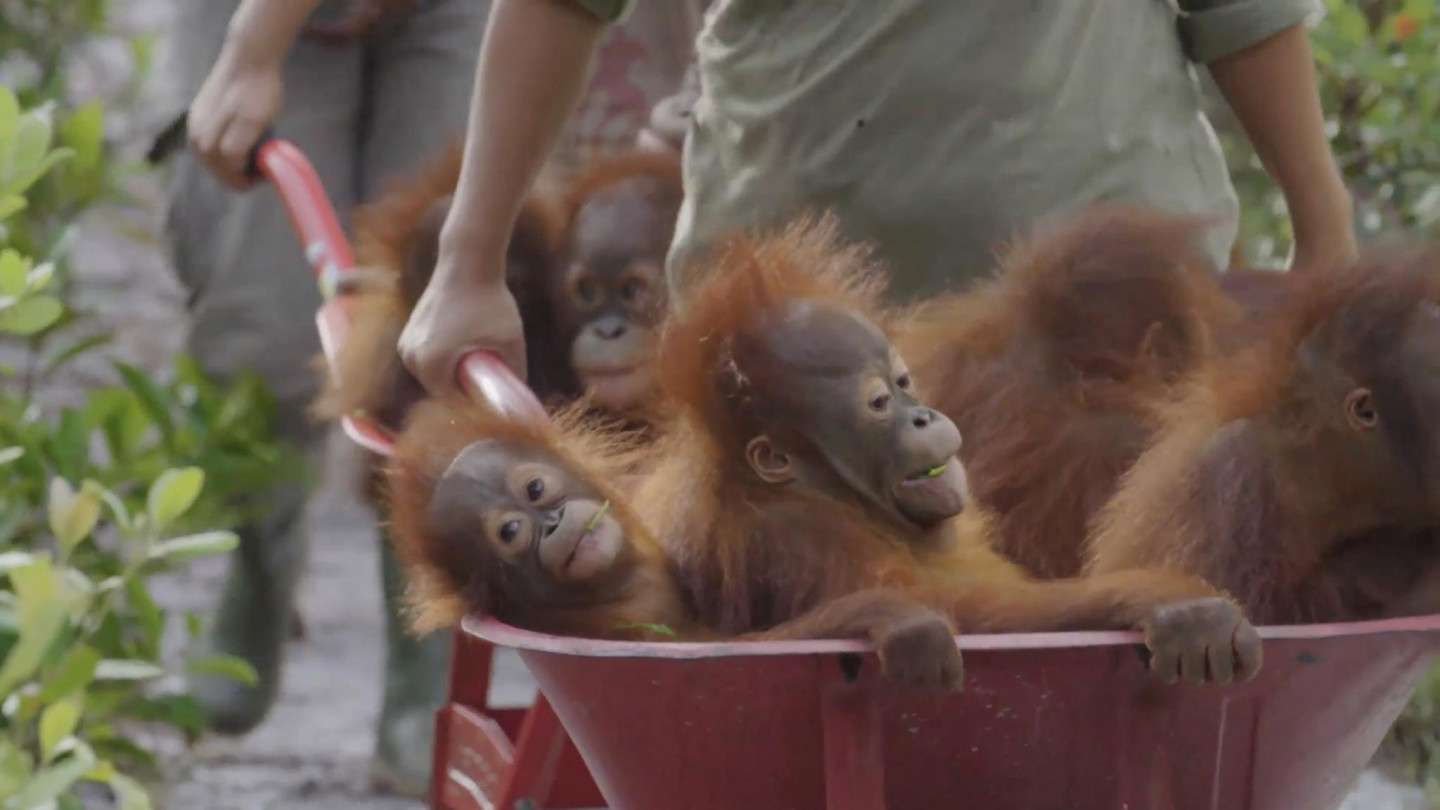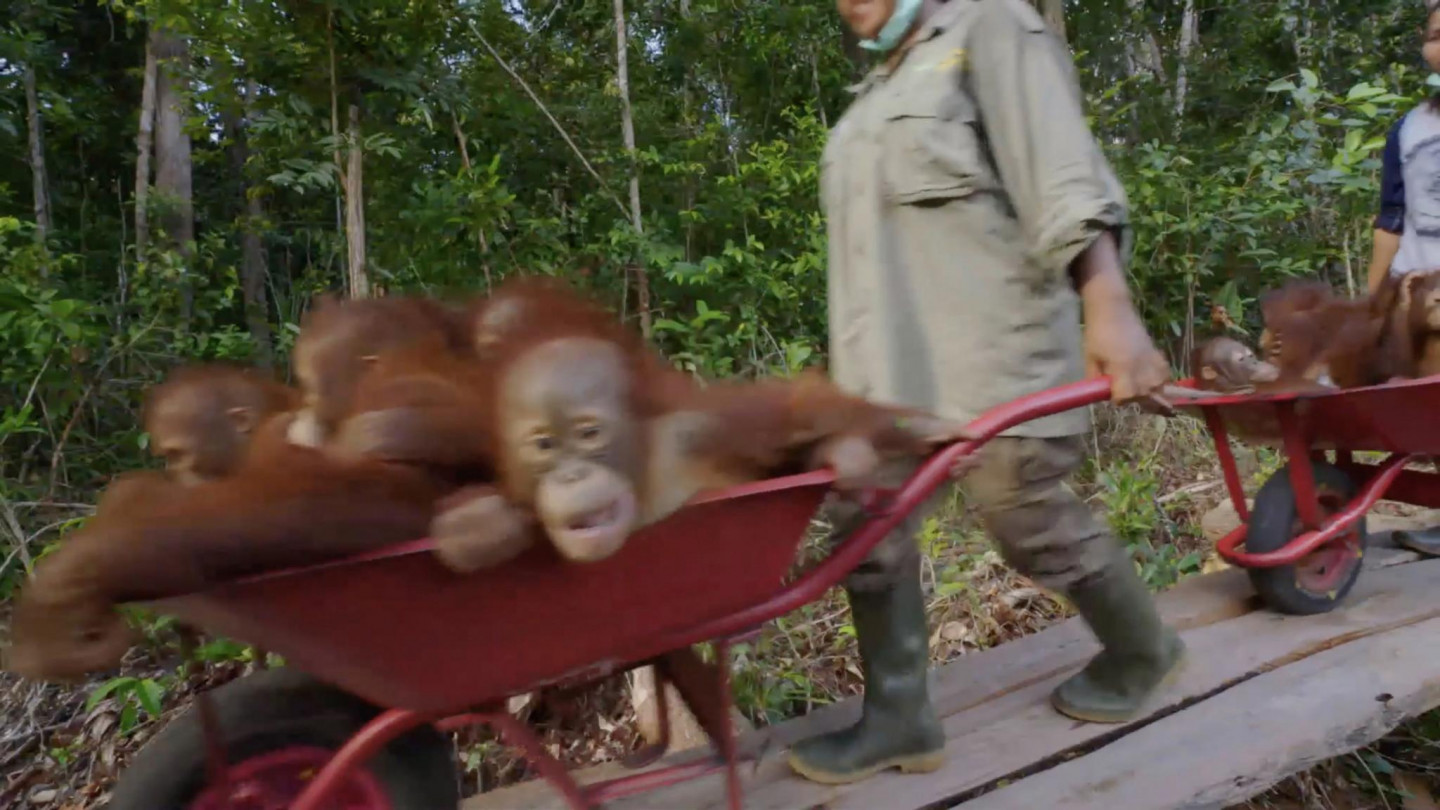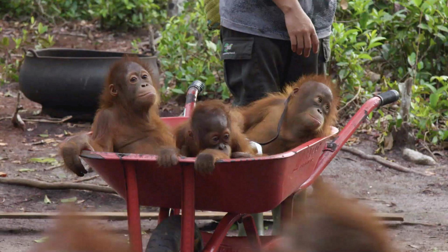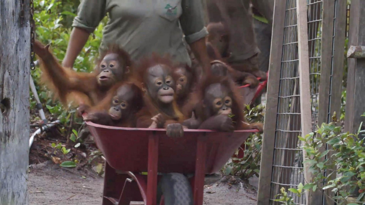 Indonēzijā meža ugunsgrēkos izglābtos orangutanu mazuļus nogādā "meža skolā", kur tie būs kopā ar citiem orangutaniem pirms tos palaidīs brīvībā.