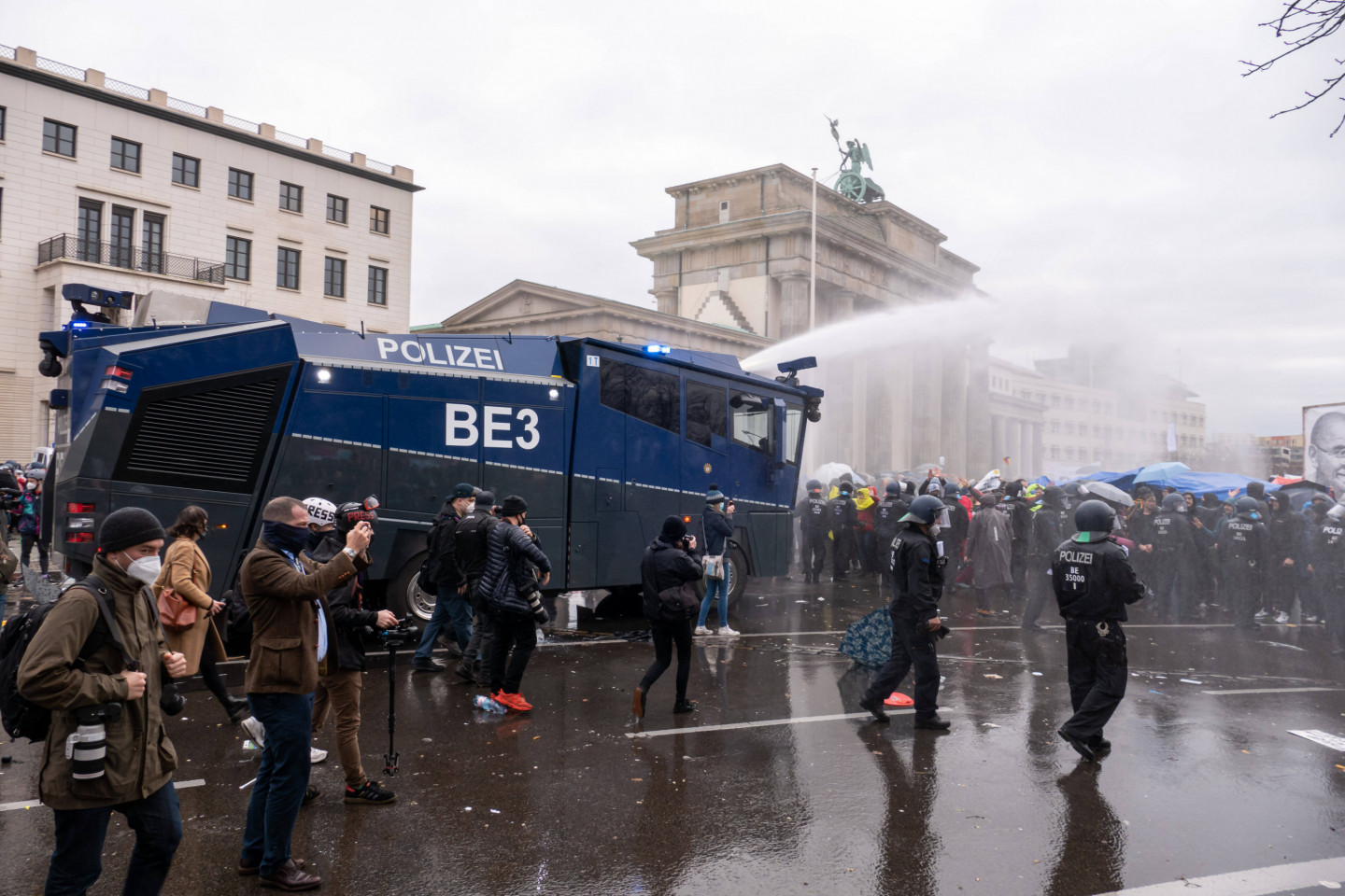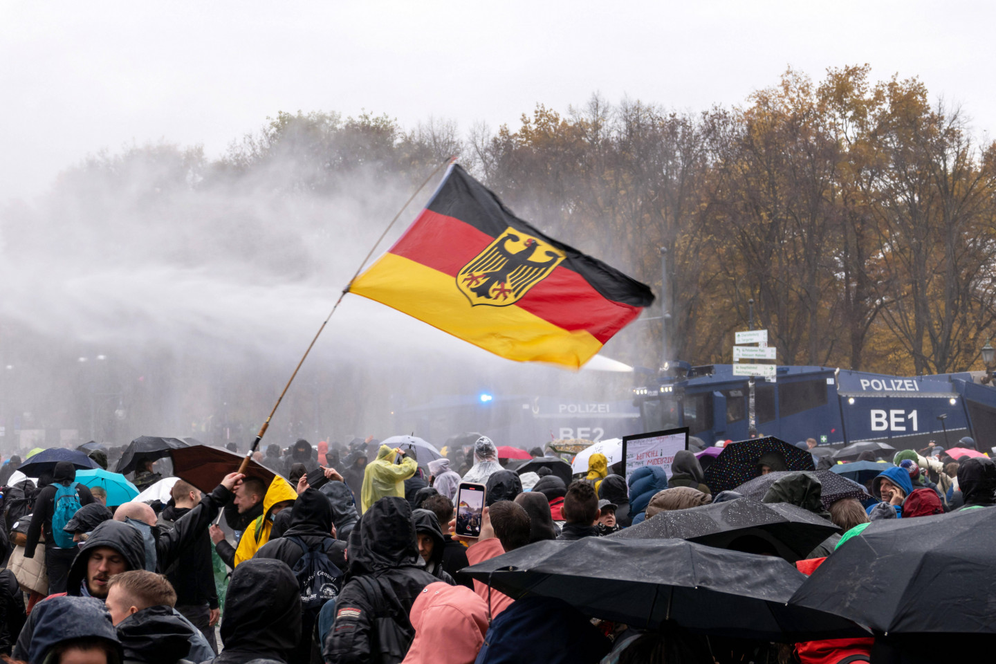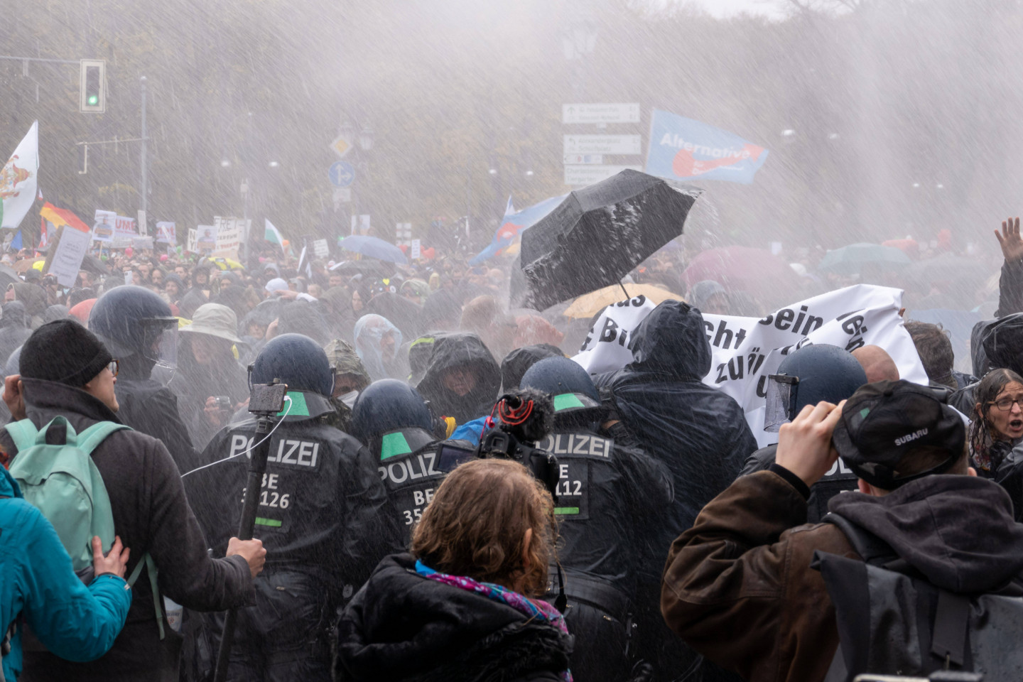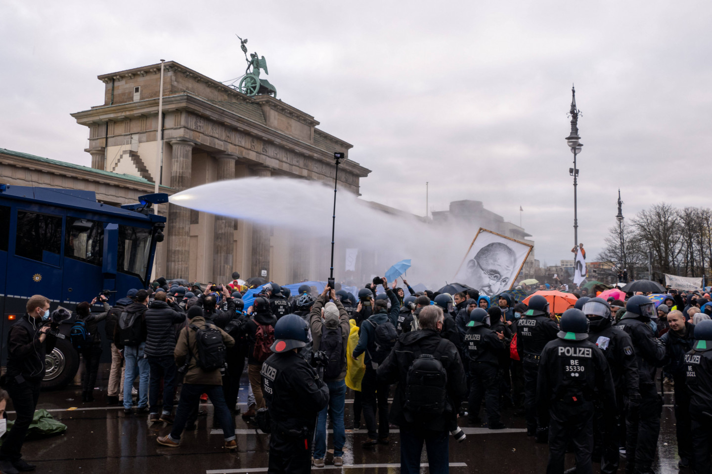 Vācijas policija trešdien Berlīnes centrā lika lietā ūdens lielgabalus un piparu gāzi, lai izklīdinātu tūkstošiem demonstrantu, kas protestēja pret Covid-19 krīzes dēļ ieviestajiem valdības ierobežojumiem. Demonstrācijā pie Reihstāga, Brandenburgas vārtiem un Tīrgartena Uzvaras kolonnas bija sapulcējušies aptuveni 7000 protestētāju, bet kārtības nodrošināšanā bija iesaistīti 2400 policistu. Protestu gaitā aizturēti 365 cilvēki, pavēstīja likumsargi. Bažījoties par vardarbības izraisīšanos, valdība protestu parlamenta ēkas apkaimē aizliegusi. Pēc tam kad policijas atkārtotie mudinājumi apvilkt sejas maskas bija palikuši bez ievērības, likumsargiem vajadzēja vairākas stundas, lai protesta akcijas dalībniekus izklīdinātu. Protestētāji policistus apmētāja ar pudelēm, akmeņiem un pirotehniku, kā arī uzbruka ar piparu gāzi, kas izraisīja to to, ka policisti "pielieto fizisku spēku un piparu gāzi, un aiztur dažus uzbrucējus". Berlīnes akcijas organizētāji apsūdz valdību, ka tā ar karantīnas režīma prasībām cenšas izveidot diktatūru.