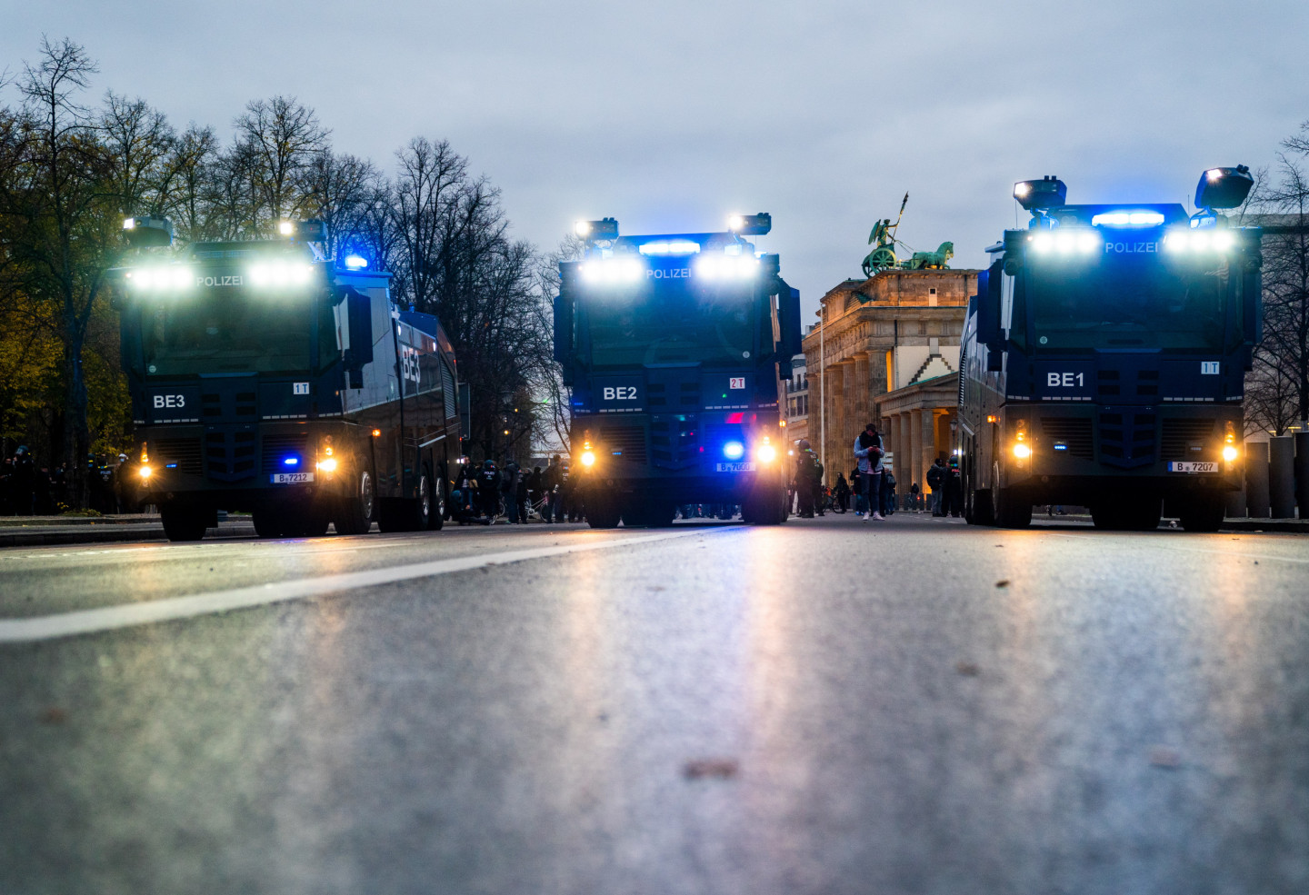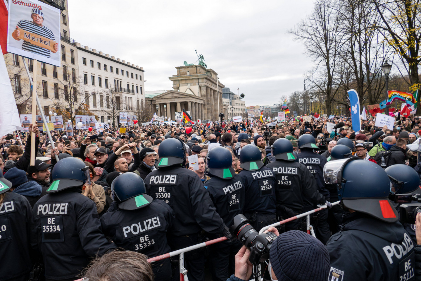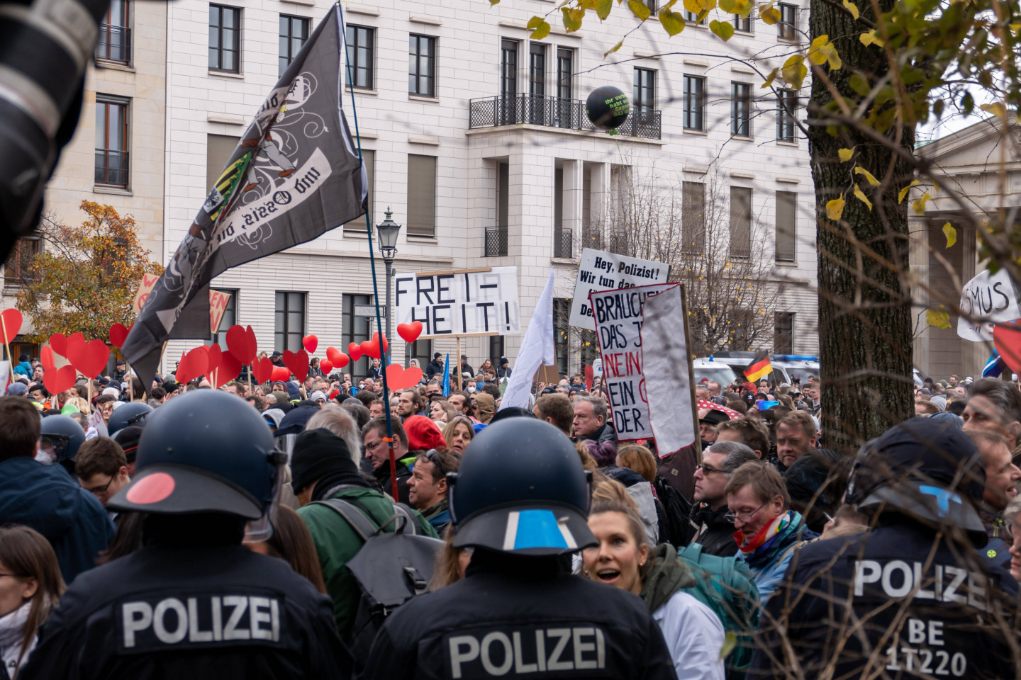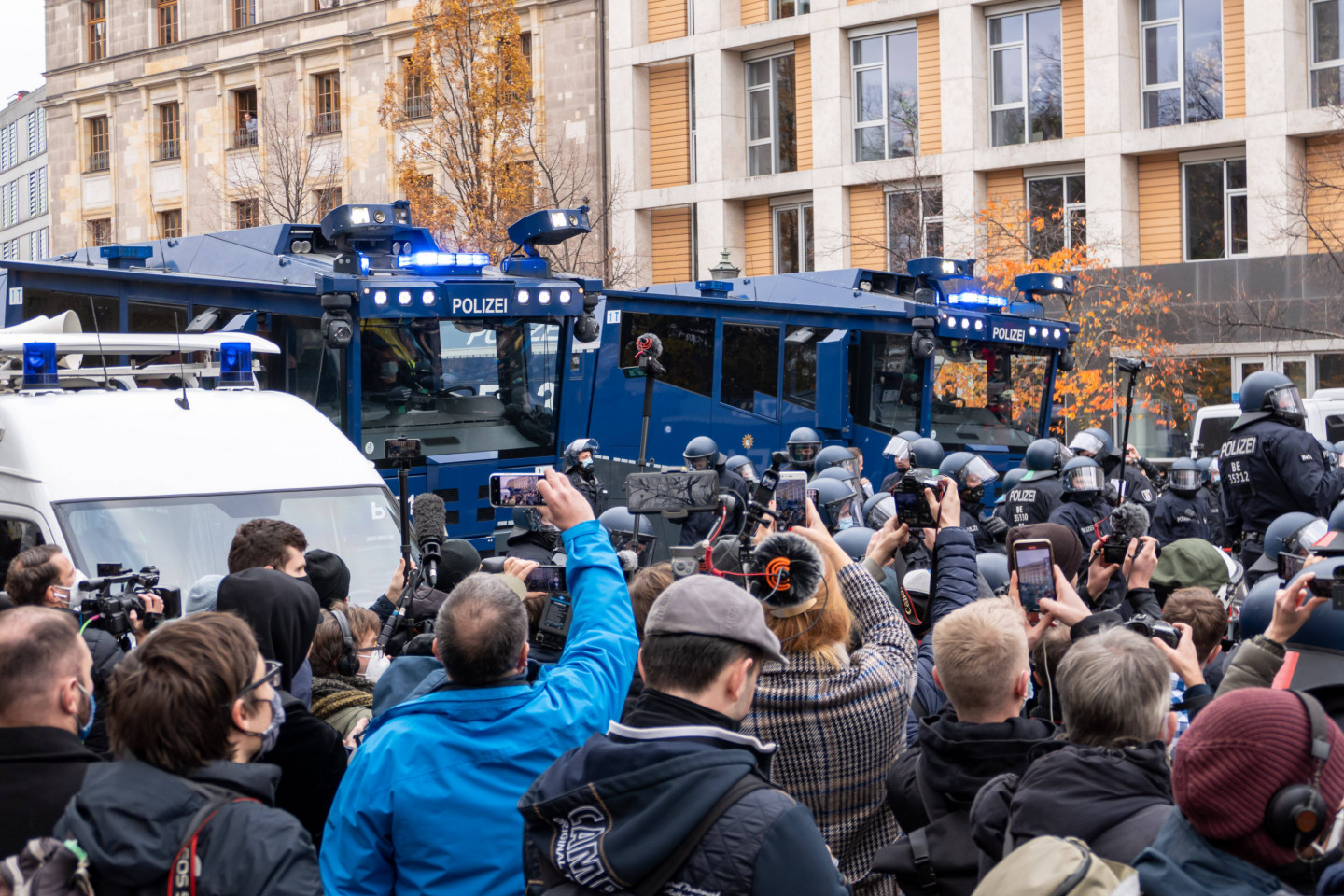 Vācijas policija trešdien Berlīnes centrā lika lietā ūdens lielgabalus un piparu gāzi, lai izklīdinātu tūkstošiem demonstrantu, kas protestēja pret Covid-19 krīzes dēļ ieviestajiem valdības ierobežojumiem. Demonstrācijā pie Reihstāga, Brandenburgas vārtiem un Tīrgartena Uzvaras kolonnas bija sapulcējušies aptuveni 7000 protestētāju, bet kārtības nodrošināšanā bija iesaistīti 2400 policistu. Protestu gaitā aizturēti 365 cilvēki, pavēstīja likumsargi. Bažījoties par vardarbības izraisīšanos, valdība protestu parlamenta ēkas apkaimē aizliegusi. Pēc tam kad policijas atkārtotie mudinājumi apvilkt sejas maskas bija palikuši bez ievērības, likumsargiem vajadzēja vairākas stundas, lai protesta akcijas dalībniekus izklīdinātu. Protestētāji policistus apmētāja ar pudelēm, akmeņiem un pirotehniku, kā arī uzbruka ar piparu gāzi, kas izraisīja to to, ka policisti "pielieto fizisku spēku un piparu gāzi, un aiztur dažus uzbrucējus". Berlīnes akcijas organizētāji apsūdz valdību, ka tā ar karantīnas režīma prasībām cenšas izveidot diktatūru.