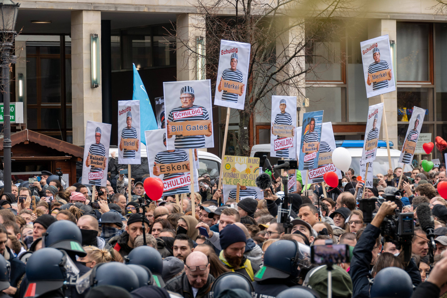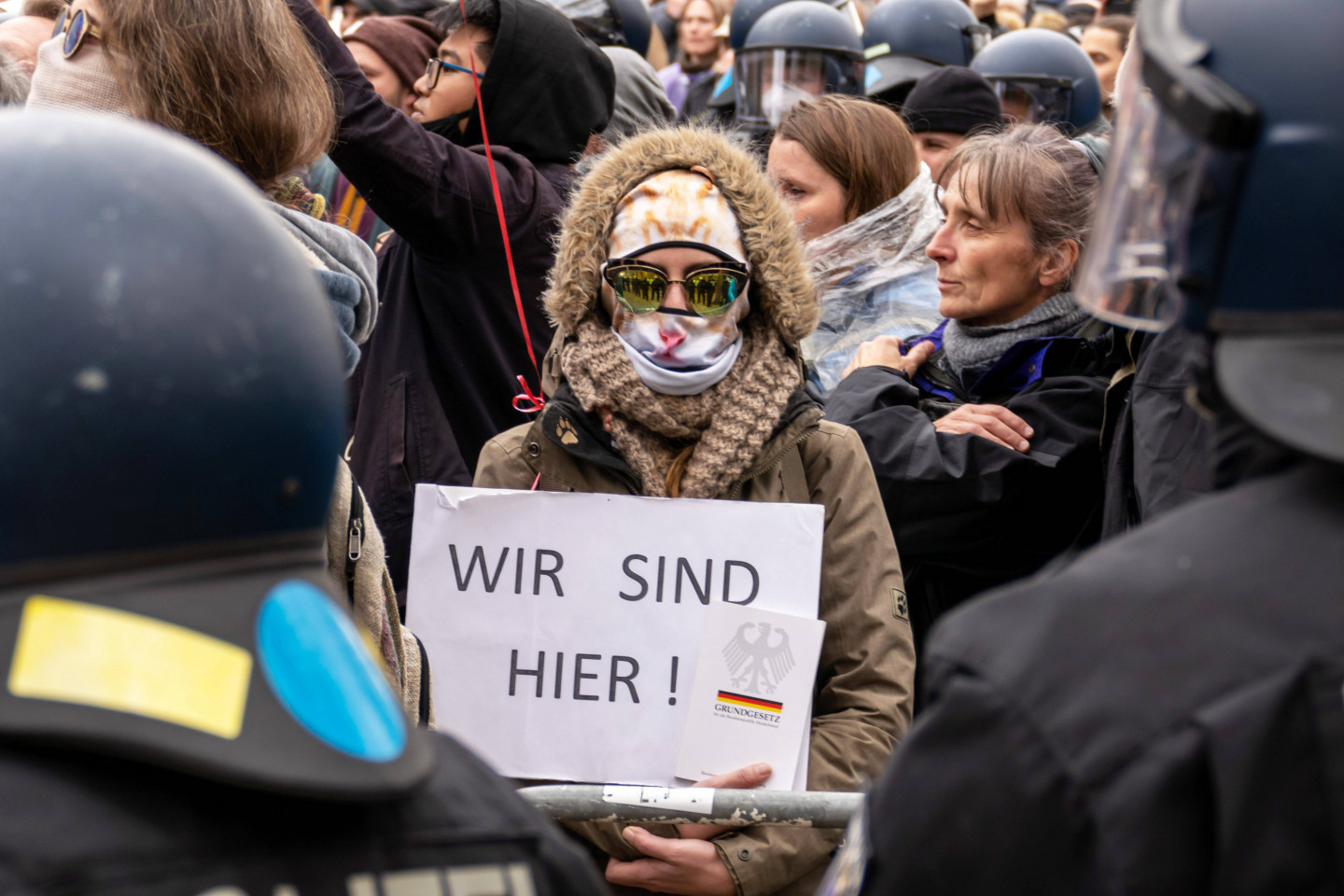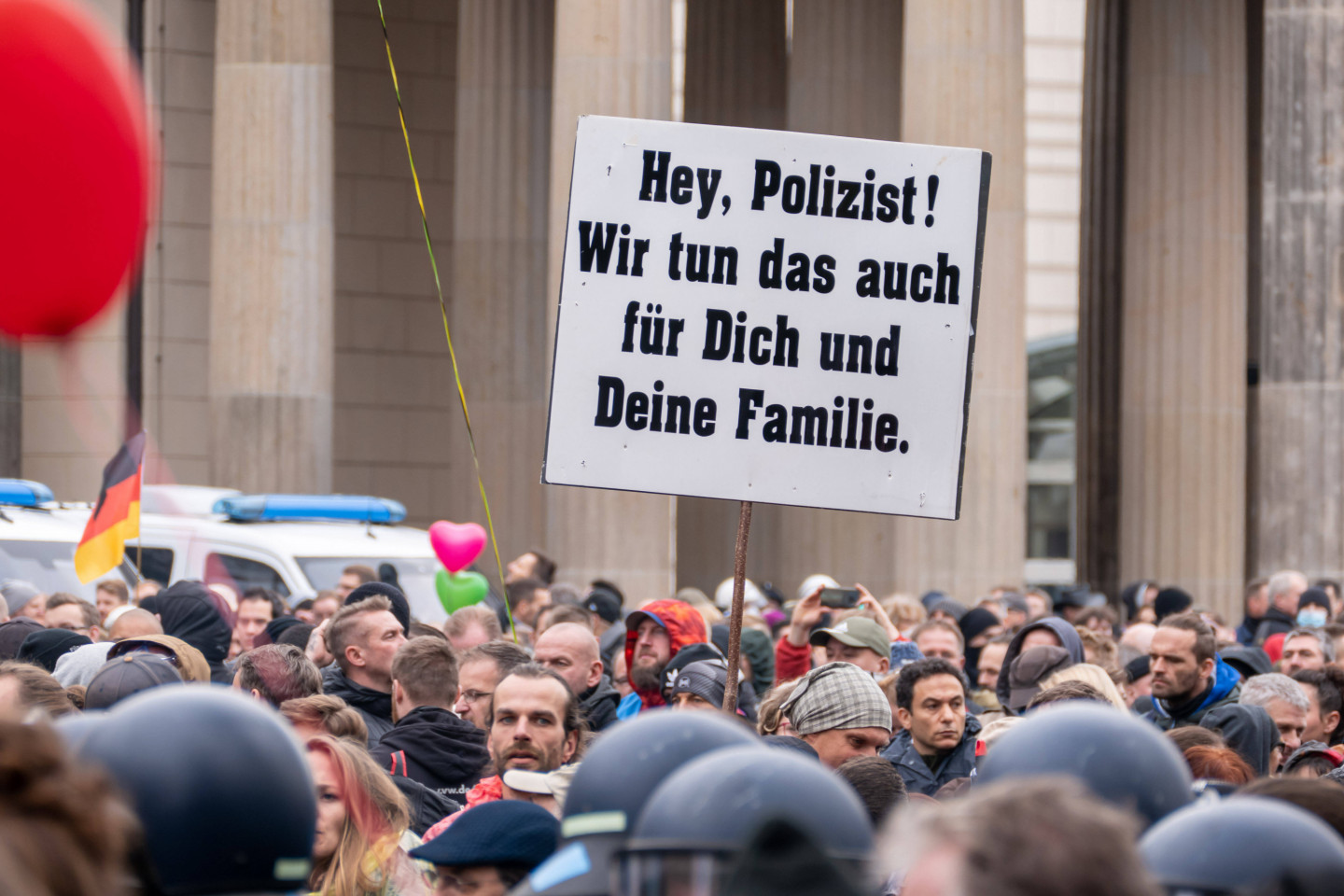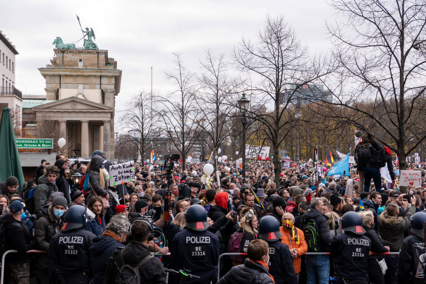Vācijas policija trešdien Berlīnes centrā lika lietā ūdens lielgabalus un piparu gāzi, lai izklīdinātu tūkstošiem demonstrantu, kas protestēja pret Covid-19 krīzes dēļ ieviestajiem valdības ierobežojumiem. Demonstrācijā pie Reihstāga, Brandenburgas vārtiem un Tīrgartena Uzvaras kolonnas bija sapulcējušies aptuveni 7000 protestētāju, bet kārtības nodrošināšanā bija iesaistīti 2400 policistu. Protestu gaitā aizturēti 365 cilvēki, pavēstīja likumsargi. Bažījoties par vardarbības izraisīšanos, valdība protestu parlamenta ēkas apkaimē aizliegusi. Pēc tam kad policijas atkārtotie mudinājumi apvilkt sejas maskas bija palikuši bez ievērības, likumsargiem vajadzēja vairākas stundas, lai protesta akcijas dalībniekus izklīdinātu. Protestētāji policistus apmētāja ar pudelēm, akmeņiem un pirotehniku, kā arī uzbruka ar piparu gāzi, kas izraisīja to to, ka policisti "pielieto fizisku spēku un piparu gāzi, un aiztur dažus uzbrucējus". Berlīnes akcijas organizētāji apsūdz valdību, ka tā ar karantīnas režīma prasībām cenšas izveidot diktatūru.