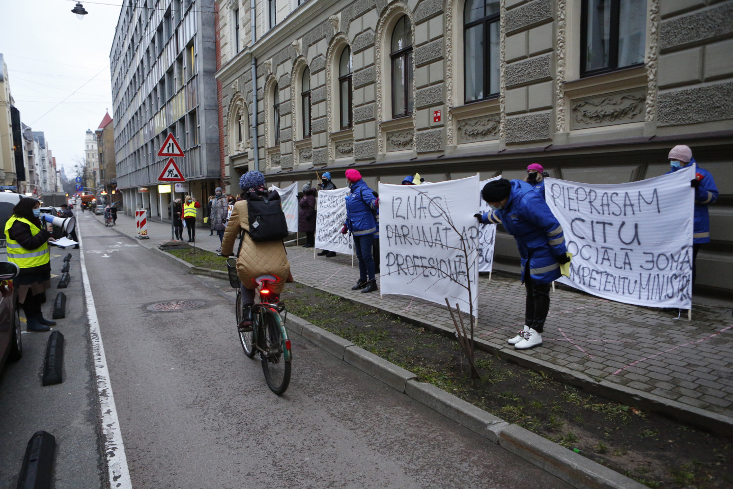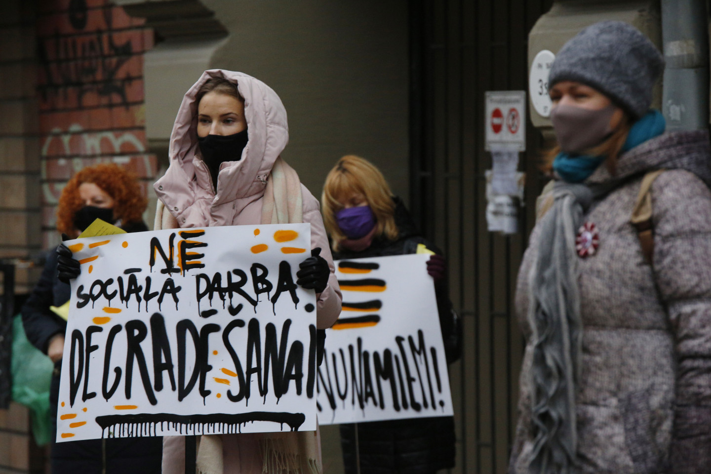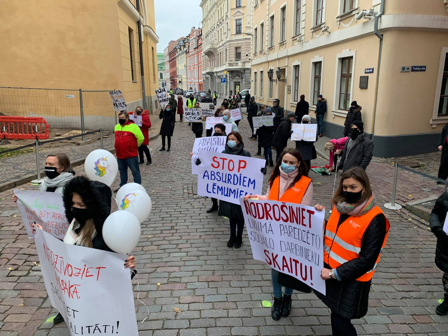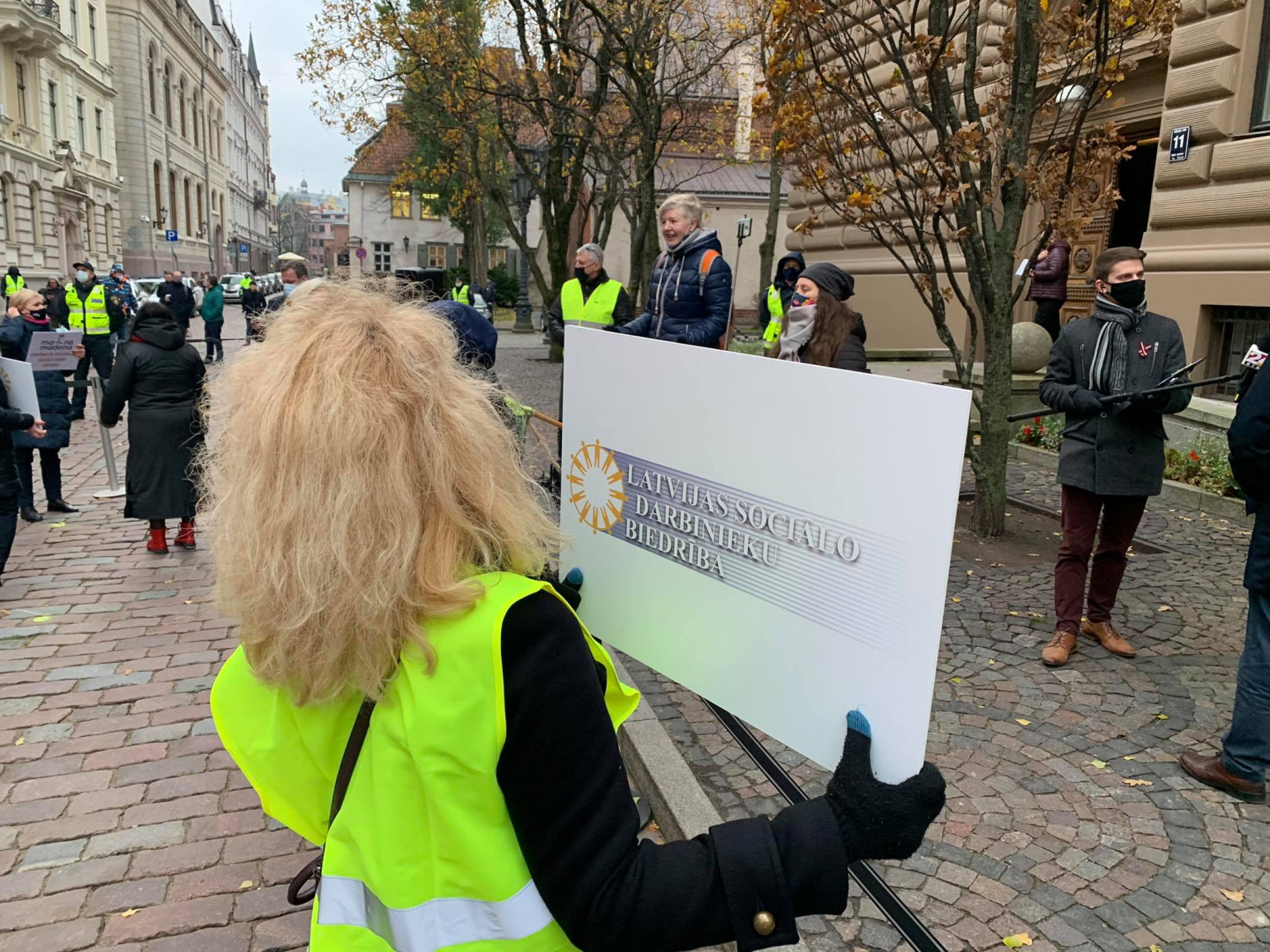 Pie Labklājības ministrijas (LM) šorīt ir sapulcējušies aptuveni 30 cilvēki, tajā skaitā sociālie darbinieki no Latvijas reģioniem, novēroja aģentūra LETA. Visiem protesta dalībniekiem ir sejas aizsargmaskas. Cilvēkiem rokās ir plakāti "Sociālie darbinieki, uzticība, palīdzība citiem". Sociālie darbinieki valdībai pieprasa nodrošināt konkurētspējīgāku atalgojumu, jo patlaban zemā atalgojuma dēļ nozarē trūkst ļoti daudz darbinieku. Lai arī ir panākta vienošanās, ka sociālajiem darbiniekiem nevajadzēs izvērtēt personu ienākumus, viņi joprojām ļoti kritiski izsakās par Finanšu ministrijas (FM) un LM iniciatīvu uzlikt pašvaldību sociālajiem dienestiem funkciju - vērtēt pašnodarbināto un mikrouzņēmuma nodokļa maksājumu atbilstību trūcīgas personas statusam vai sniegt apliecinājumu, ka viņa ienākumi ir nepietiekami, lai viņi varētu saņemt iespēju nemaksāt minimālās obligātās sociālās apdrošināšanas iemaksas. Kā uzsver rīkotāji, sapulces dalībnieki iestājas par jaunu sociālo pakalpojumu vienmērīgu attīstīšanu visā Latvijā, par tādu Bērnu tiesību aizsardzības sistēmas reformu, kurā bērns būtu ieguvējs, par investīcijām sociālo darbinieku jomas cilvēkresursu kapacitātes stiprināšanā un citiem.