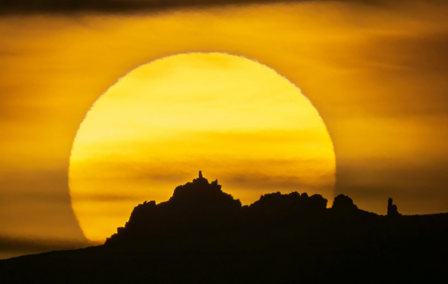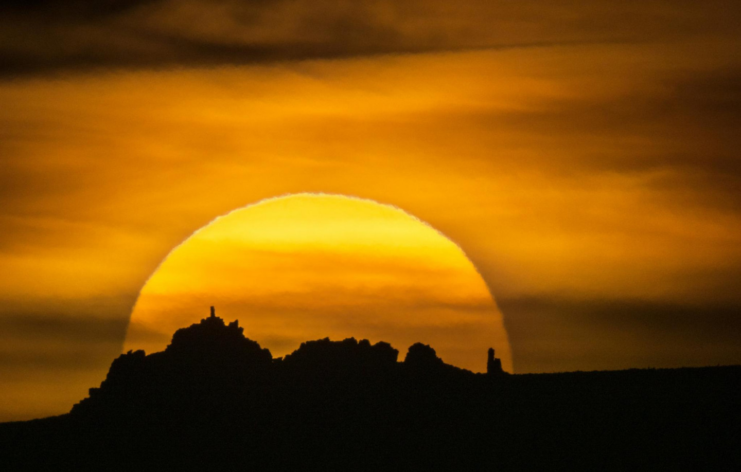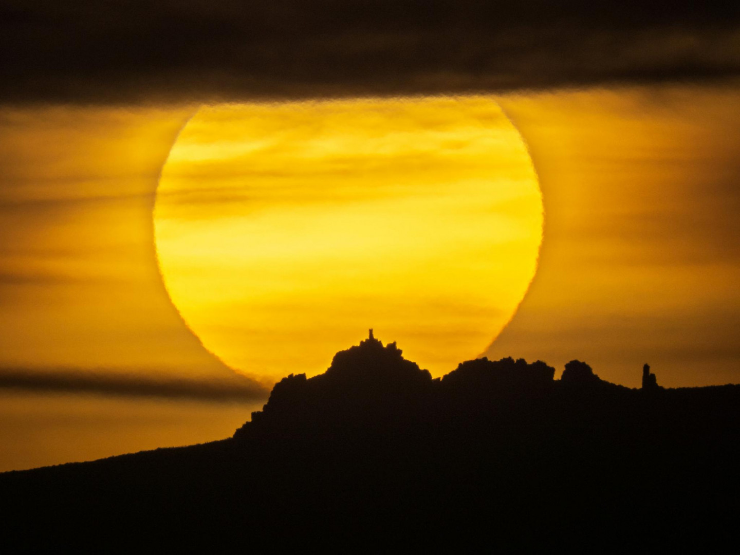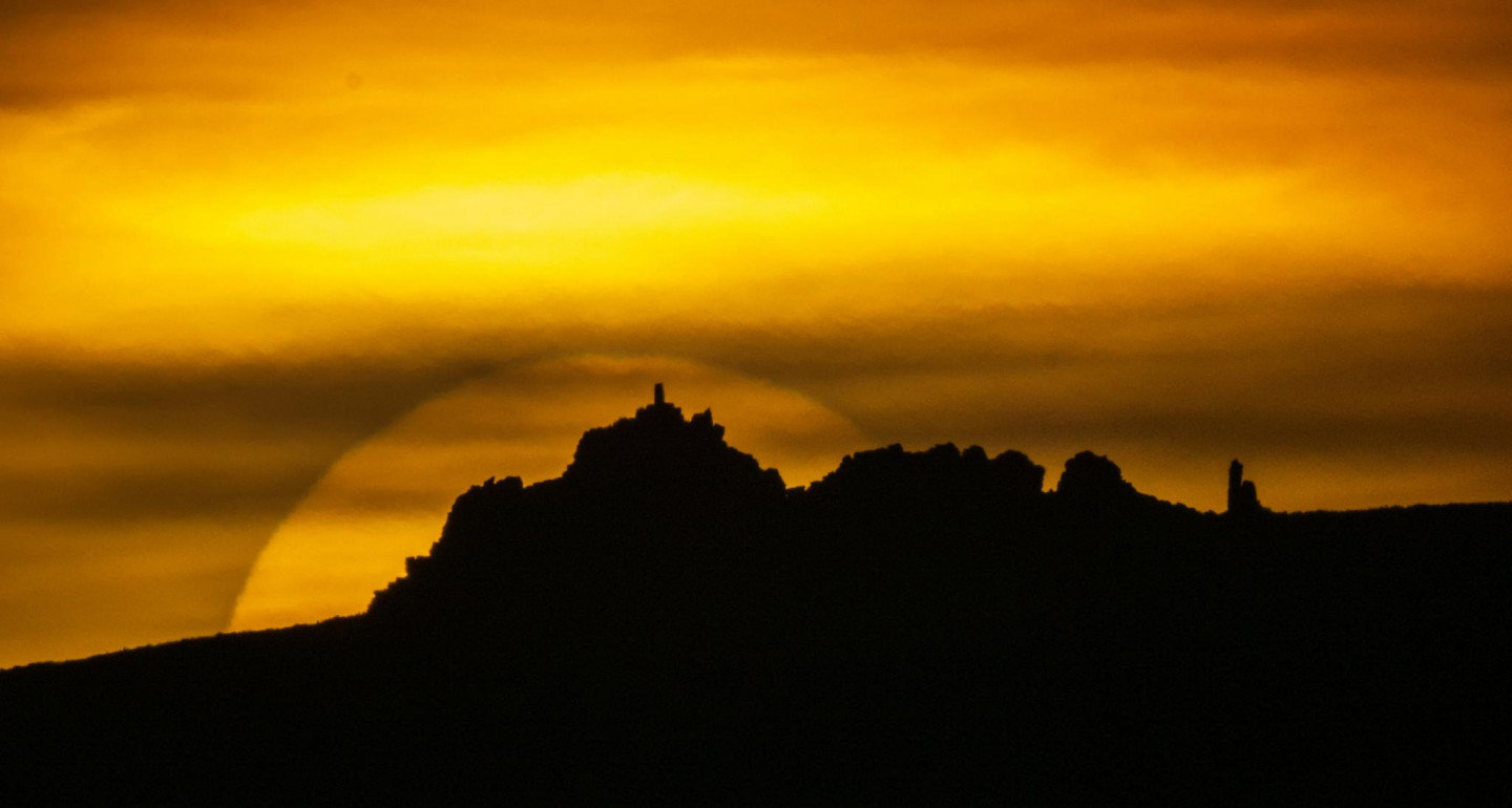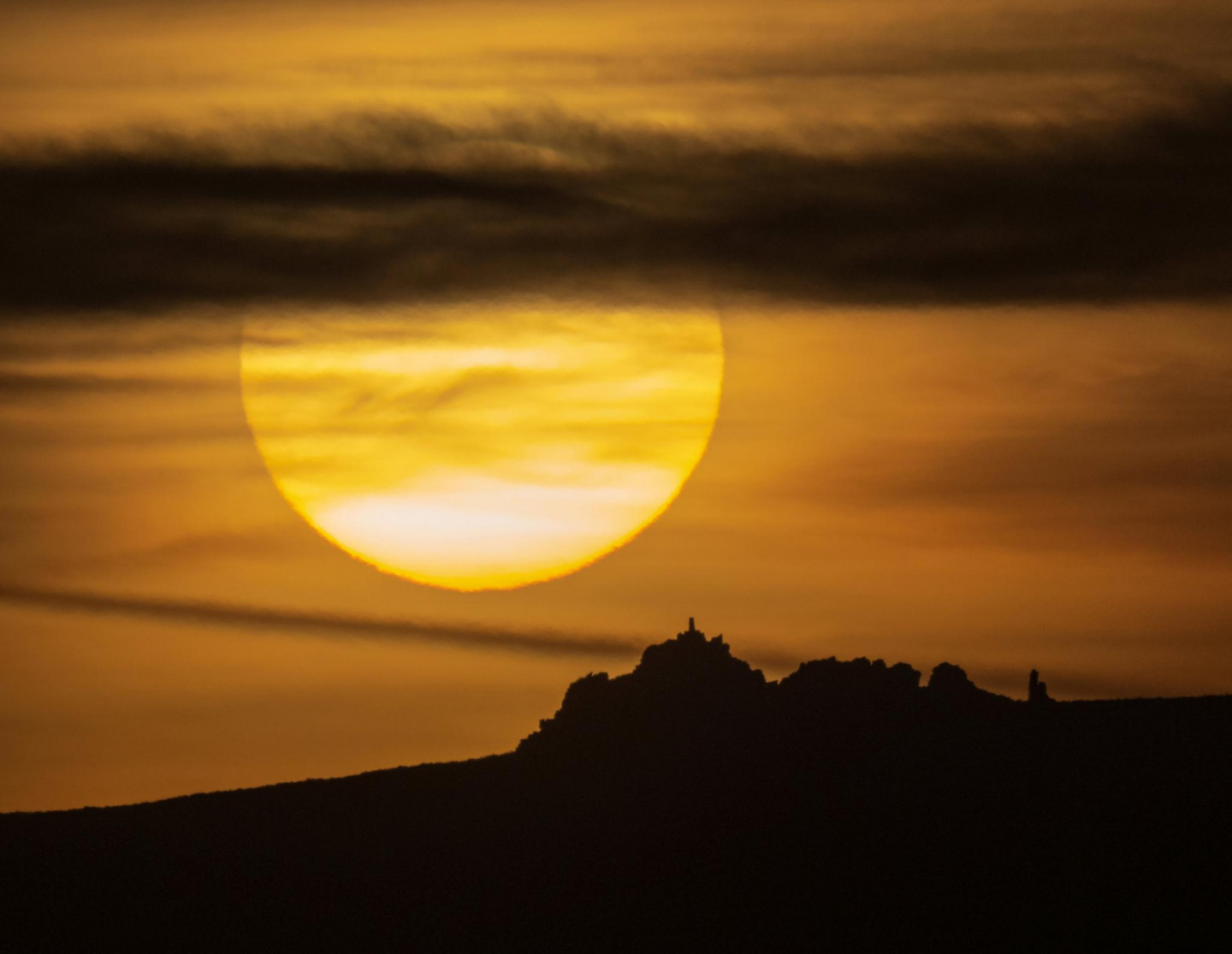 Apbrīnojams saulriets virs Manstounas klints Stiperstones dabas rezervātā, Šropšīrā, Lielbritānijā.