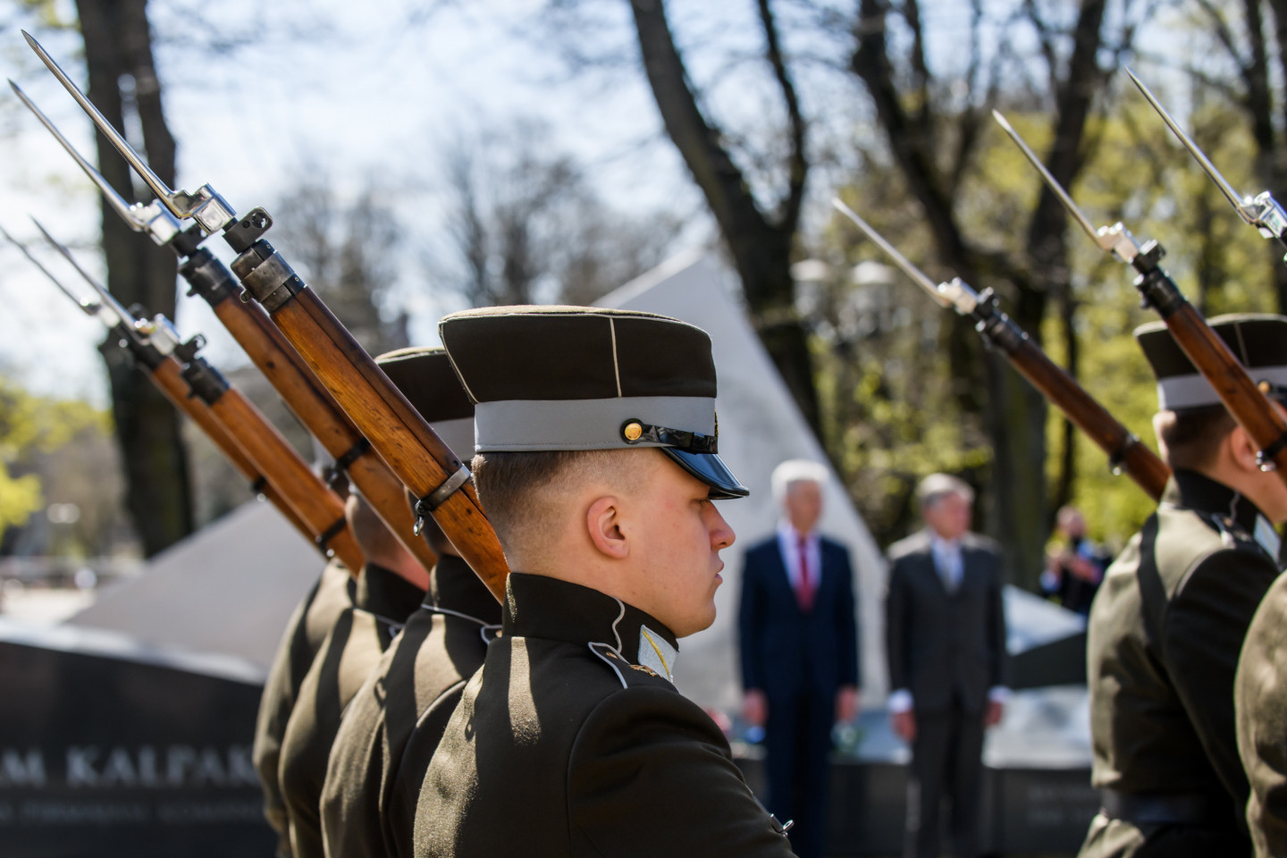 02.05.2022. Fransuā Bošs (Francois Bausch), Luksemburgas Aizsardzības ministrs un Artis Pabriks, Latvijas Aizsardzības ministrs noliek ziedus pie Oskara Kalpaka pieminekļa.