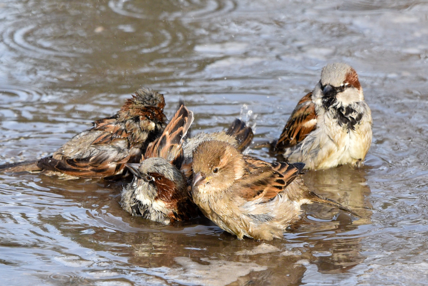 Zvirbuļu bariņš izmanto iespēju nopērties Vērmanes dārza peļķē.