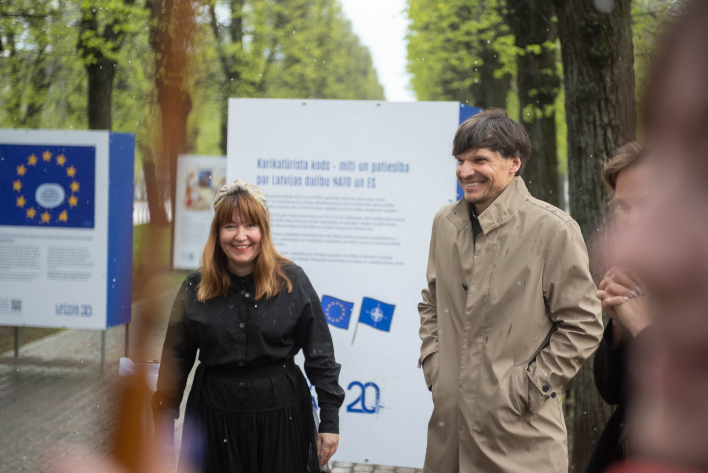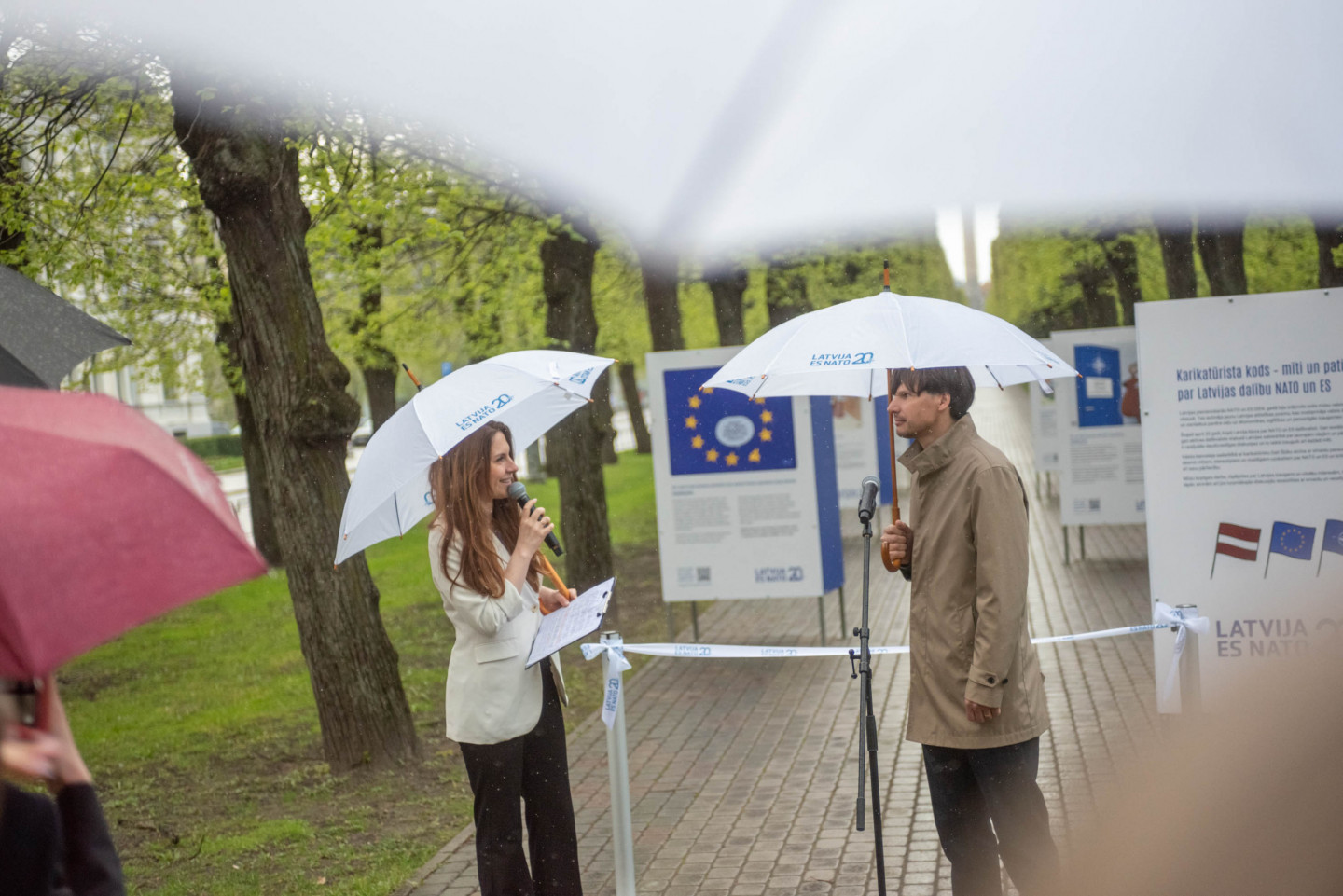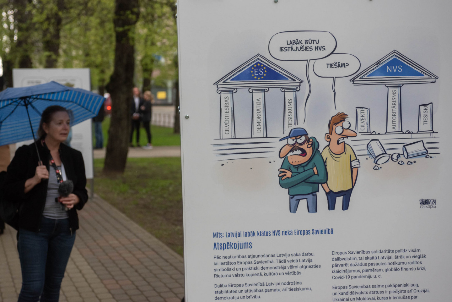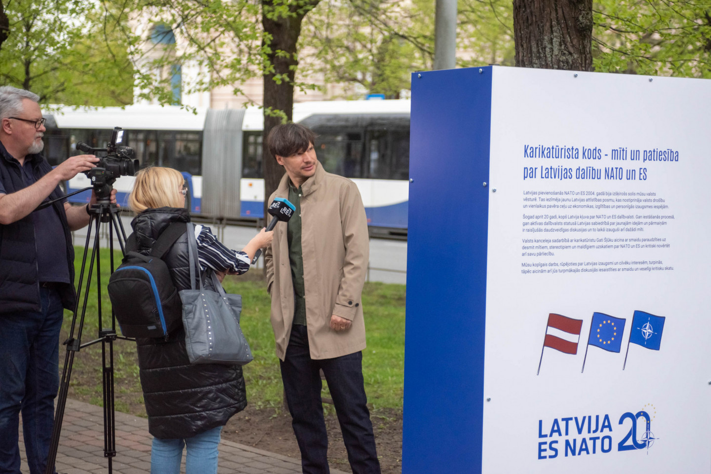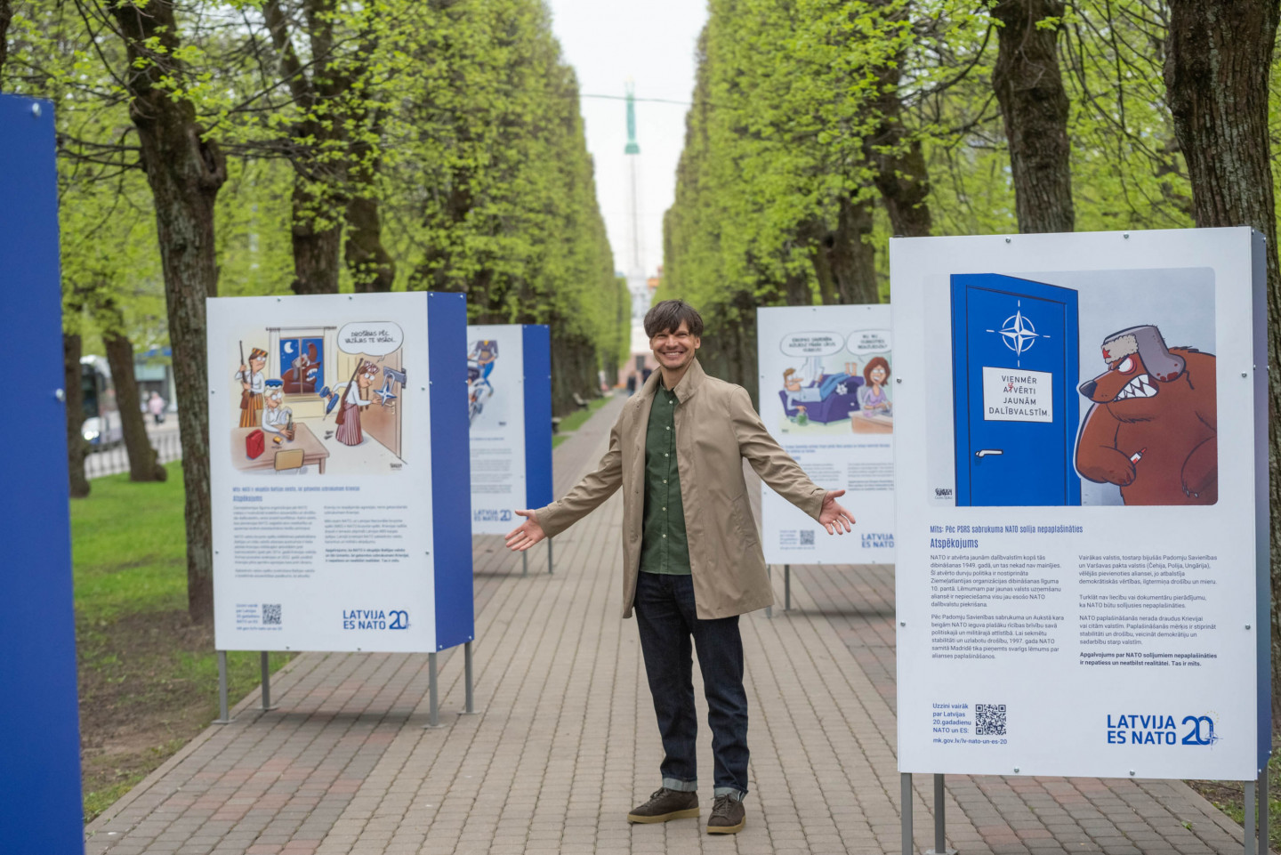 Brīvdabas izstāde "Karikatūrista kods - mīti un patiesība par Latvijas dalību ES un NATO" atklāta liepu alejā iepretīm Ministru kabineta ēkai.