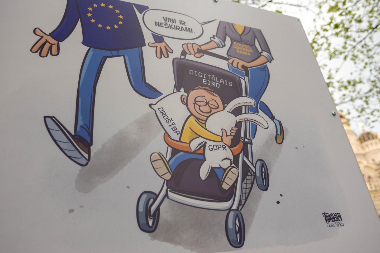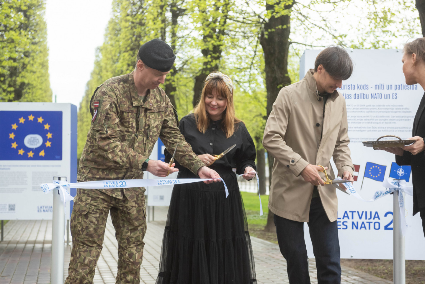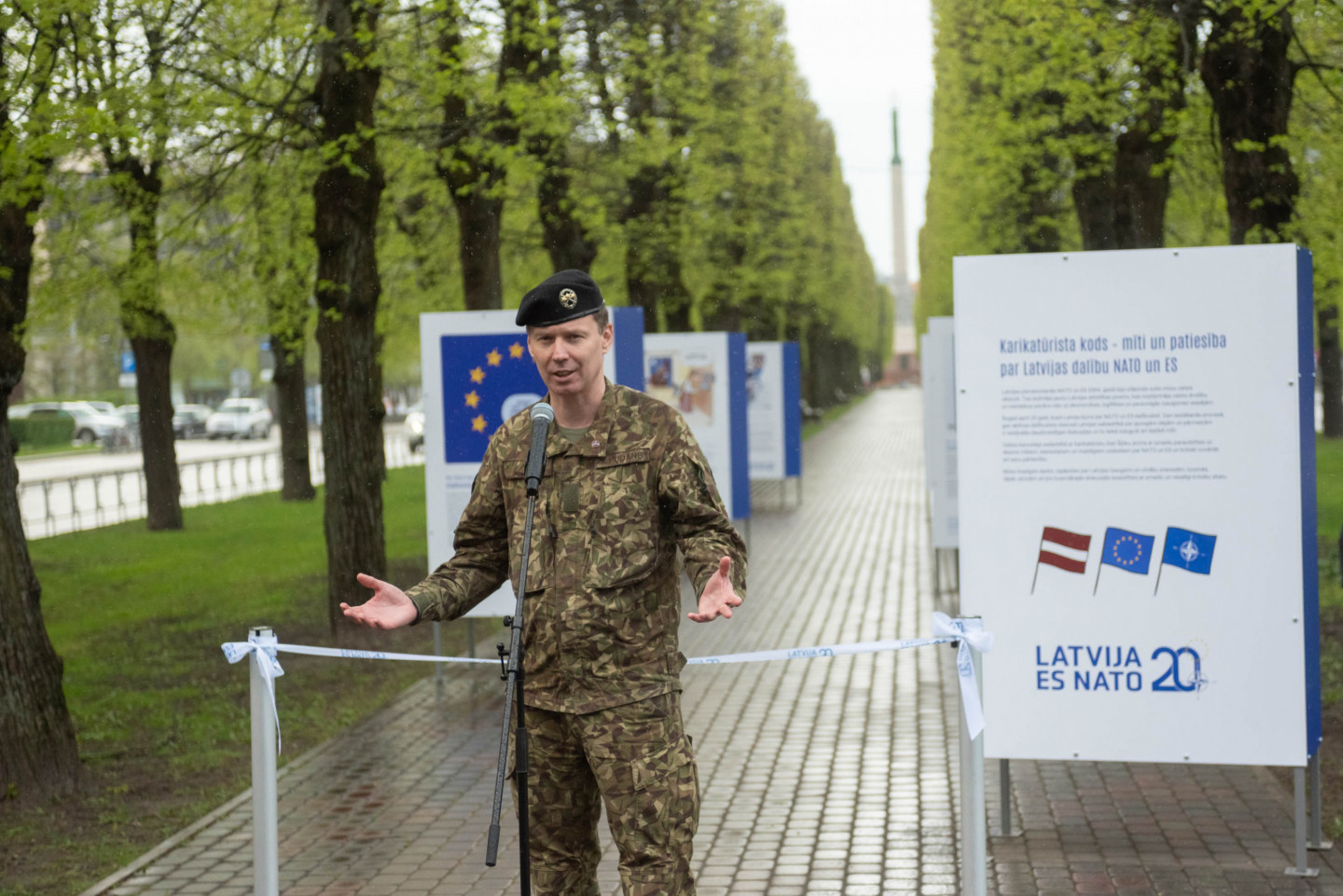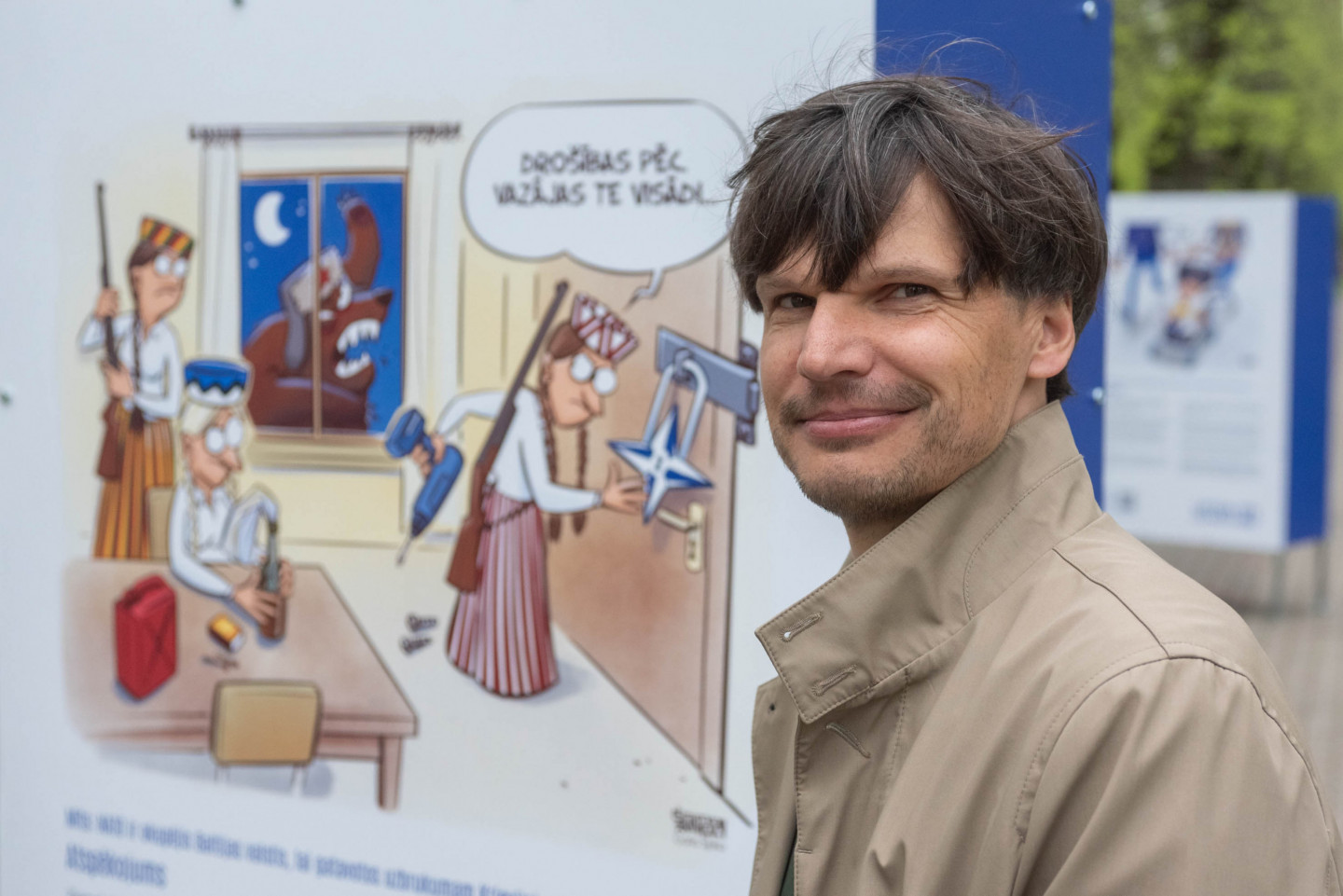 Brīvdabas izstāde "Karikatūrista kods - mīti un patiesība par Latvijas dalību ES un NATO" atklāta liepu alejā iepretīm Ministru kabineta ēkai.