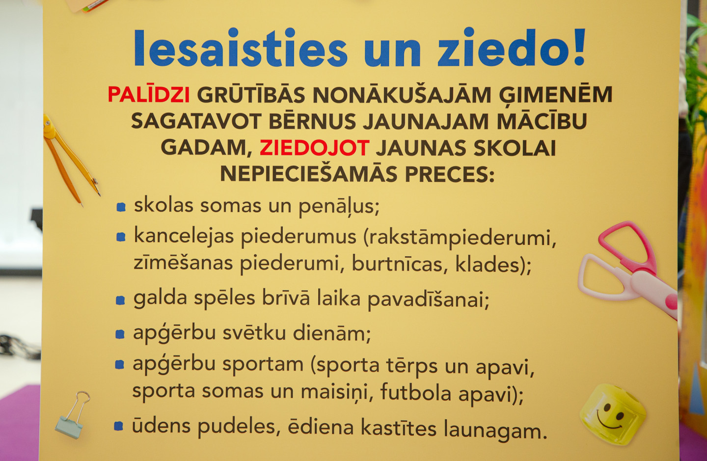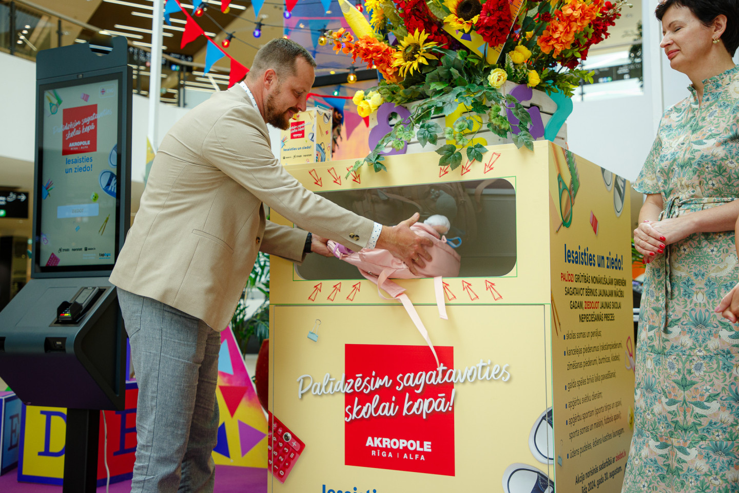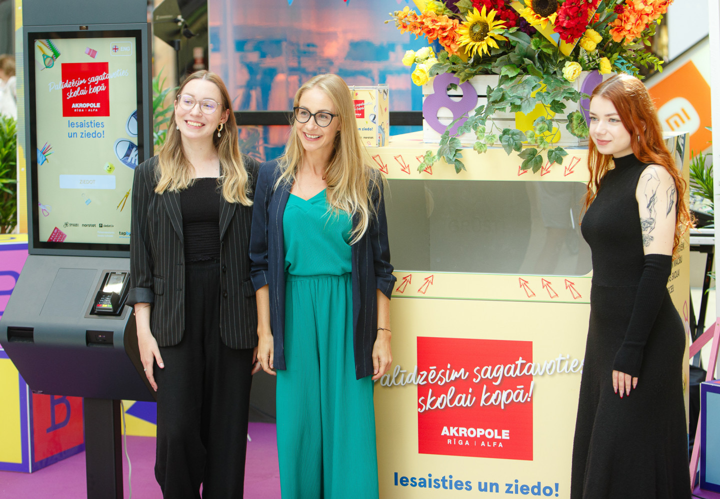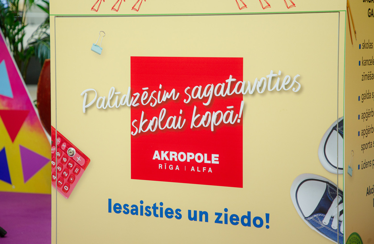 "Akropole Alfa" centrālajā laukumā pie informācijas centra norisinās labdarības akcijas "Palīdzēsim sagatavoties skolai kopā!" atklāšanas pasākums, kurā piedalās Labklājības ministrijas pārstāvis, labdarības organizācijas Ziedot.lv vadītāja Rūta Dimanta, vecāku organizācijas ''Mammamuntetiem.lv'' vadītājas vietniece Ella Karele, iepirkšanās un izklaides centra "Akropole Alfa" vadītāja Sanita Krīgere.