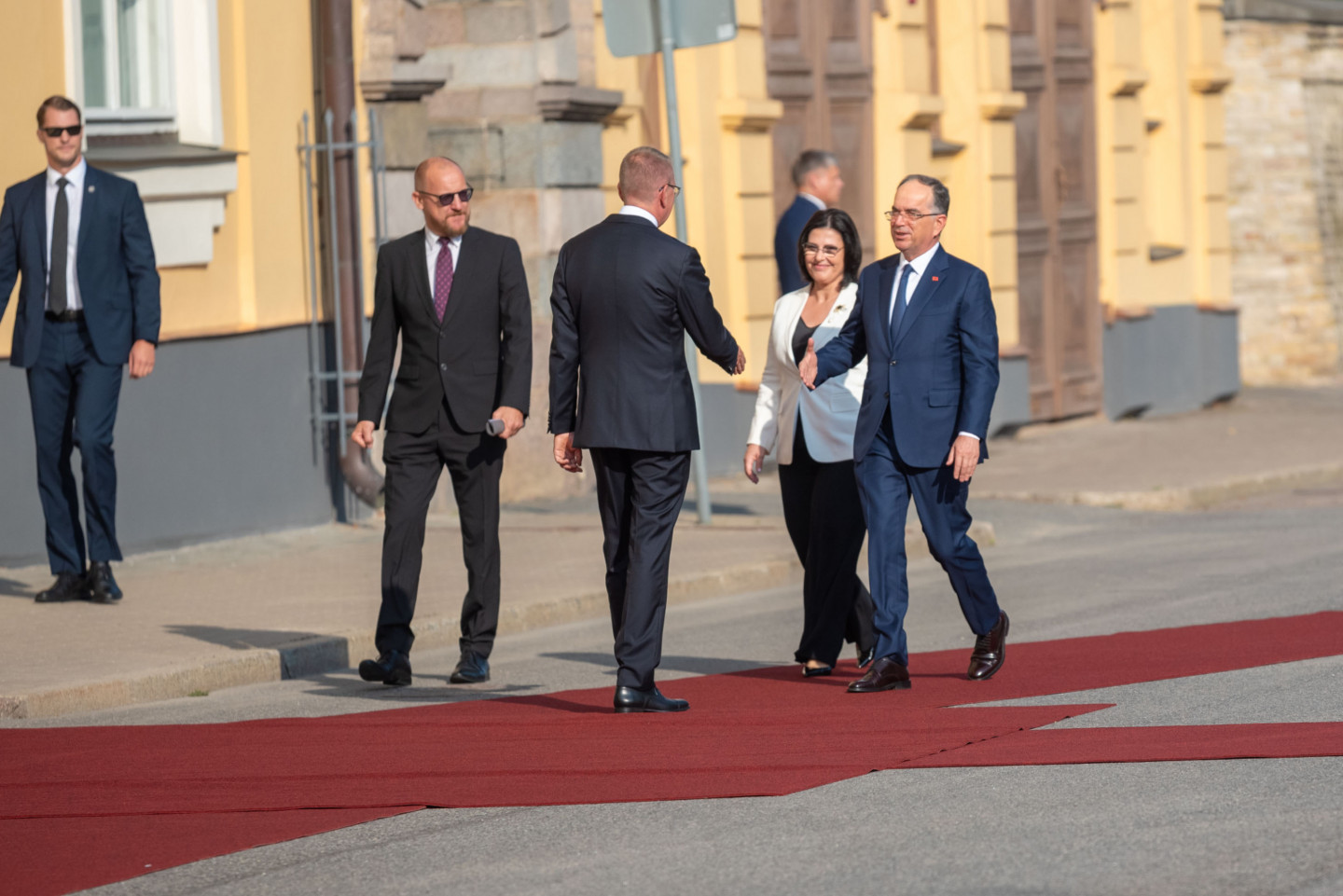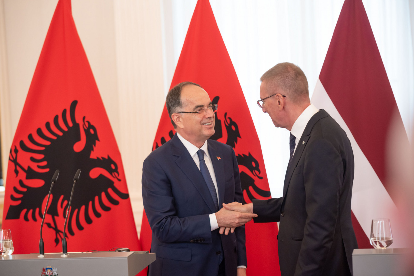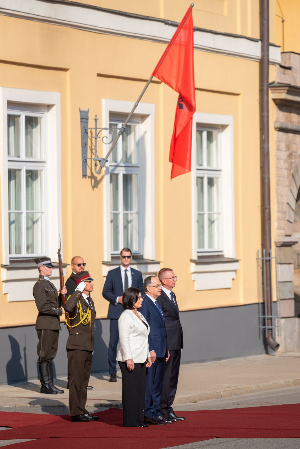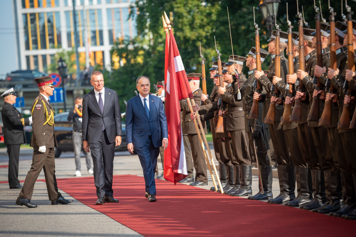 Valsts prezidents Edgars Rinkēvičs sagaida Albānijas prezidentu Bajramu Begaju.