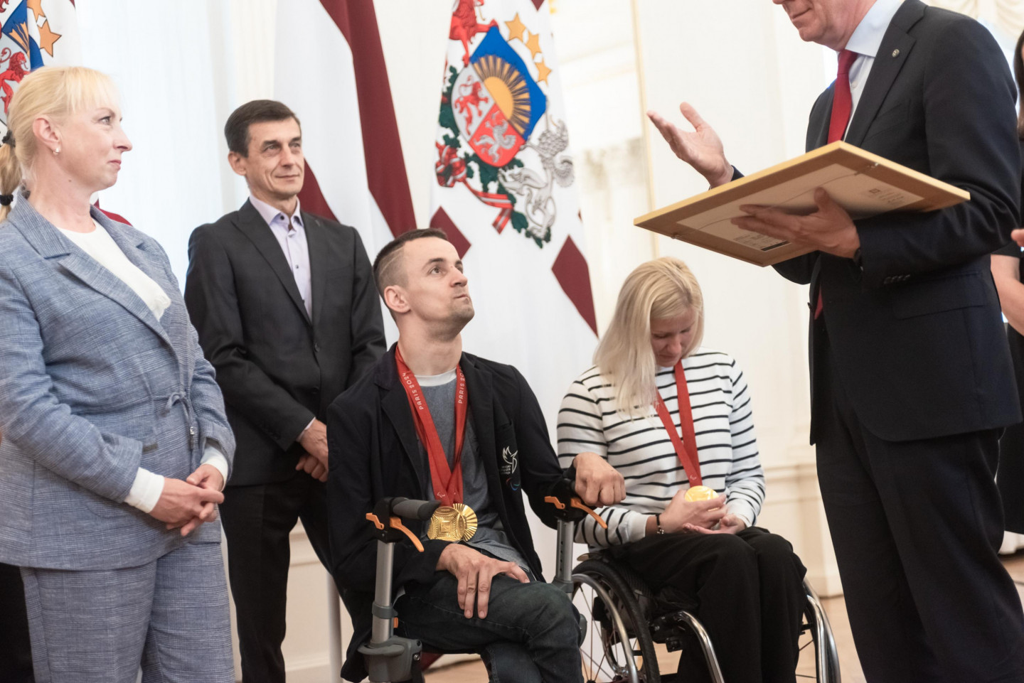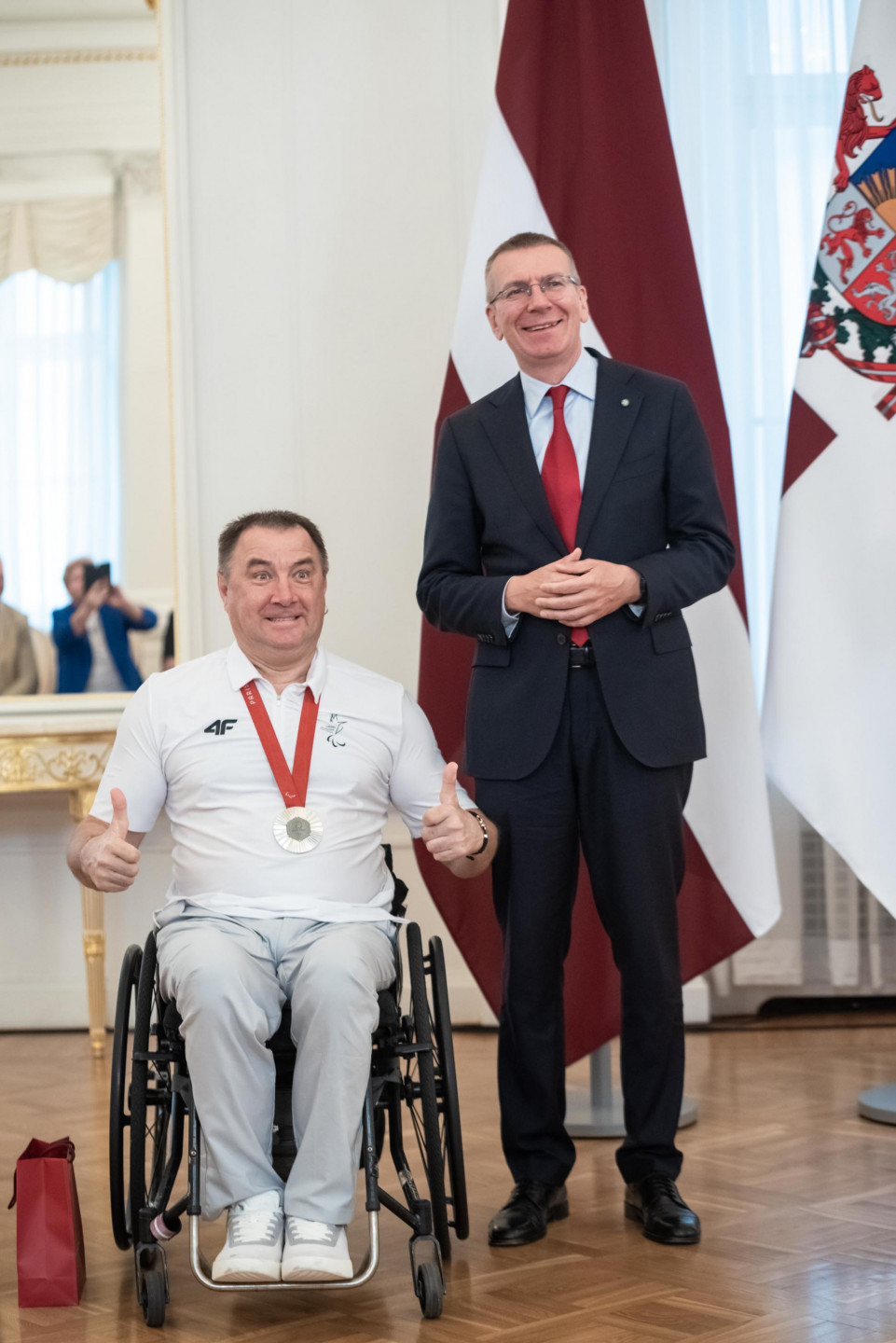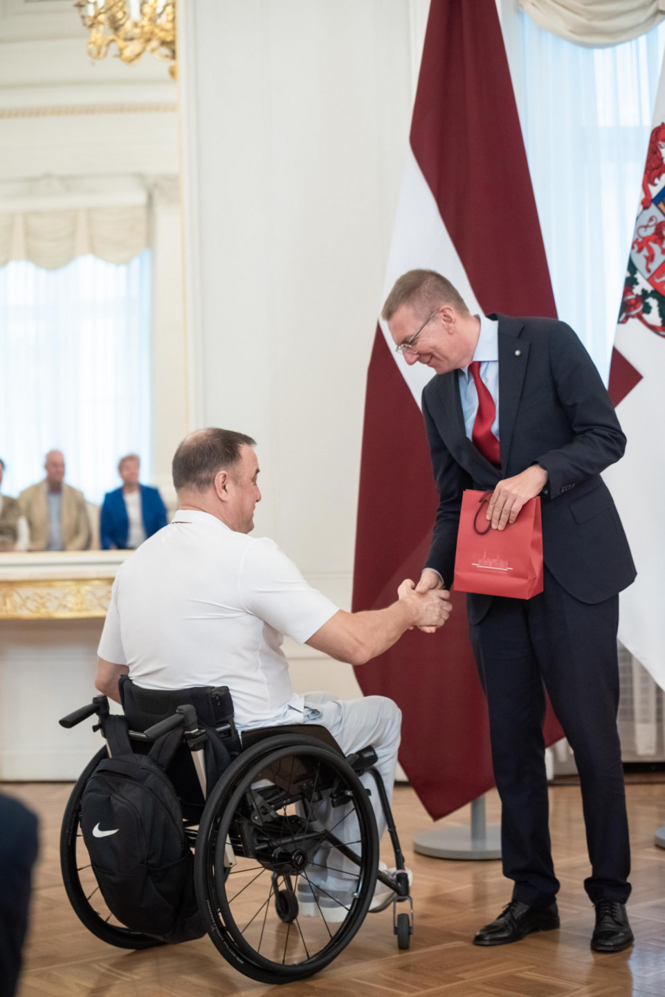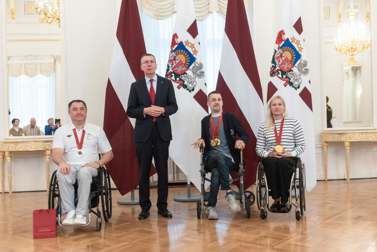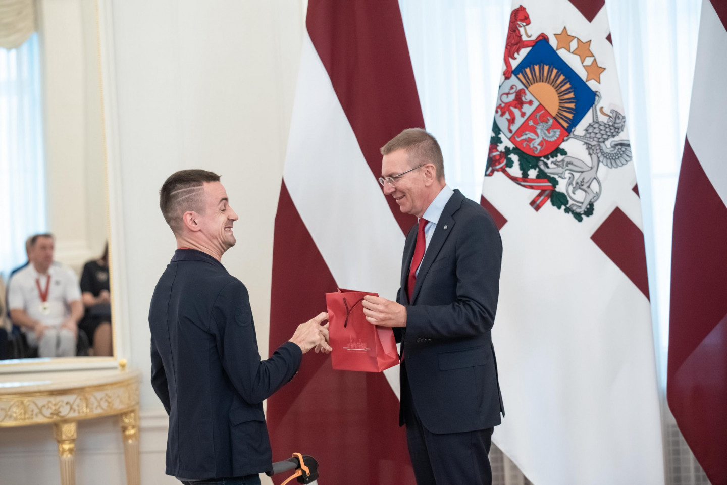 Valsts prezidents Edgars Rinkēvičs sveic Parīzes paralimpisko spēļu sportistus.