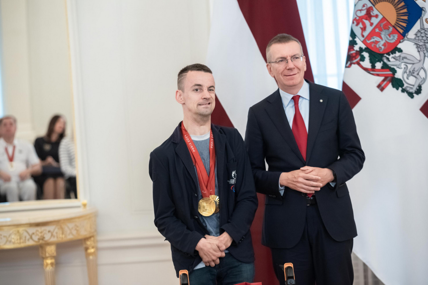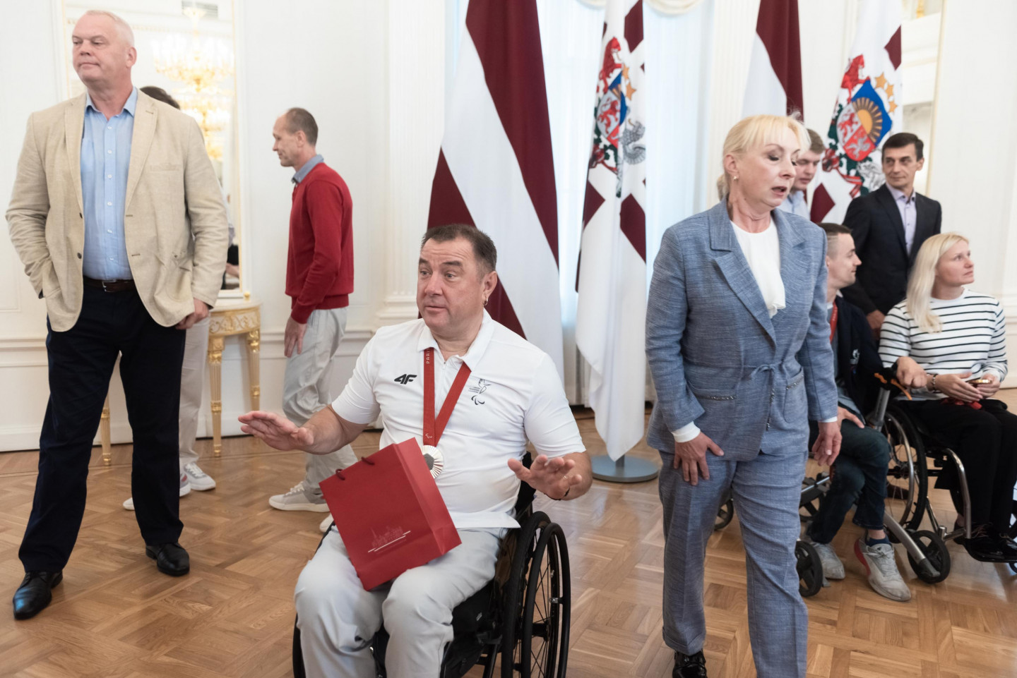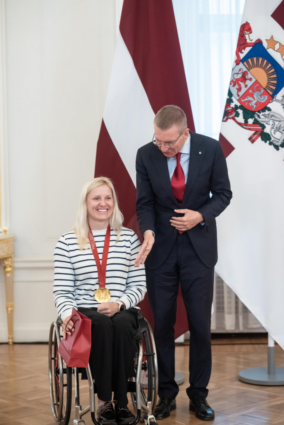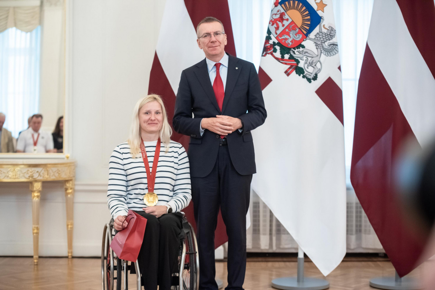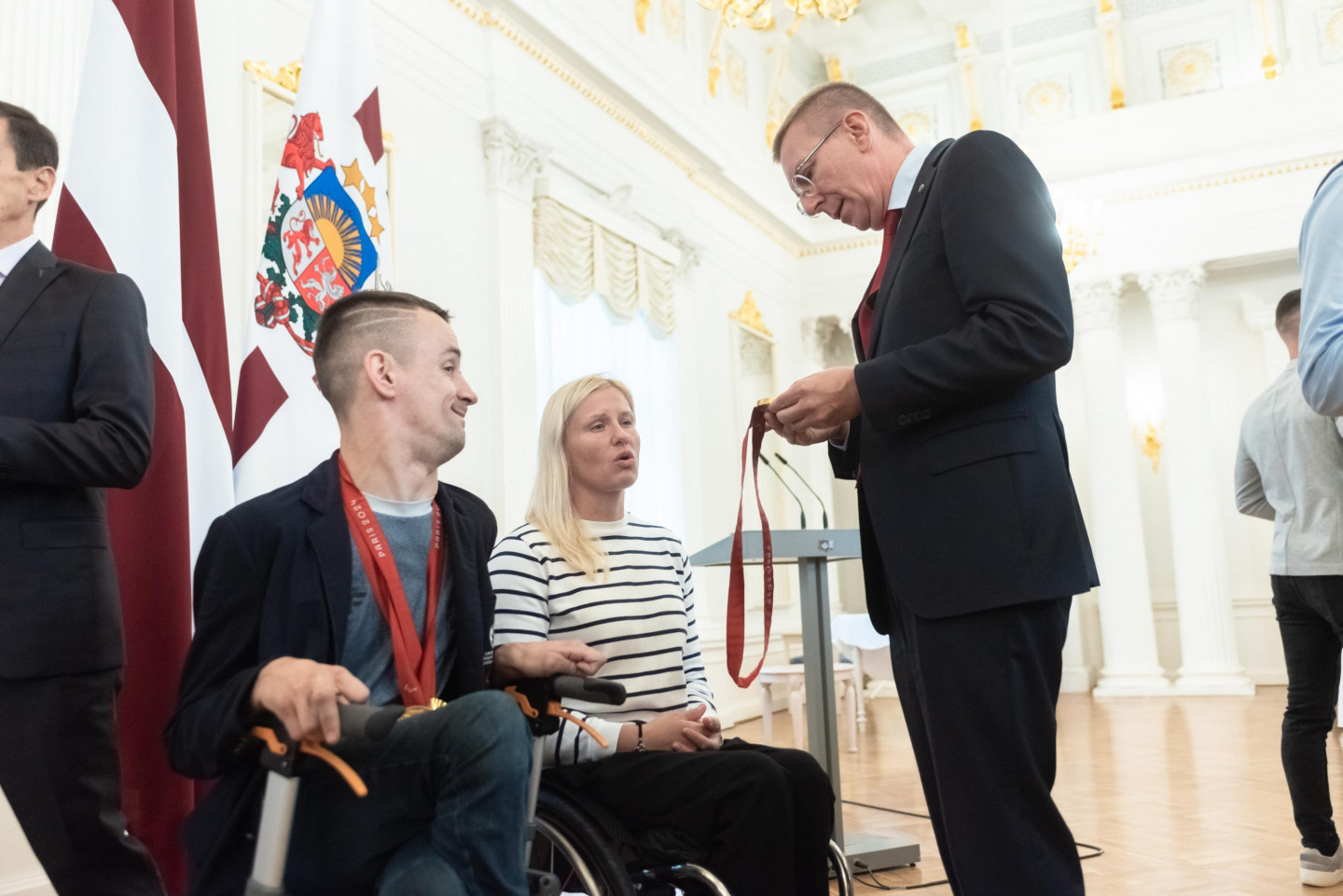 Valsts prezidents Edgars Rinkēvičs sveic Parīzes paralimpisko spēļu sportistus.