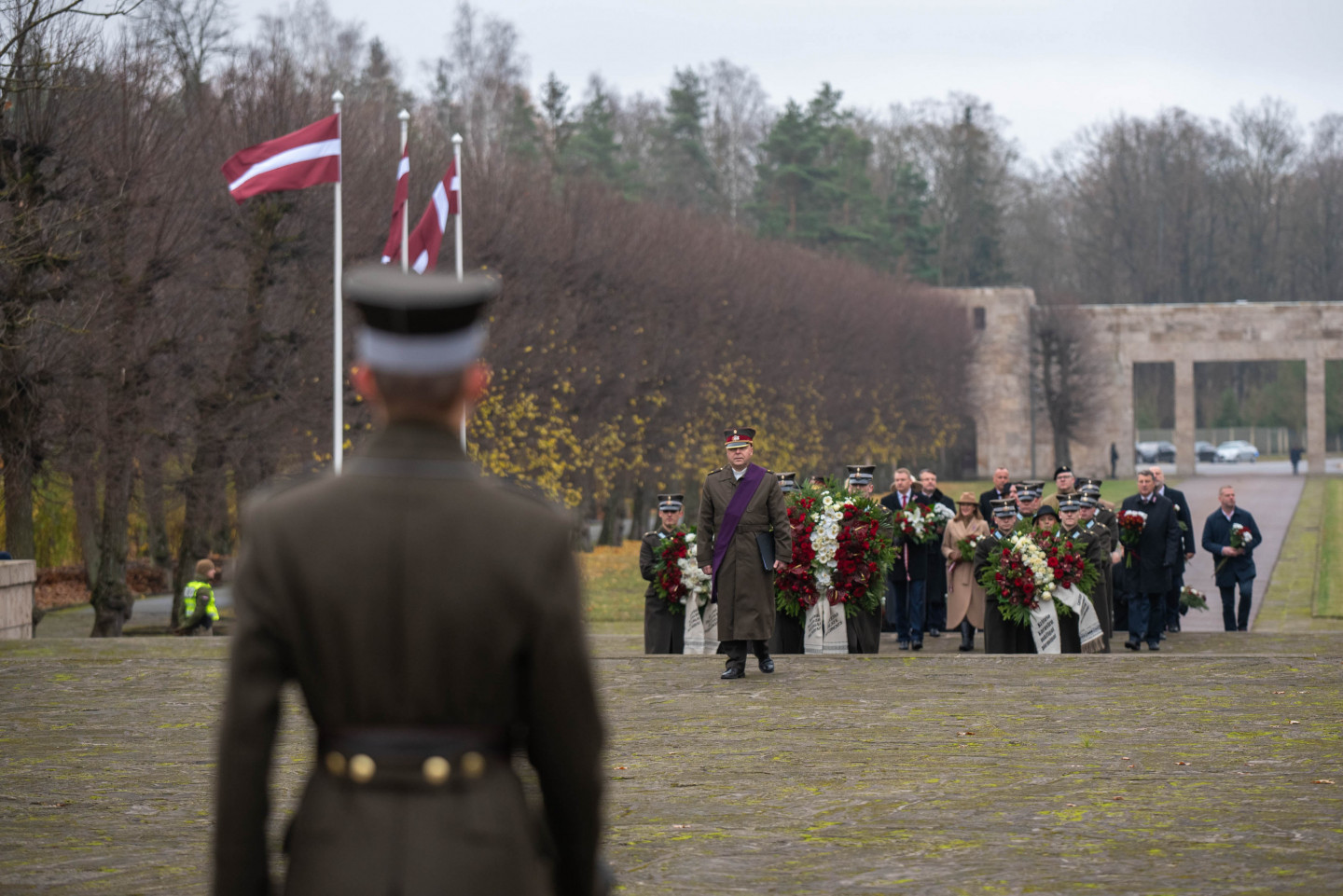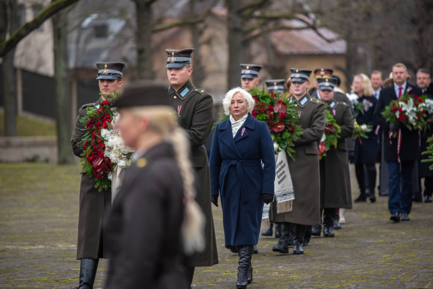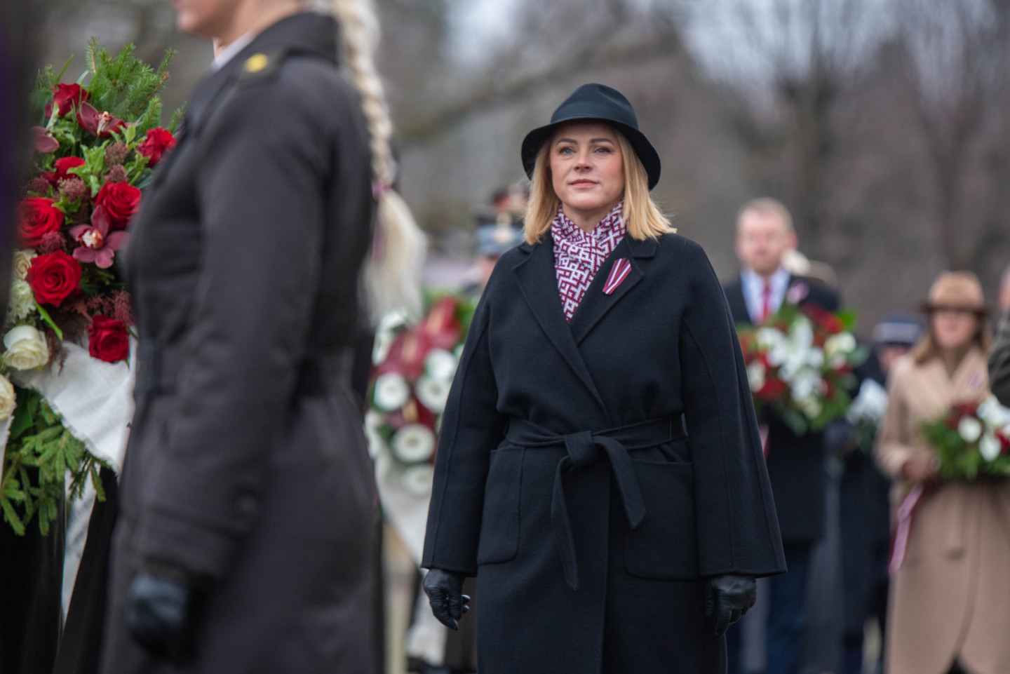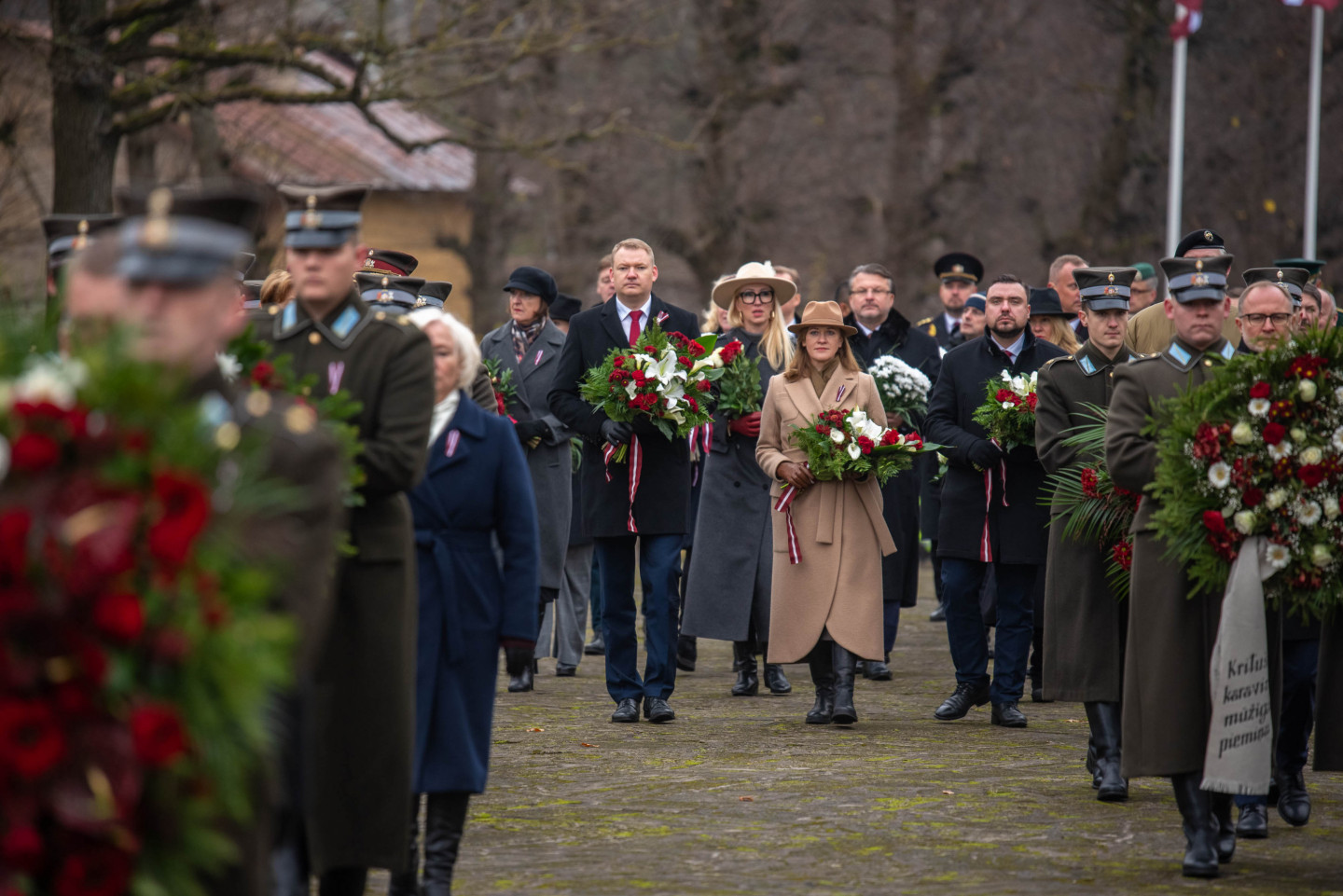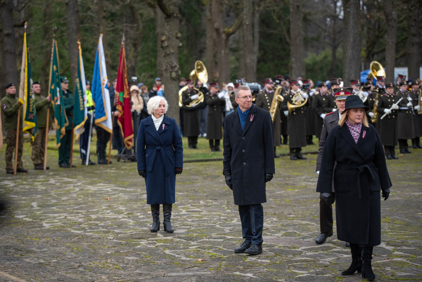 Valsts prezidents Edgars Rinkēvičs, Saeimas priekšsēdētāja Daiga Mieriņa, Ministru prezidente Evika Siliņa un citas valsts augstākās amatpersonas piedalās svinīgajā vainagu nolikšanas ceremonijā Rīgas Brāļu kapos, godinot Latvijas Brīvības cīnītājus.