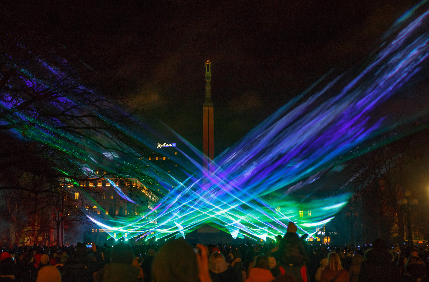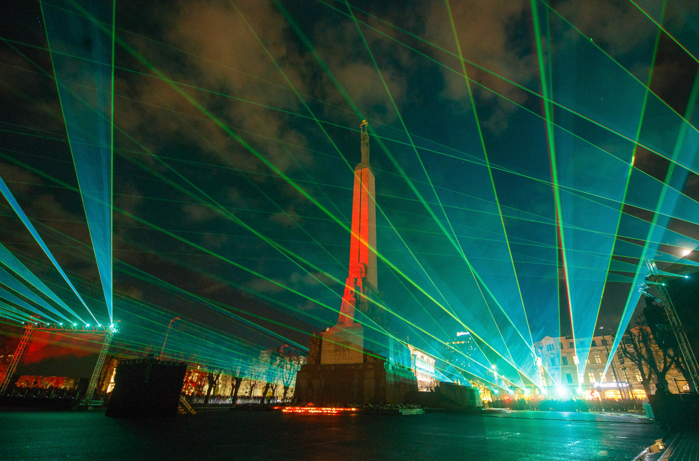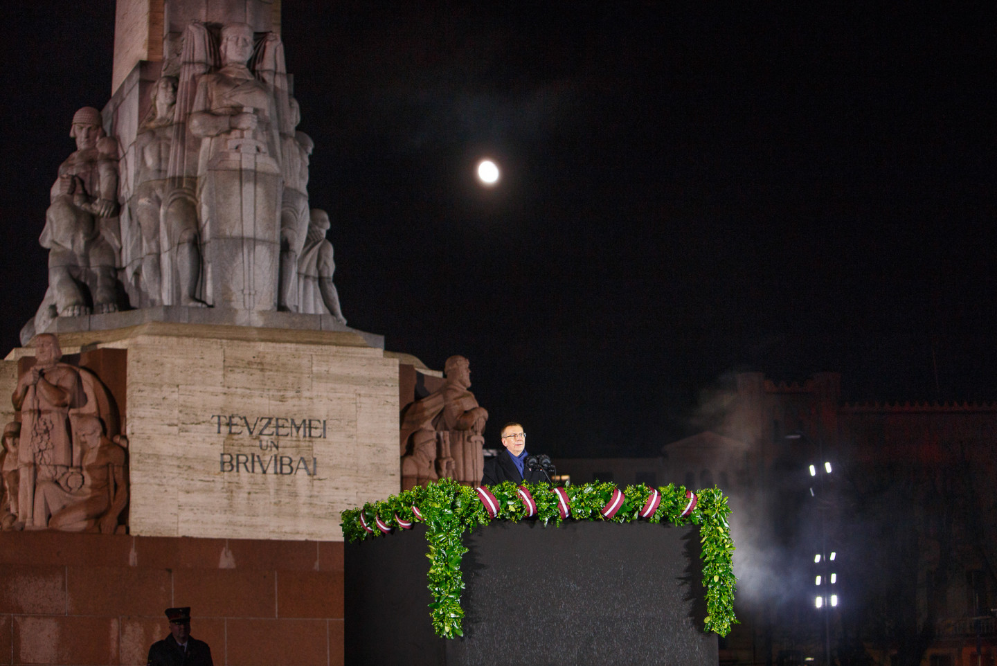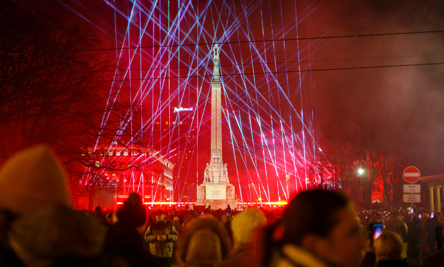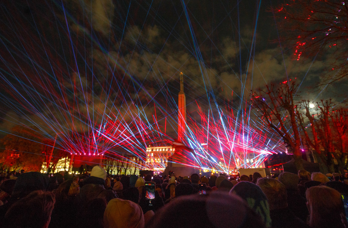 Brīvības laukumā norisinās Latvijas Republikas proklamēšanas gadadienai veltīts svinīgs pasākums un lāzeru gaismas priekšnesums.