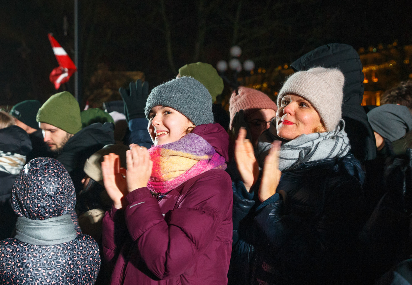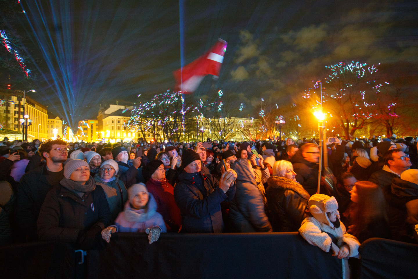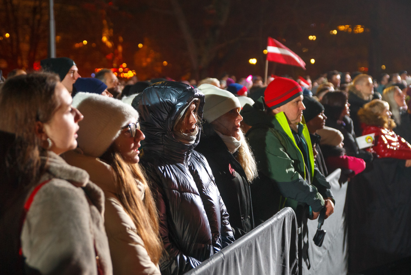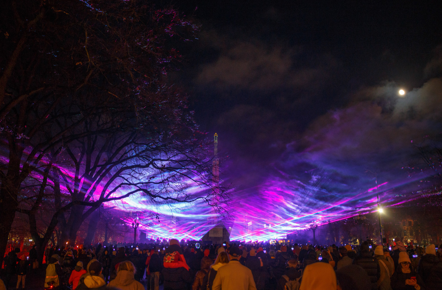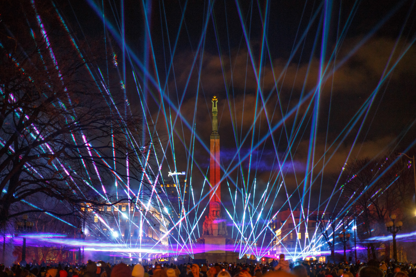 Brīvības laukumā norisinās Latvijas Republikas proklamēšanas gadadienai veltīts svinīgs pasākums un lāzeru gaismas priekšnesums.