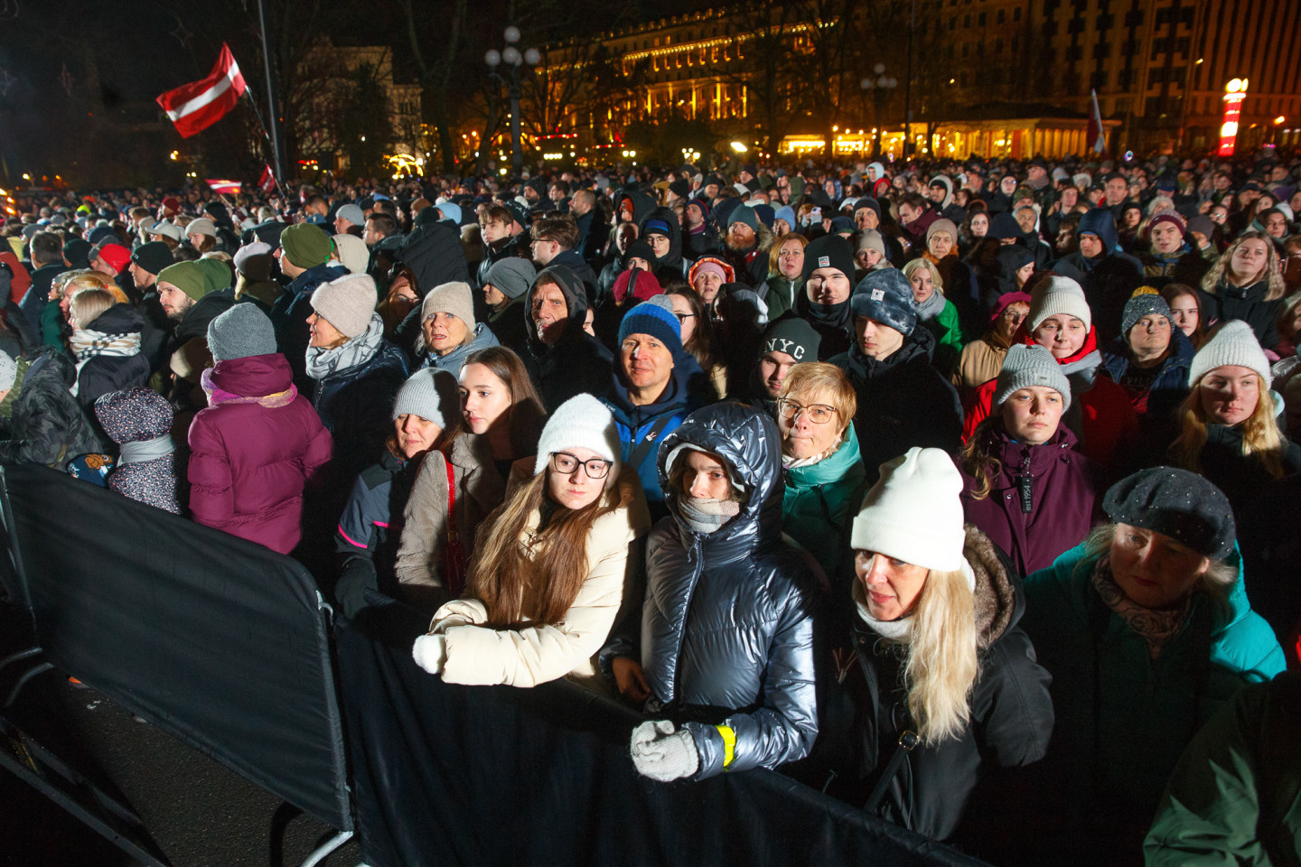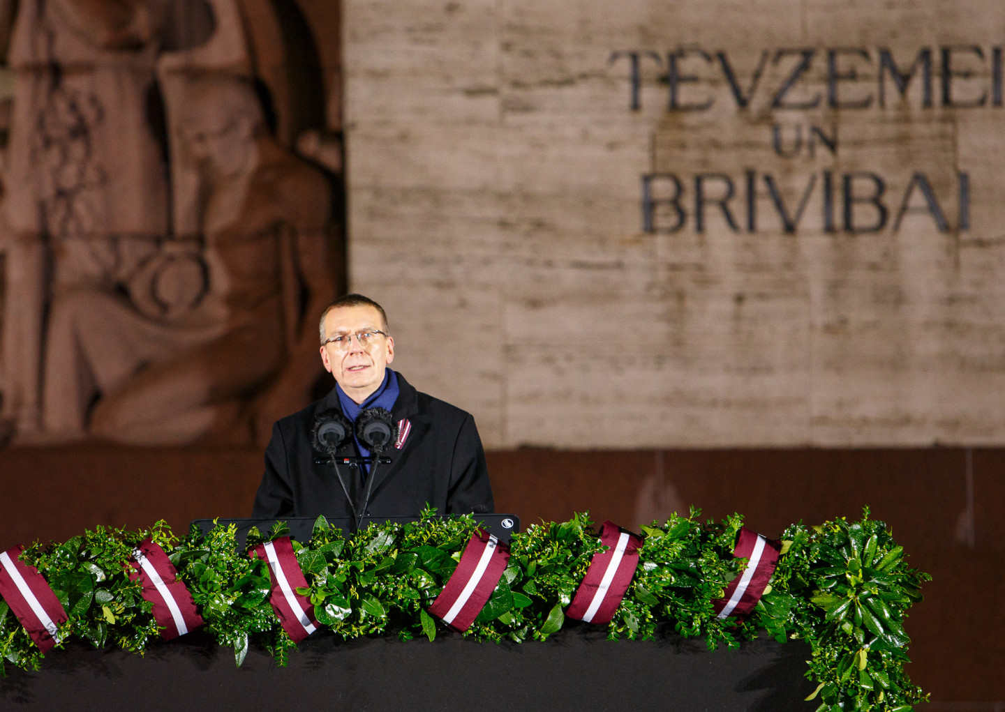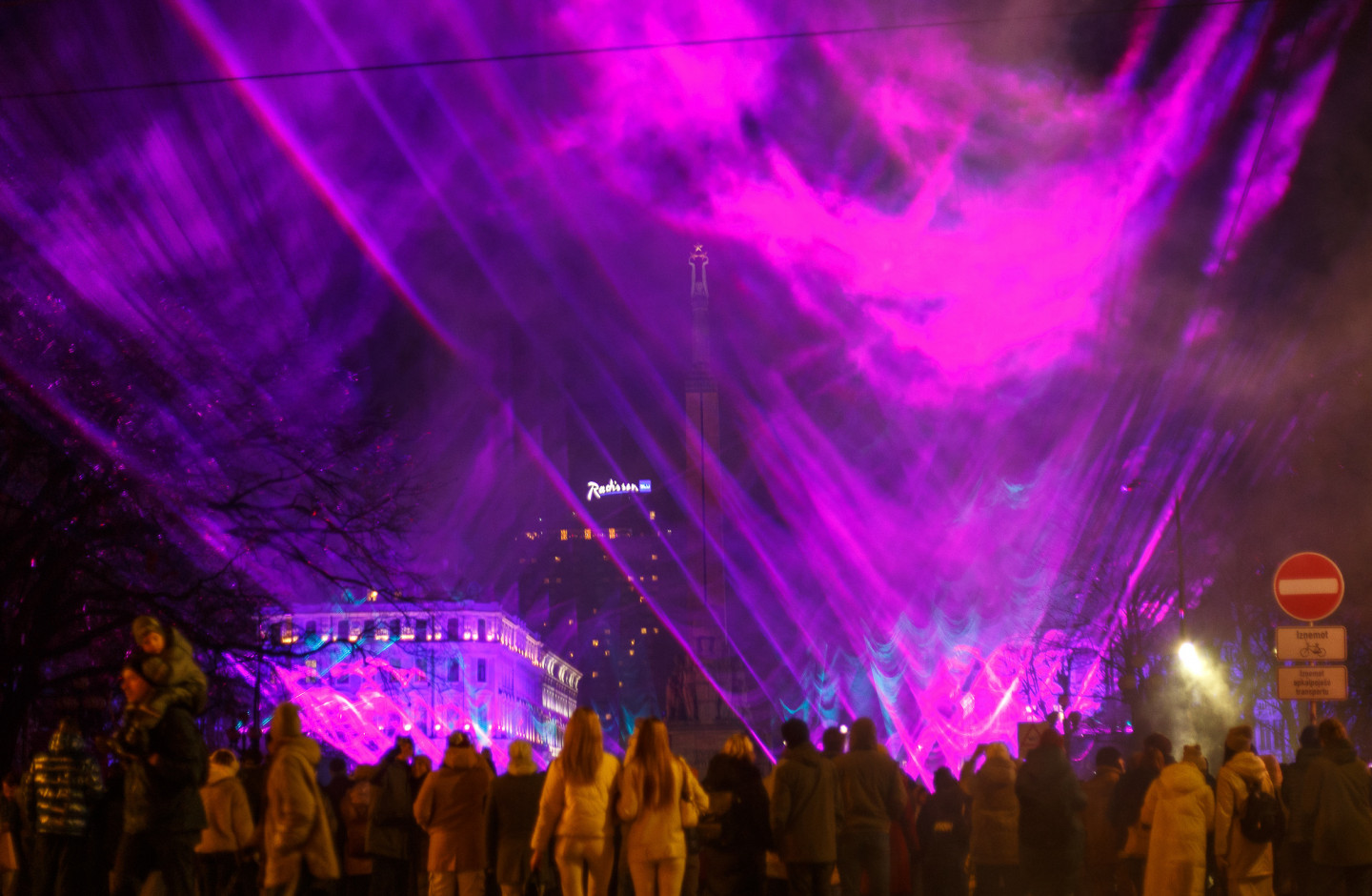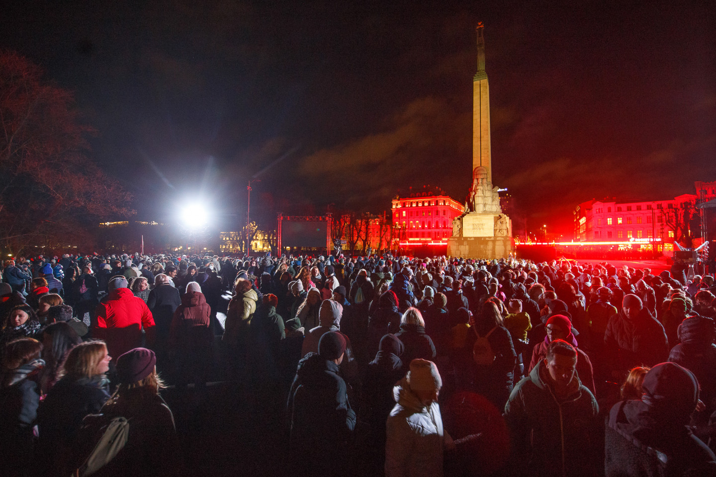 Brīvības laukumā norisinās Latvijas Republikas proklamēšanas gadadienai veltīts svinīgs pasākums un lāzeru gaismas priekšnesums.