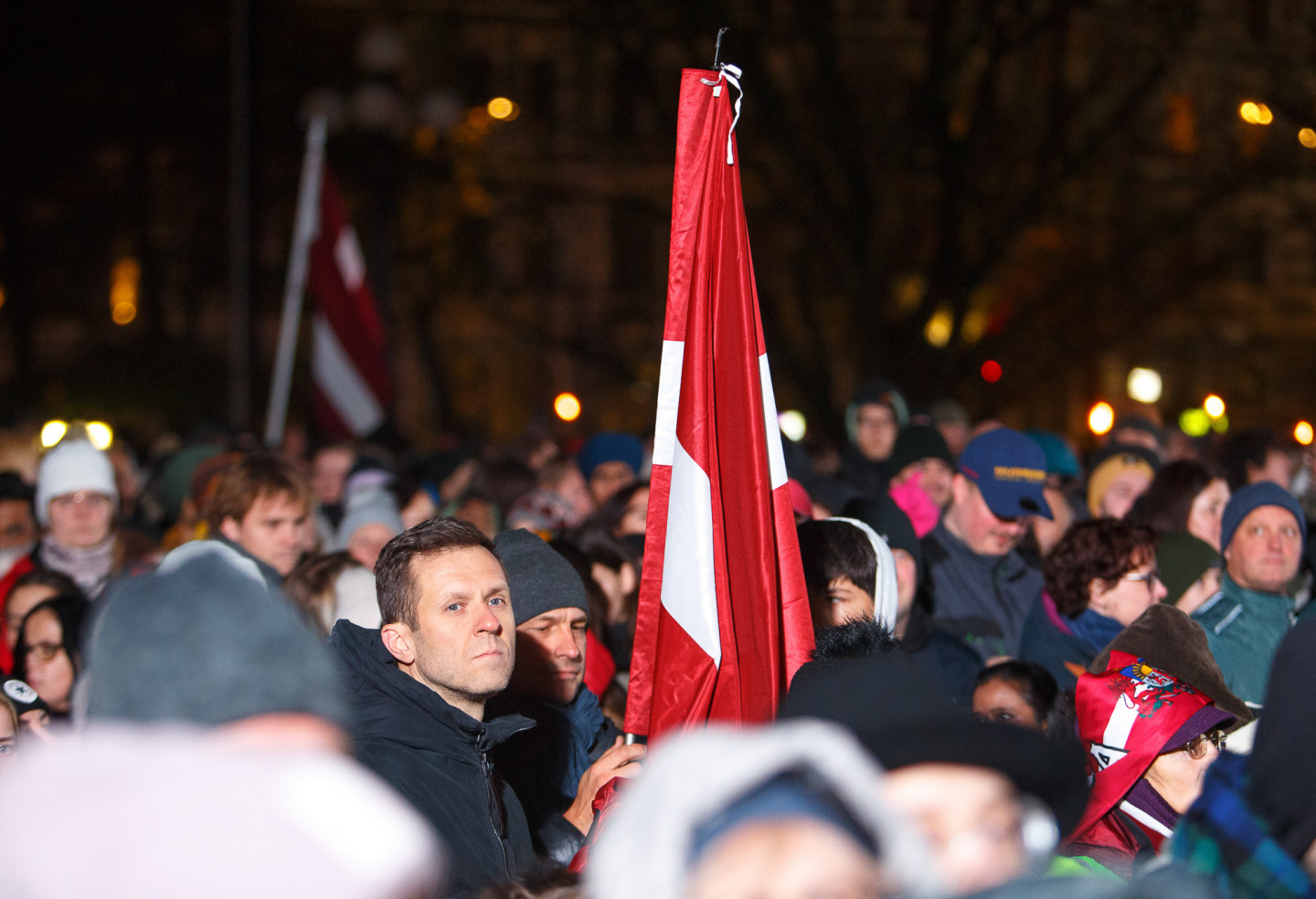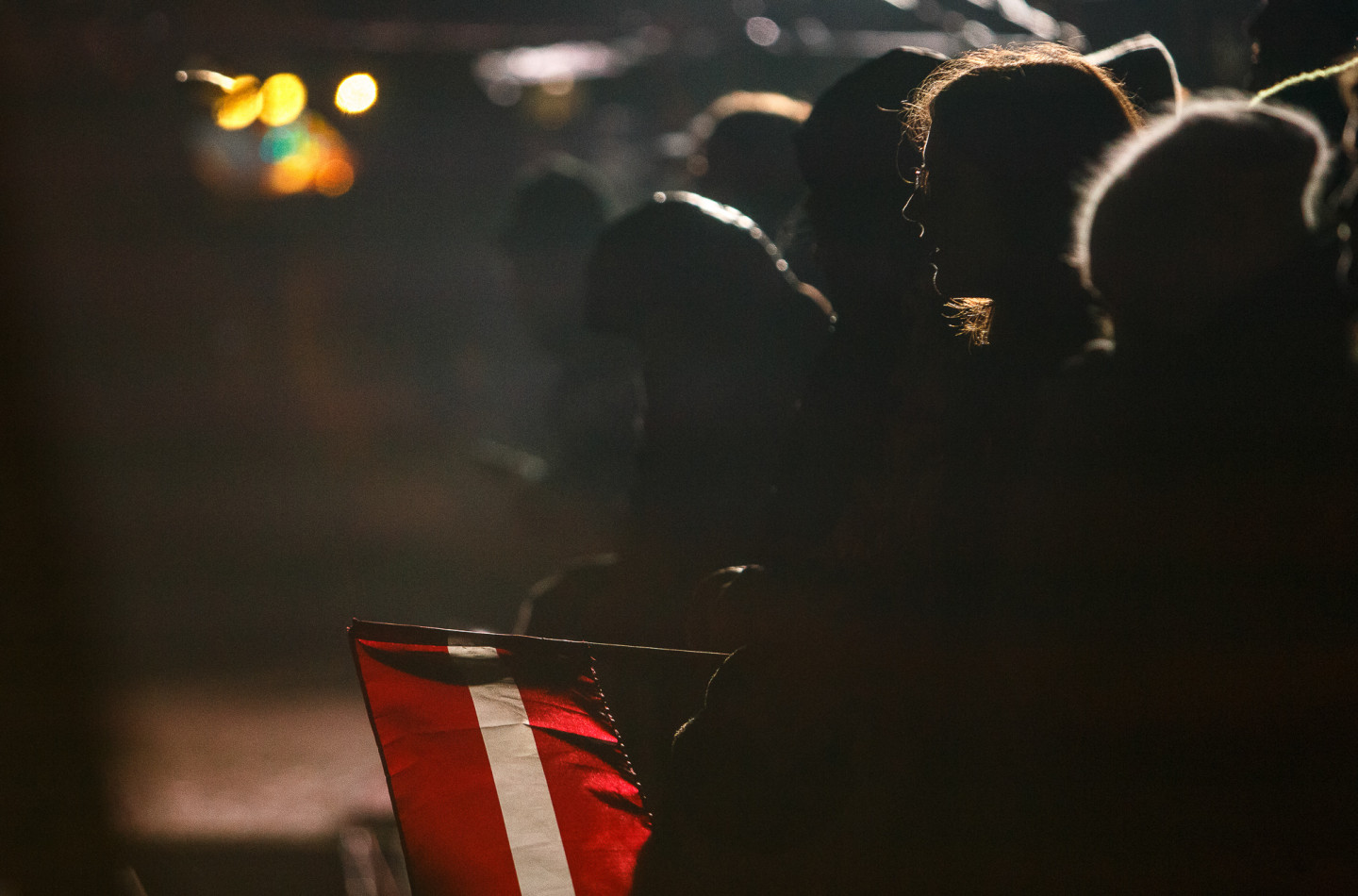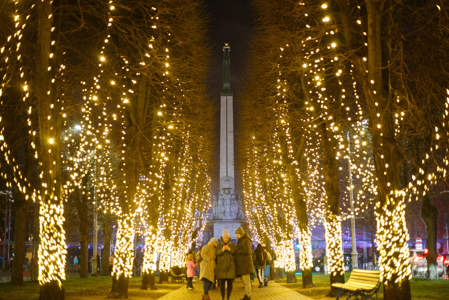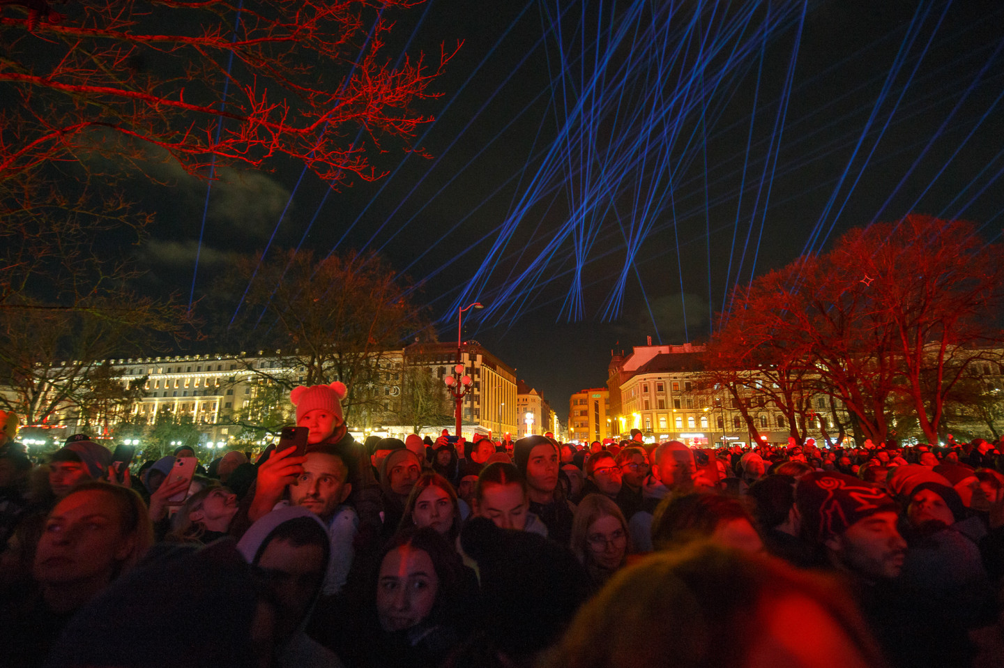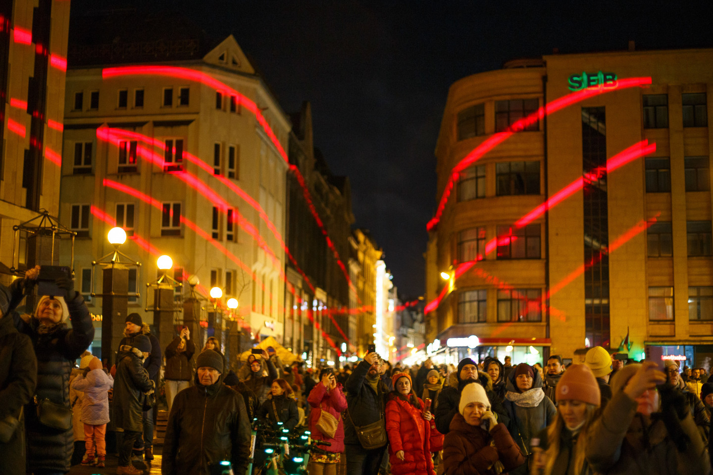 Brīvības laukumā norisinās Latvijas Republikas proklamēšanas gadadienai veltīts svinīgs pasākums un lāzeru gaismas priekšnesums.