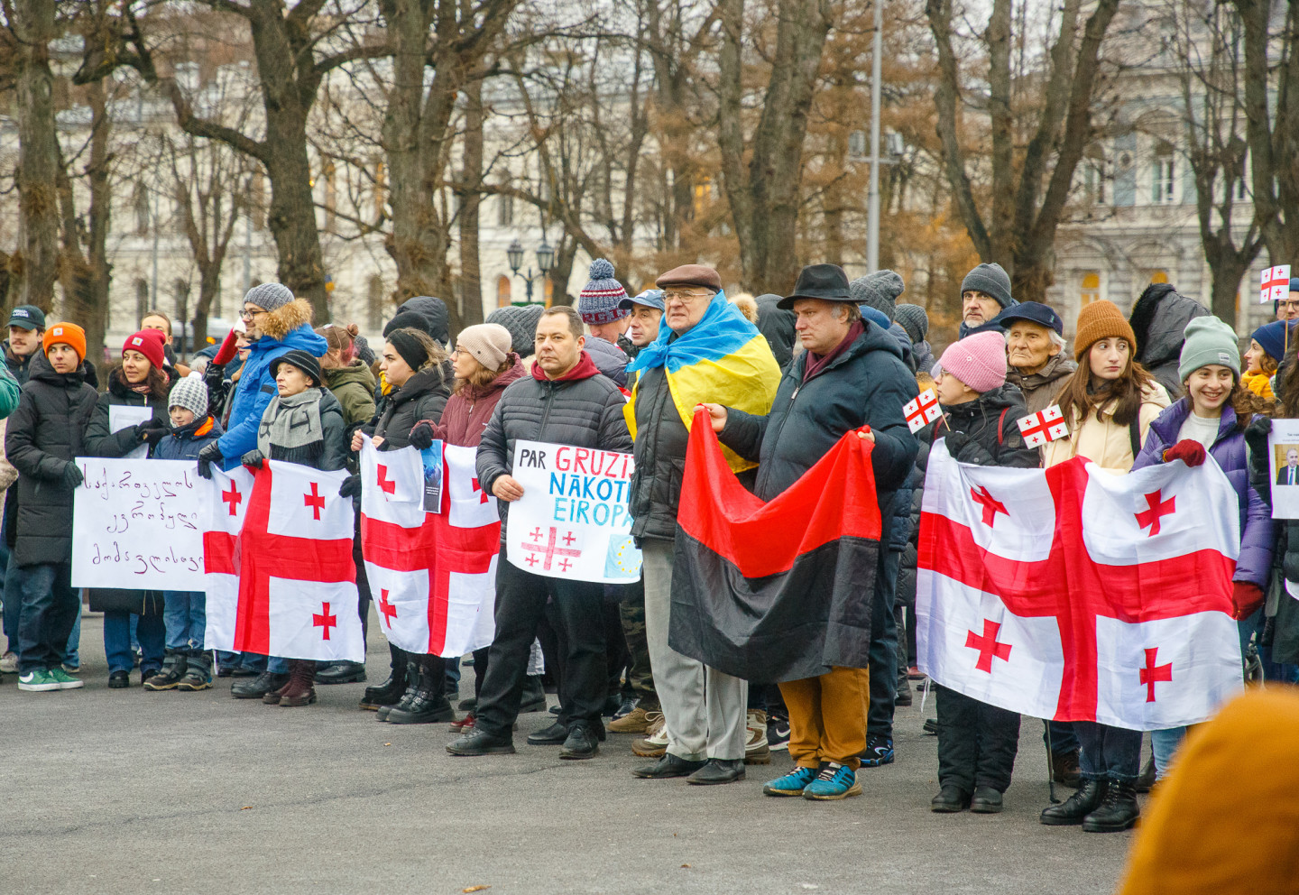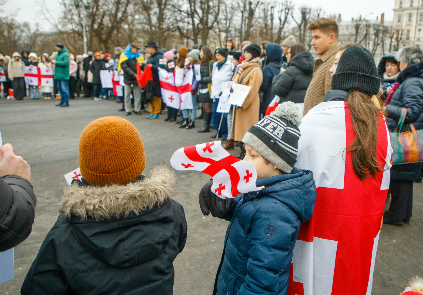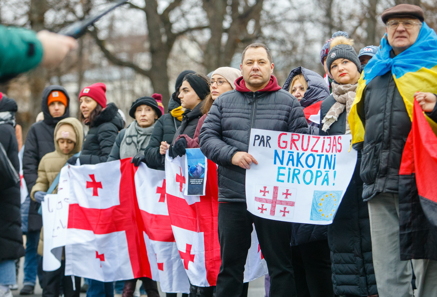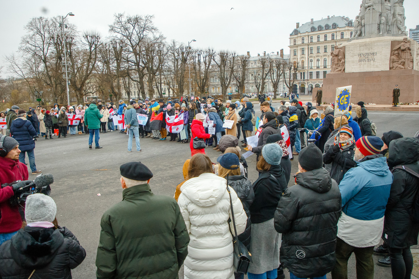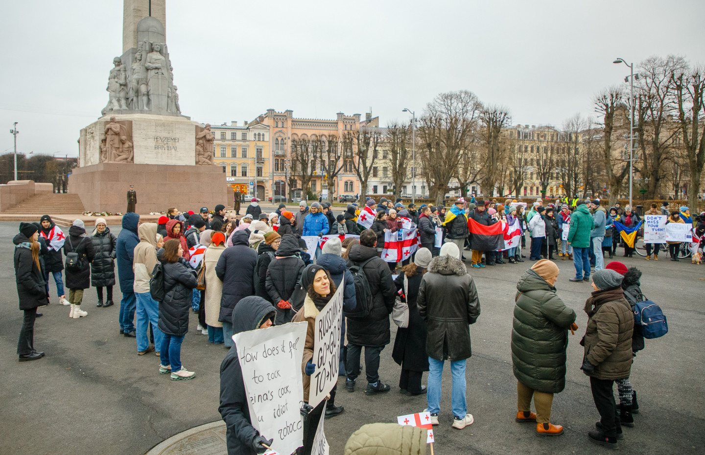 Latvijā dzīvojošo gruzīnu sestdien rīkotajā akcijā pie Brīvības pieminekļa Rīgā atbalstīt Gruzijas tautas prasību par tiesībām virzīties uz dalību Eiropas Savienībā (ES) bija ieradušies aptuveni 100 cilvēki, novēroja aģentūra LETA. Piketa dalībnieki rokās turēja pārsvarā Gruzijas karogus, tāpat bija arī daži Ukrainas un Latvijas karogi. Akcijas dalībnieku plakātos teikts, ka "Gruzija - tā ir Eiropa", "Nepalaidiet garām savu pagriezienu", aicinājums apturēt vardarbību pret miermīlīgajiem protestētājiem, "Par Gruzijas nākotni Eiropā", "Apturiet Bidzinas kuces!" un citi. Akcijas dalībnieki teica uzrunas gruzīnu valodā, kā arī latviešu valodā. Kādā no uzrunām tika uzsvērts, ka Krievija ir Gruzijas un Latvijas kopīgais ienaidnieks, kas 2008.gadā okupēja 20% Gruzijas teritorijas, bet tagad ir okupējis 100% teritorijas. Izskanēja arī uzruna Ukrainas atbalstam.