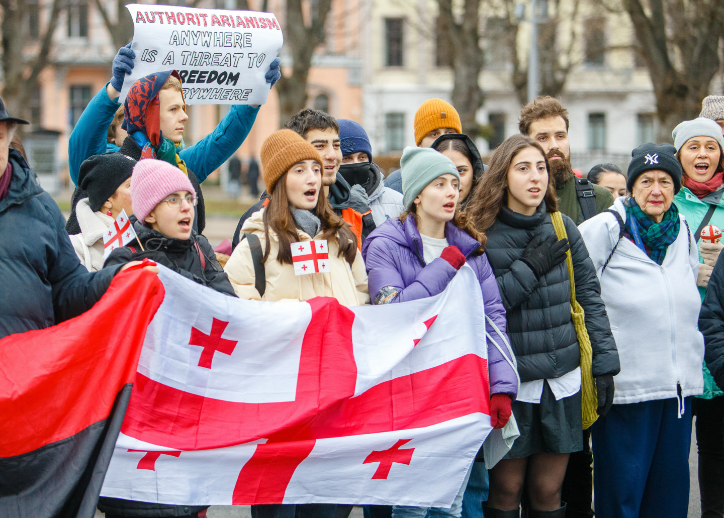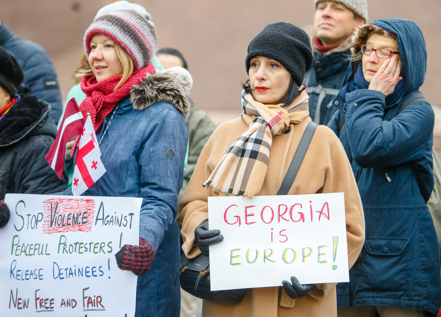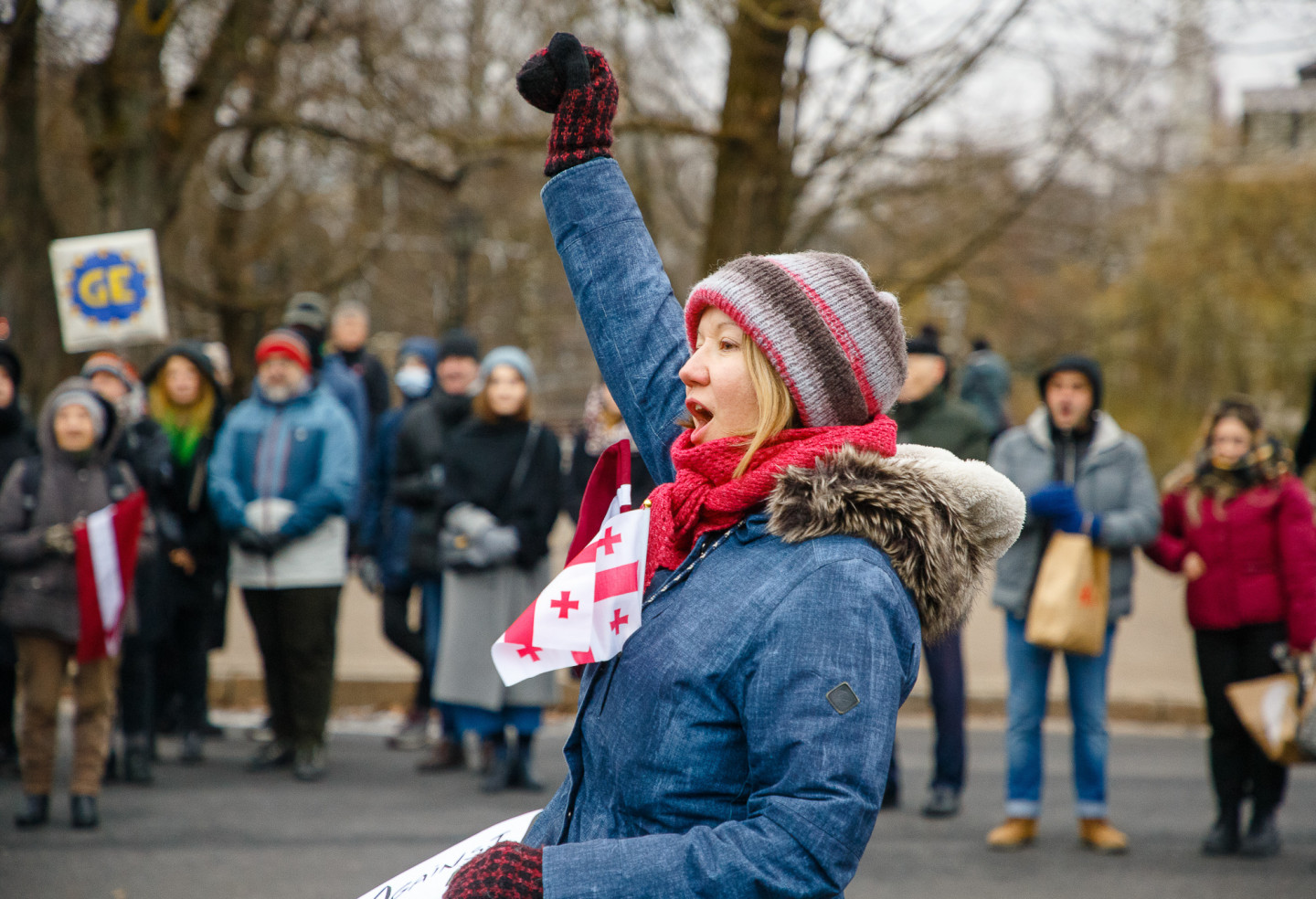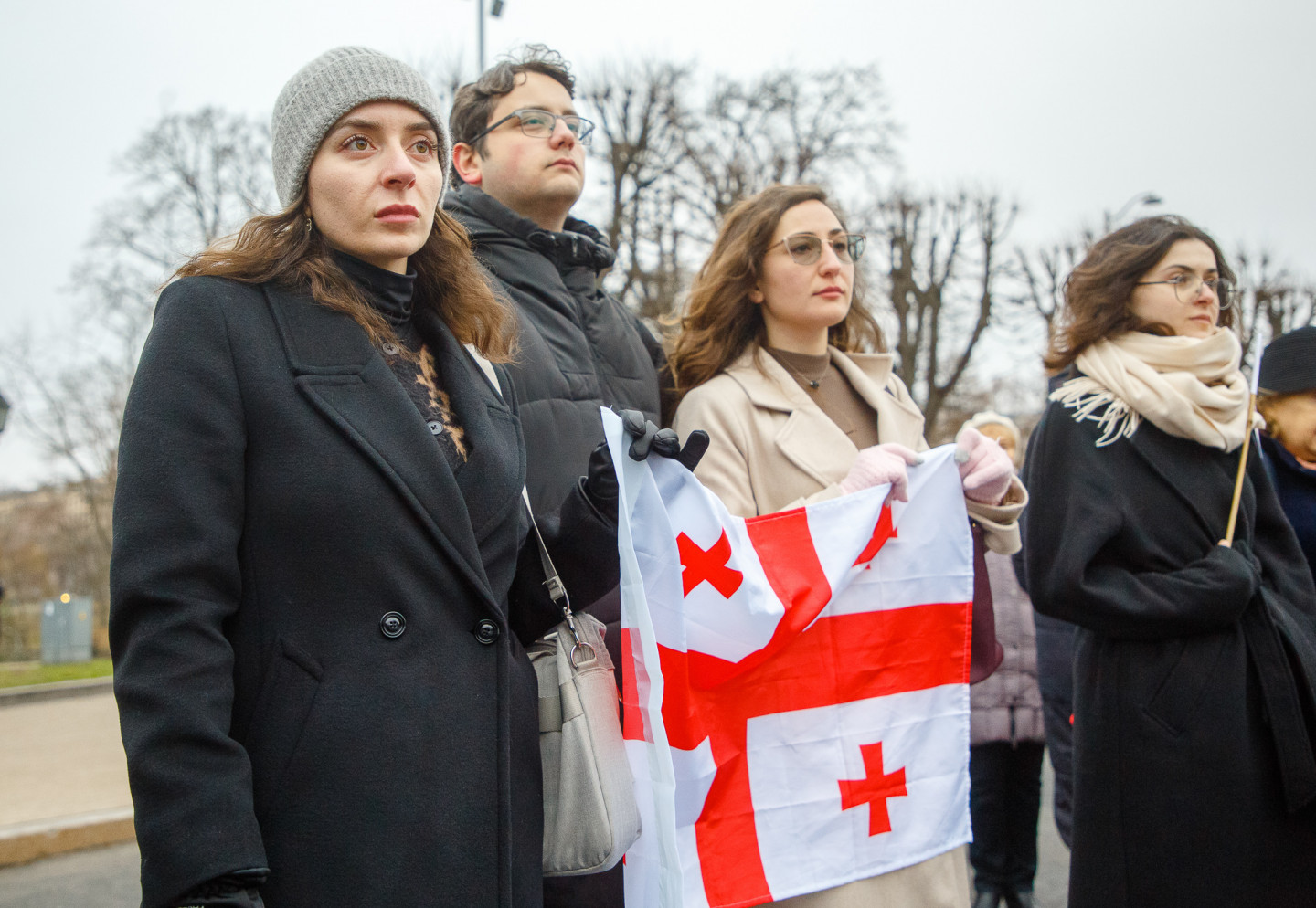 Latvijā dzīvojošo gruzīnu sestdien rīkotajā akcijā pie Brīvības pieminekļa Rīgā atbalstīt Gruzijas tautas prasību par tiesībām virzīties uz dalību Eiropas Savienībā (ES) bija ieradušies aptuveni 100 cilvēki, novēroja aģentūra LETA. Piketa dalībnieki rokās turēja pārsvarā Gruzijas karogus, tāpat bija arī daži Ukrainas un Latvijas karogi. Akcijas dalībnieku plakātos teikts, ka "Gruzija - tā ir Eiropa", "Nepalaidiet garām savu pagriezienu", aicinājums apturēt vardarbību pret miermīlīgajiem protestētājiem, "Par Gruzijas nākotni Eiropā", "Apturiet Bidzinas kuces!" un citi. Akcijas dalībnieki teica uzrunas gruzīnu valodā, kā arī latviešu valodā. Kādā no uzrunām tika uzsvērts, ka Krievija ir Gruzijas un Latvijas kopīgais ienaidnieks, kas 2008.gadā okupēja 20% Gruzijas teritorijas, bet tagad ir okupējis 100% teritorijas. Izskanēja arī uzruna Ukrainas atbalstam.