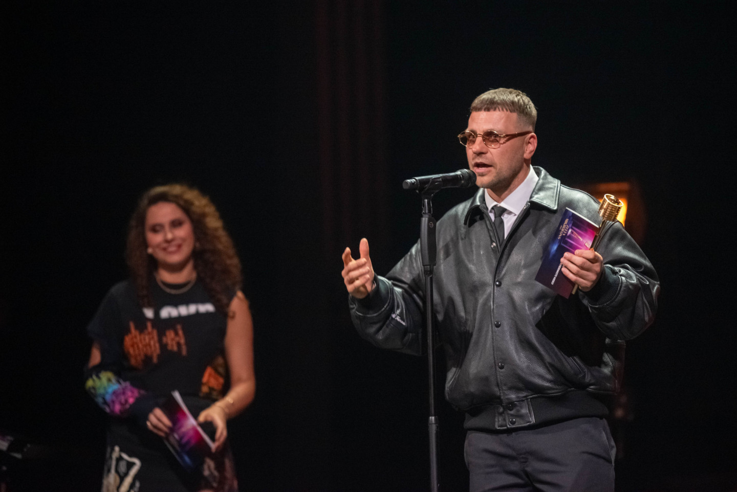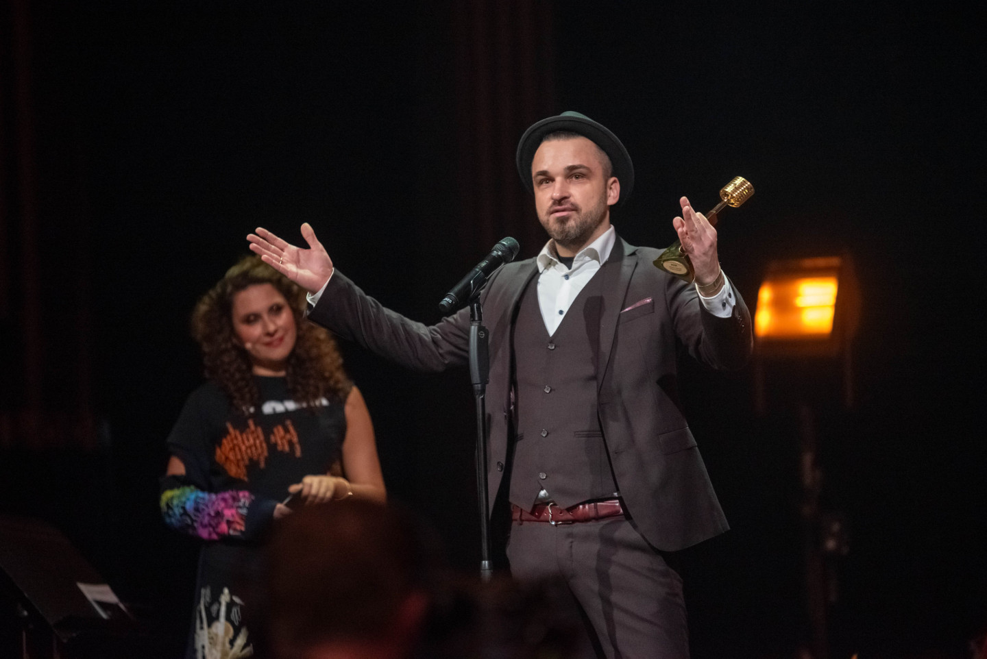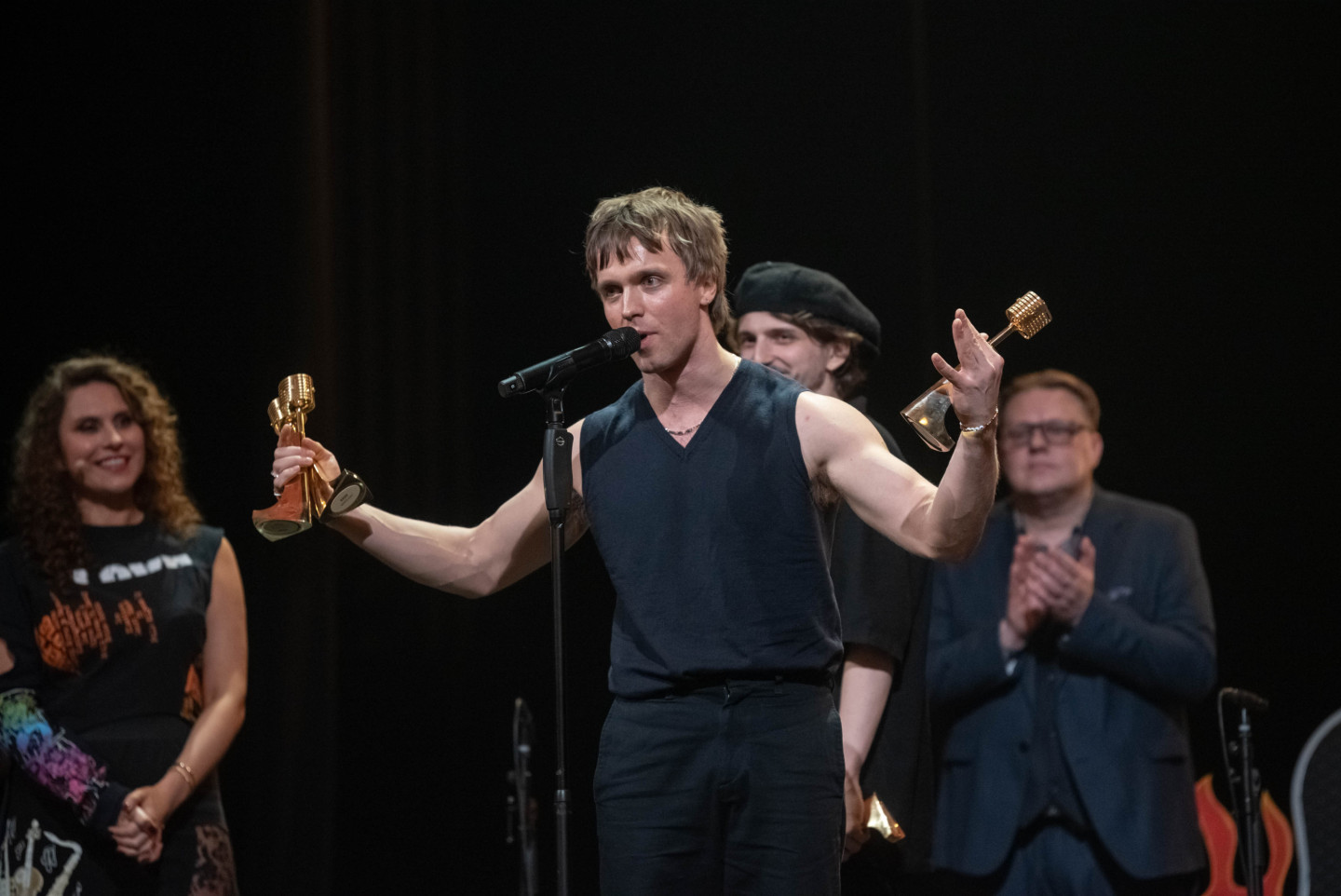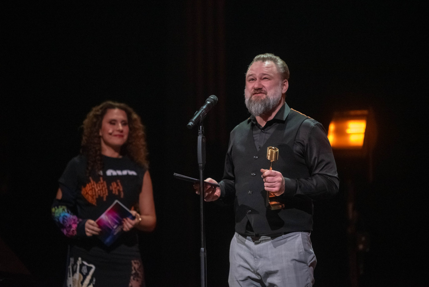 Latvijas Nacionālajā teātrī sestdien tika pasniegtas "Zelta mikrofona" balvas, kur ar piecām saņemtām statuetēm triumfējis mūziķis "Chris Noah".