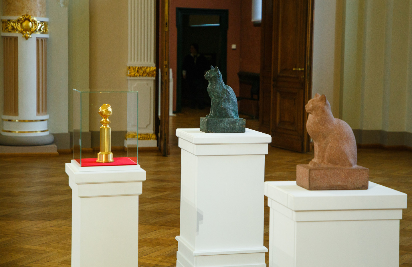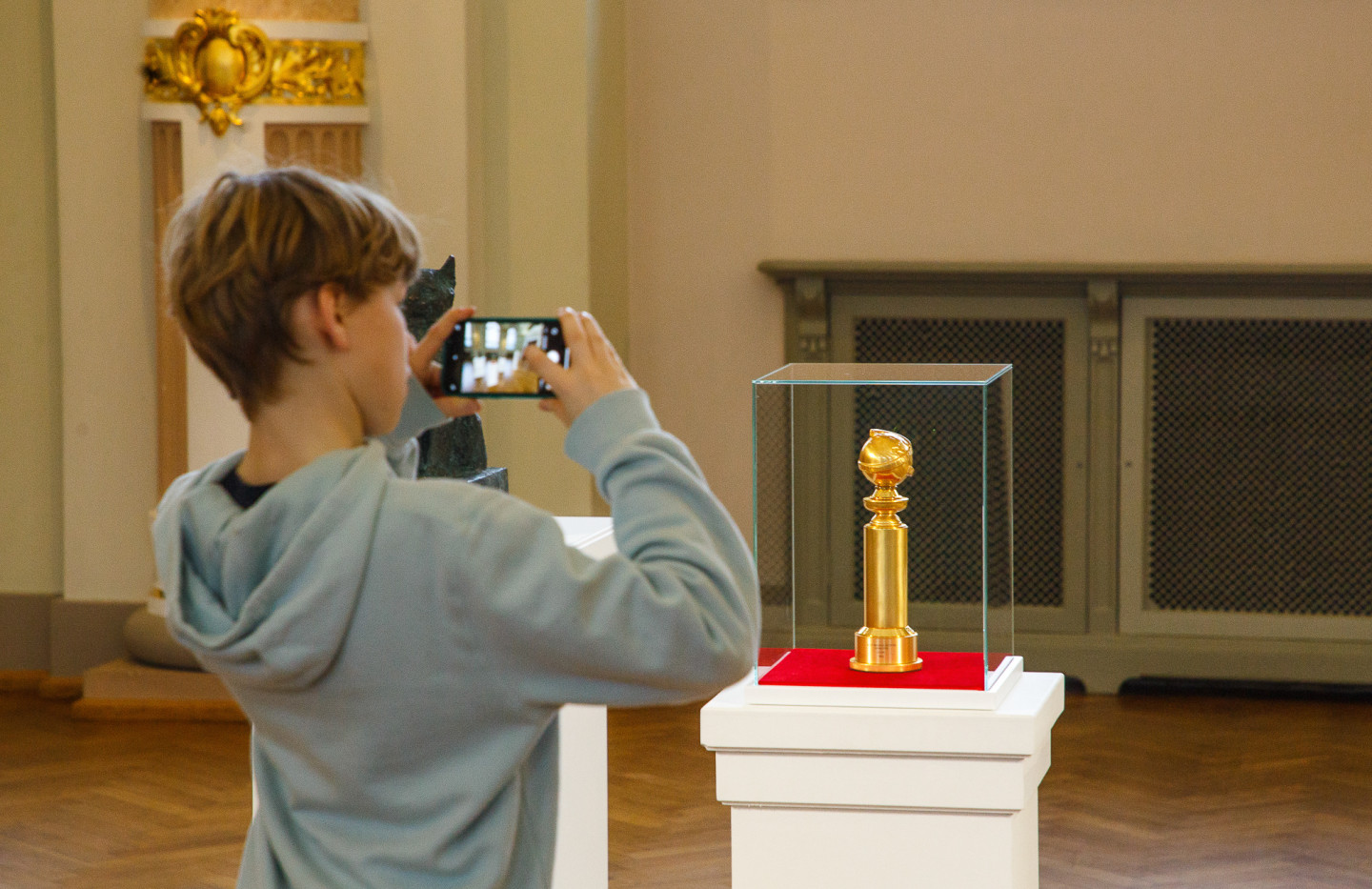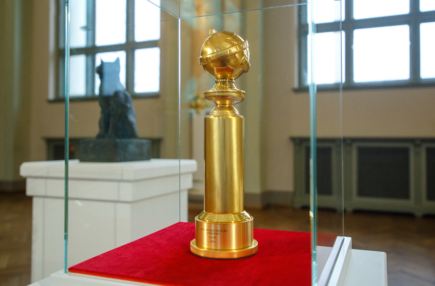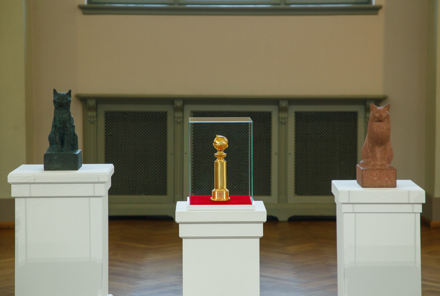 Latvijas Nacionālajā mākslas muzejā īpašā vitrīnā apskatāma režisora Ginta Zilbaloža balva Zelta globuss.