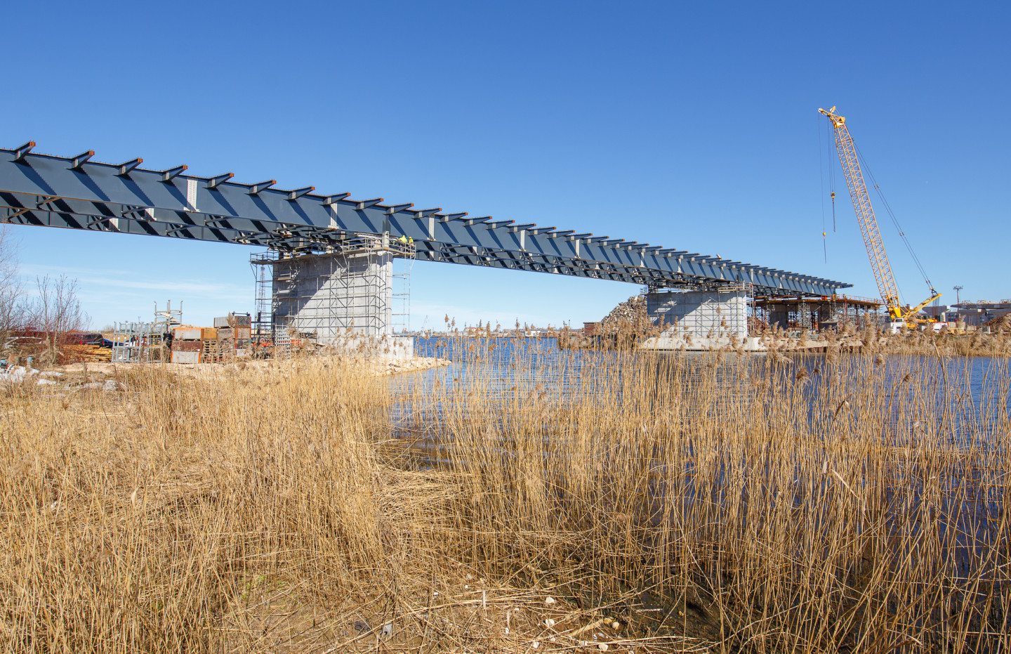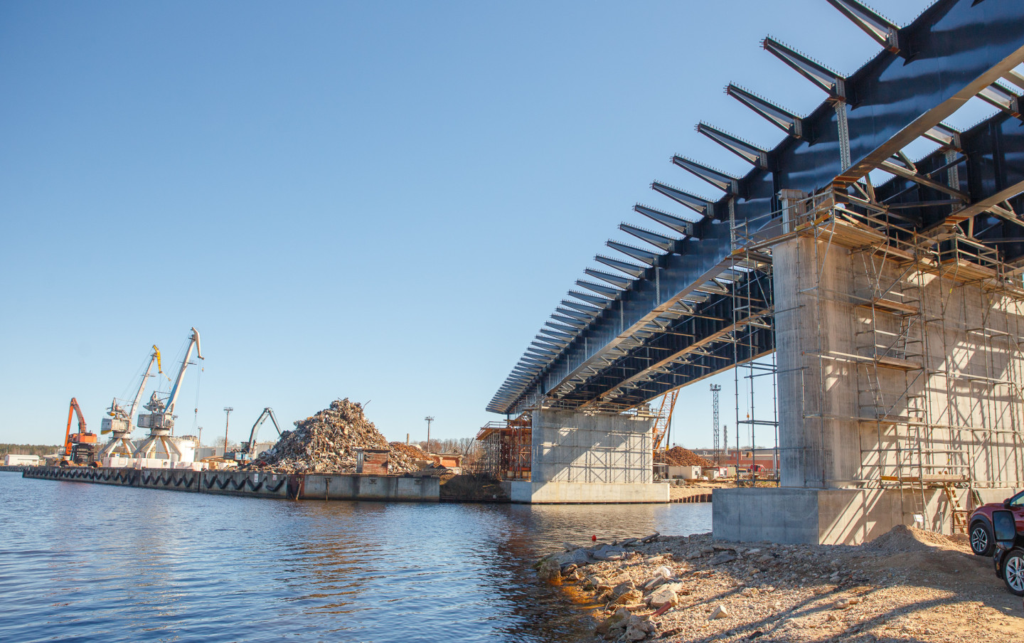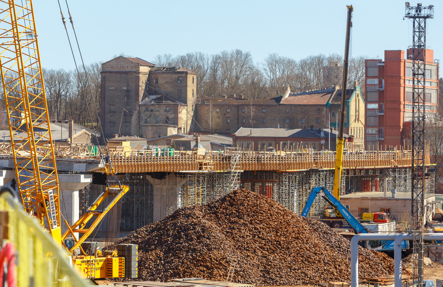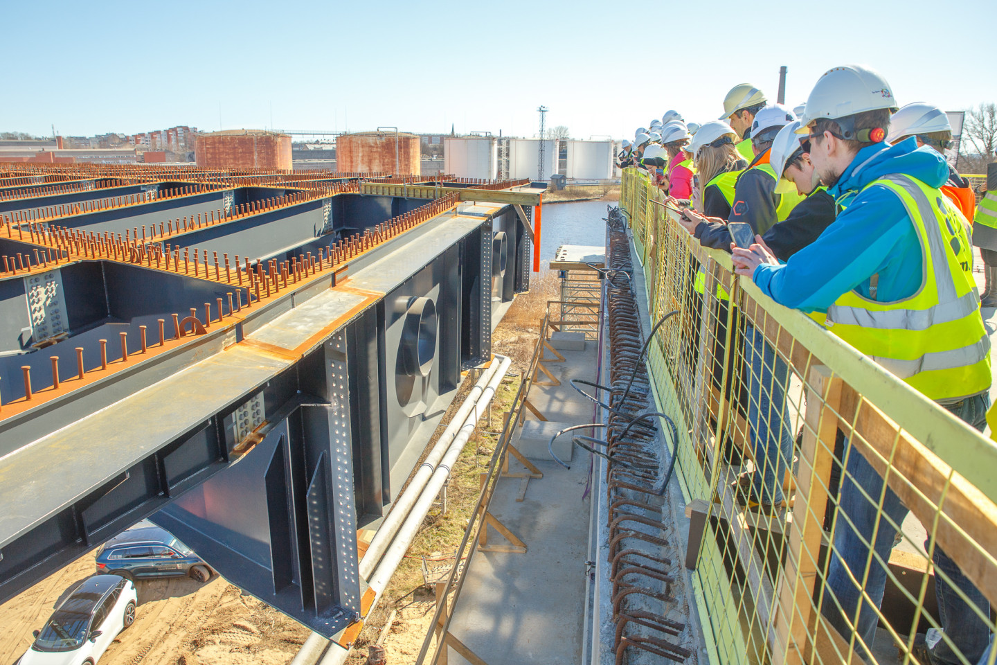Notika satiksmes pārvada no Tvaika ielas uz Kundziņsalu noslēdzošā centrālā tērauda laiduma uzbīdīšana.
