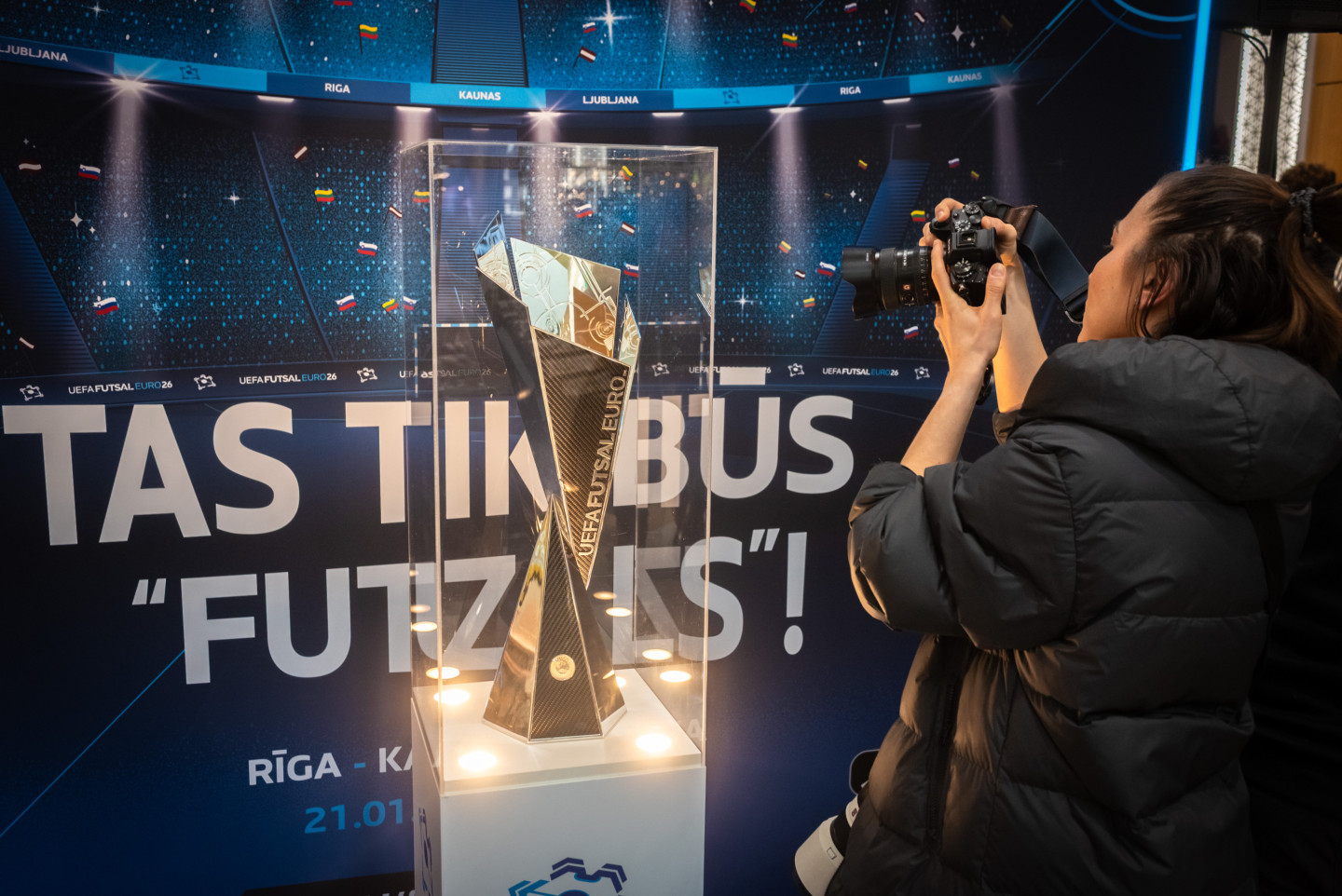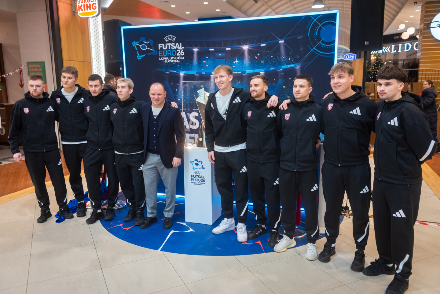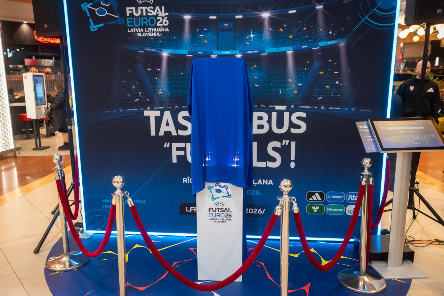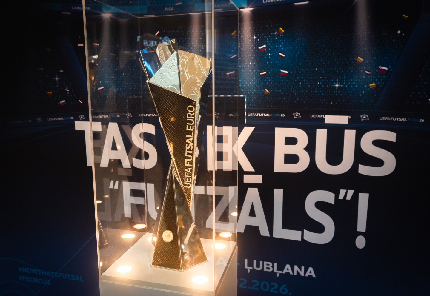 Tirdzniecības centrā "Domina Shopping" apmeklētāji var apskatīt Eiropas čempionāta telpu futbolā galveno trofeju. Pasākumā piedalās Latvijas nacionālās telpu futbola izlases spēlētāji