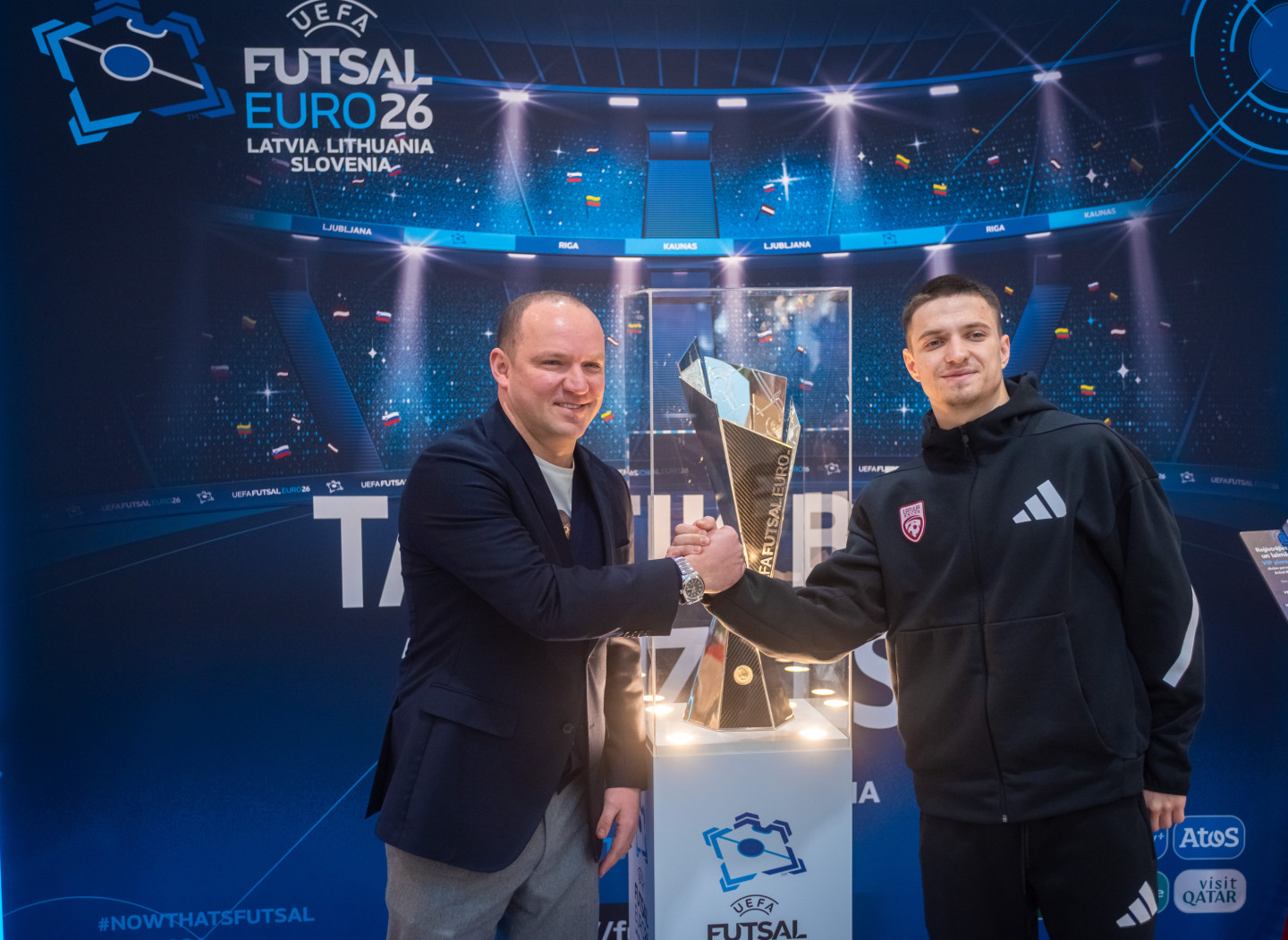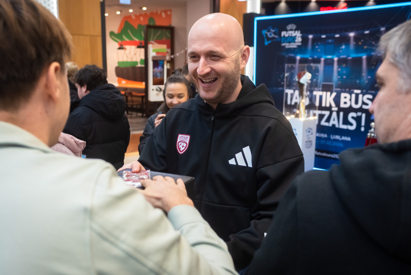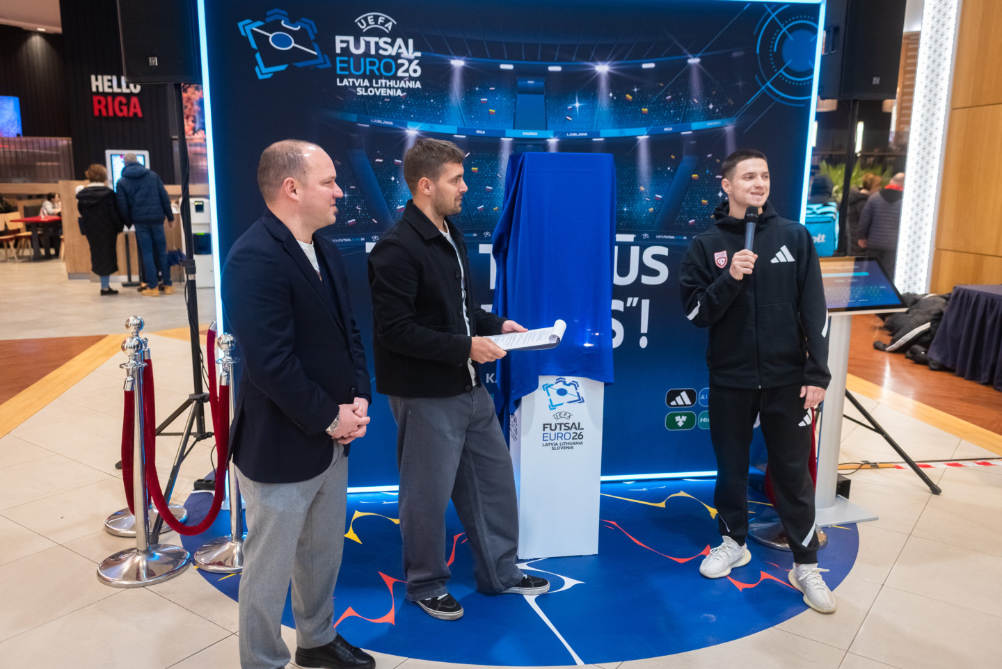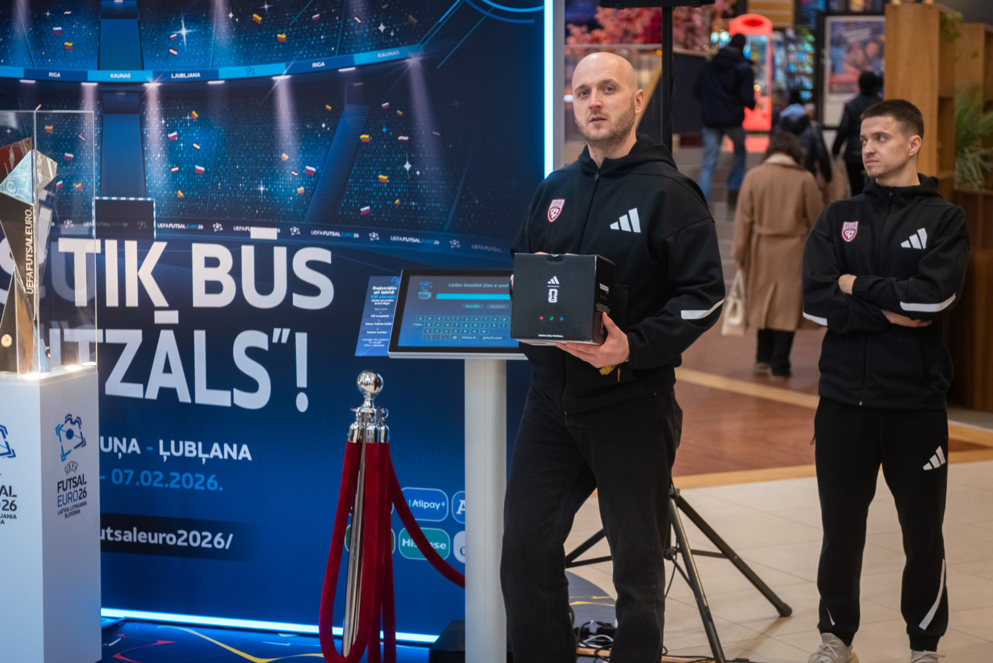 Tirdzniecības centrā "Domina Shopping" apmeklētāji var apskatīt Eiropas čempionāta telpu futbolā galveno trofeju. Pasākumā piedalās Latvijas nacionālās telpu futbola izlases spēlētāji