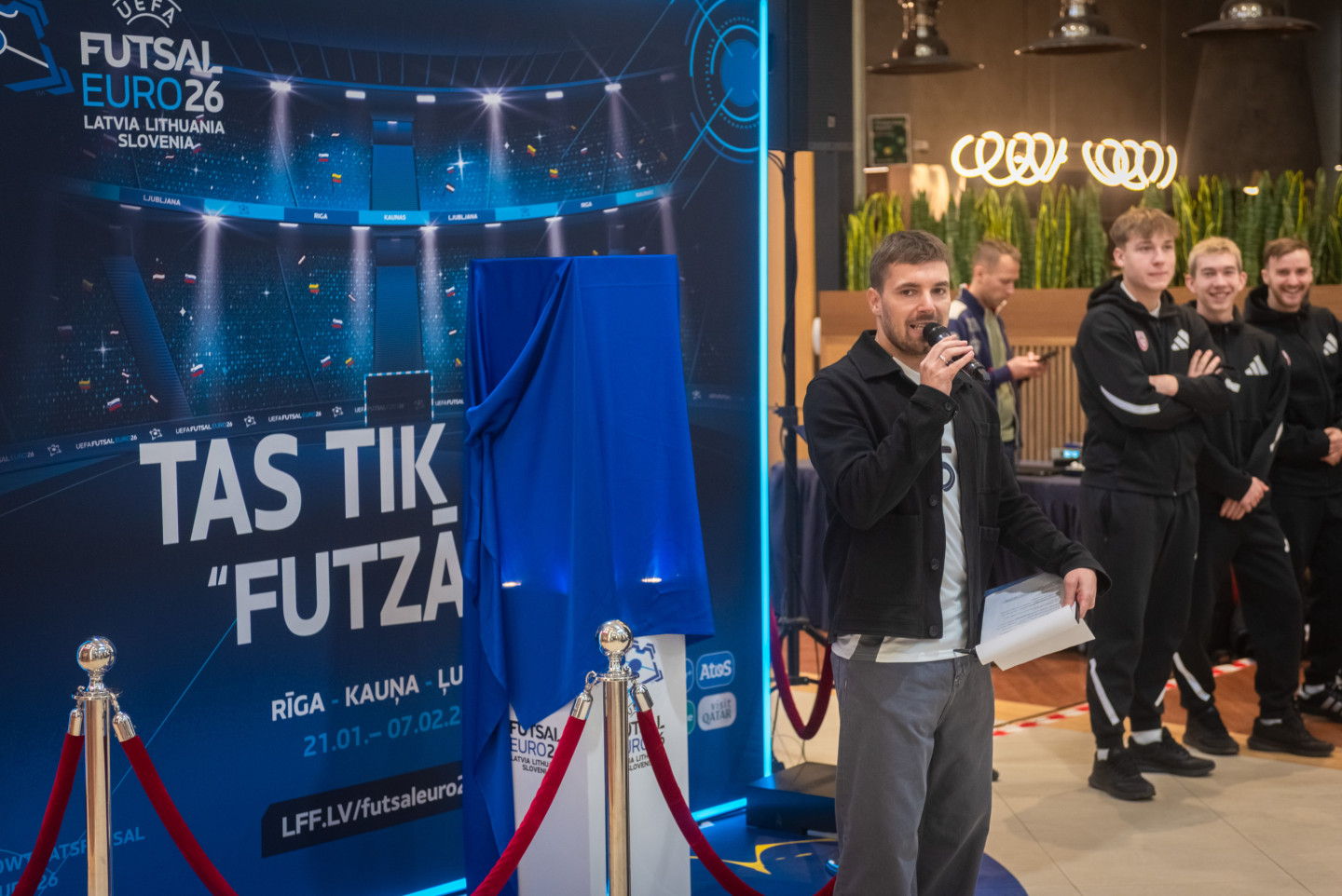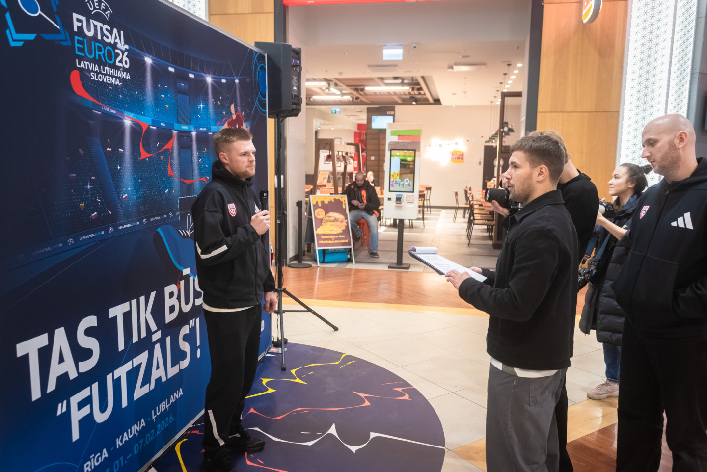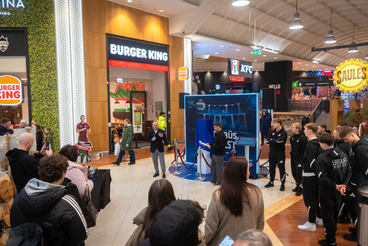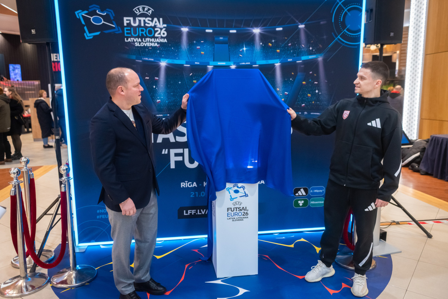 Tirdzniecības centrā "Domina Shopping" apmeklētāji var apskatīt Eiropas čempionāta telpu futbolā galveno trofeju. Pasākumā piedalās Latvijas nacionālās telpu futbola izlases spēlētāji