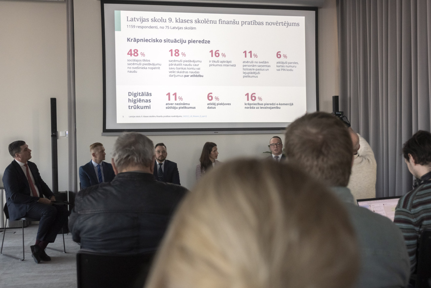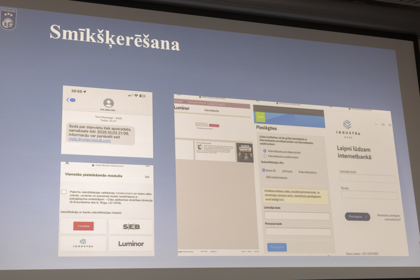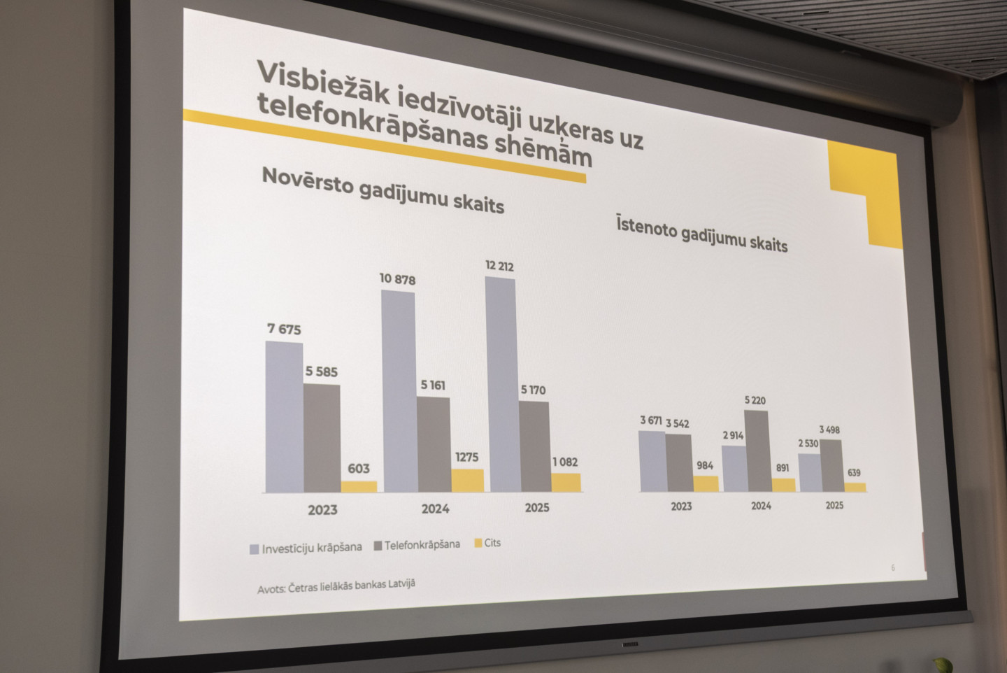 Biroja centrā "Verde" zālē "Medus" Finanšu nozares asociācija sadarbībā ar Valsts policiju, "Cert.lv" un Latvijas Banku rīko informatīvu pasākumu, lai pievērstu sabiedrības uzmanību krāpšanas apmēriem un aktuālākajām noziedznieku metodēm