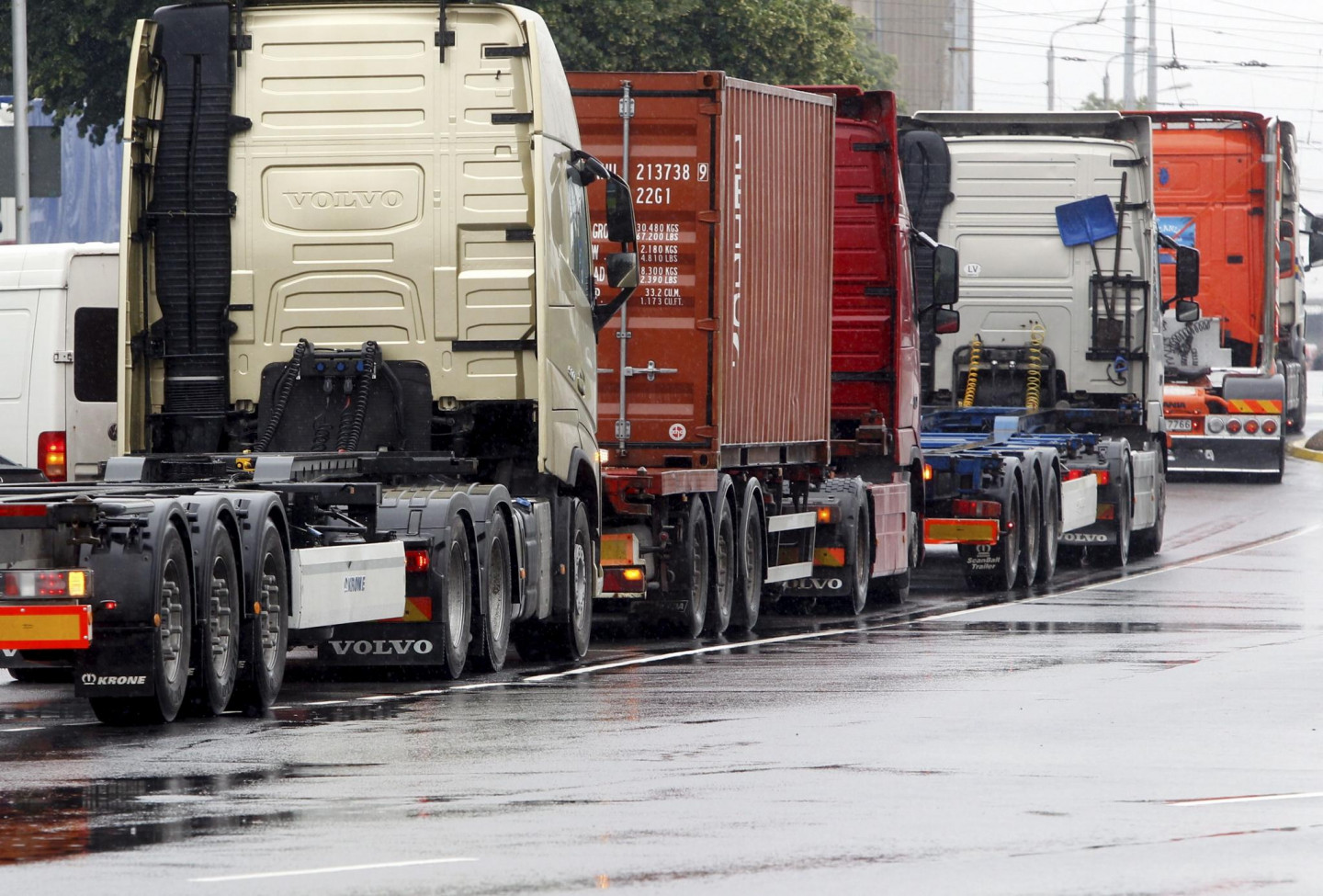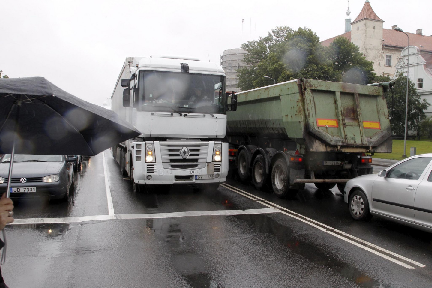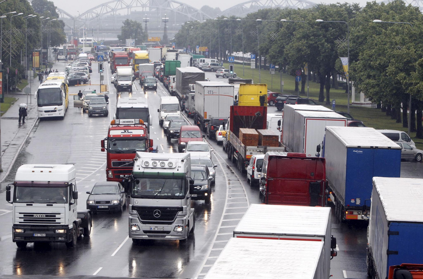 Protestējot pret tā dēvētās eirovinjetes ieviešanu Latvijā, Rīgas centru šodien pārpludinājušas kravas automašīnu karavānas, bloķējot satiksmi 11.novembra krastmalā.