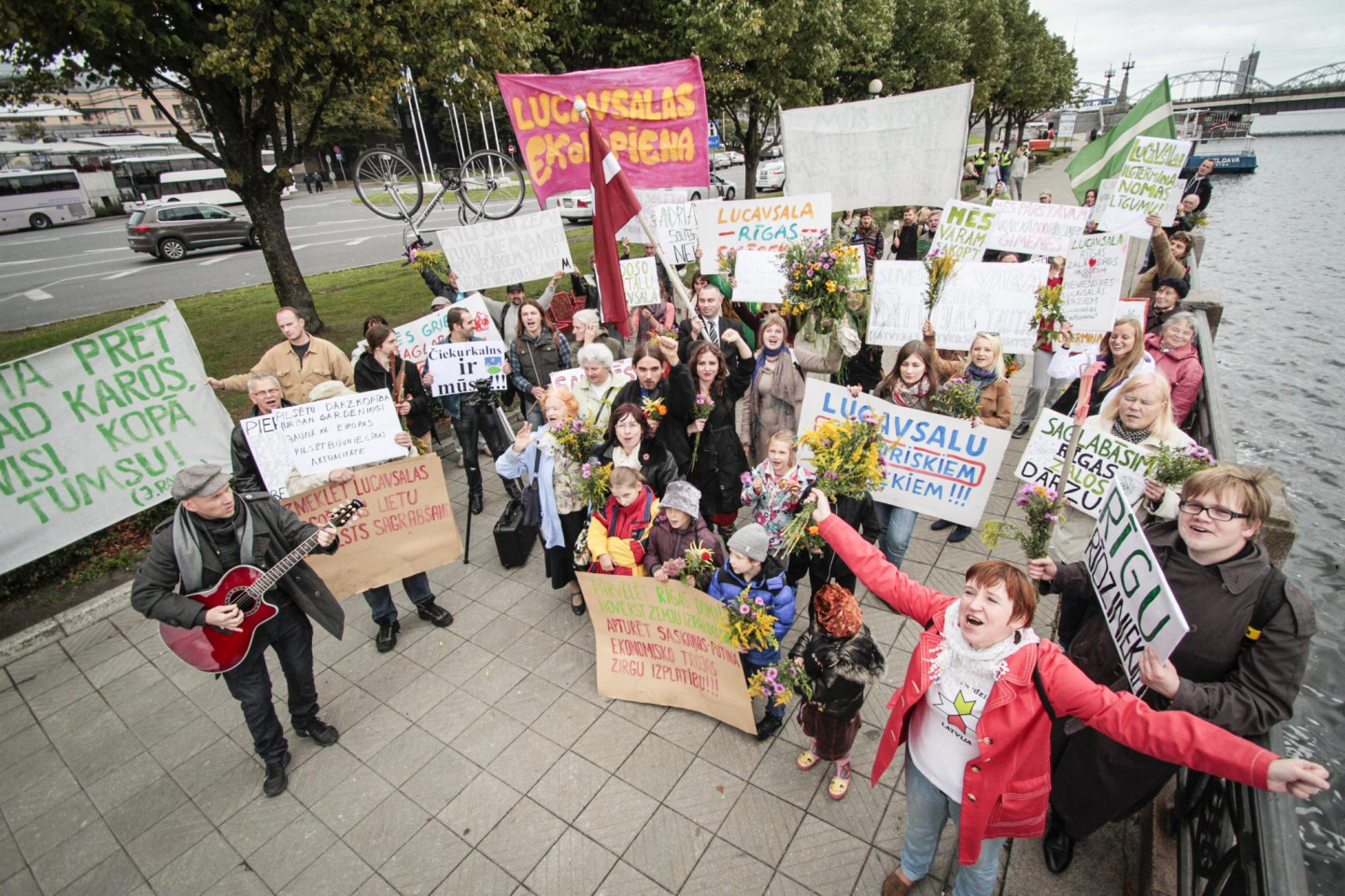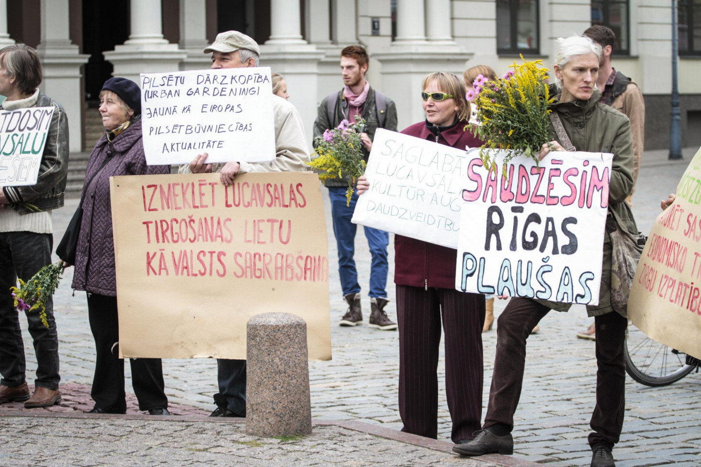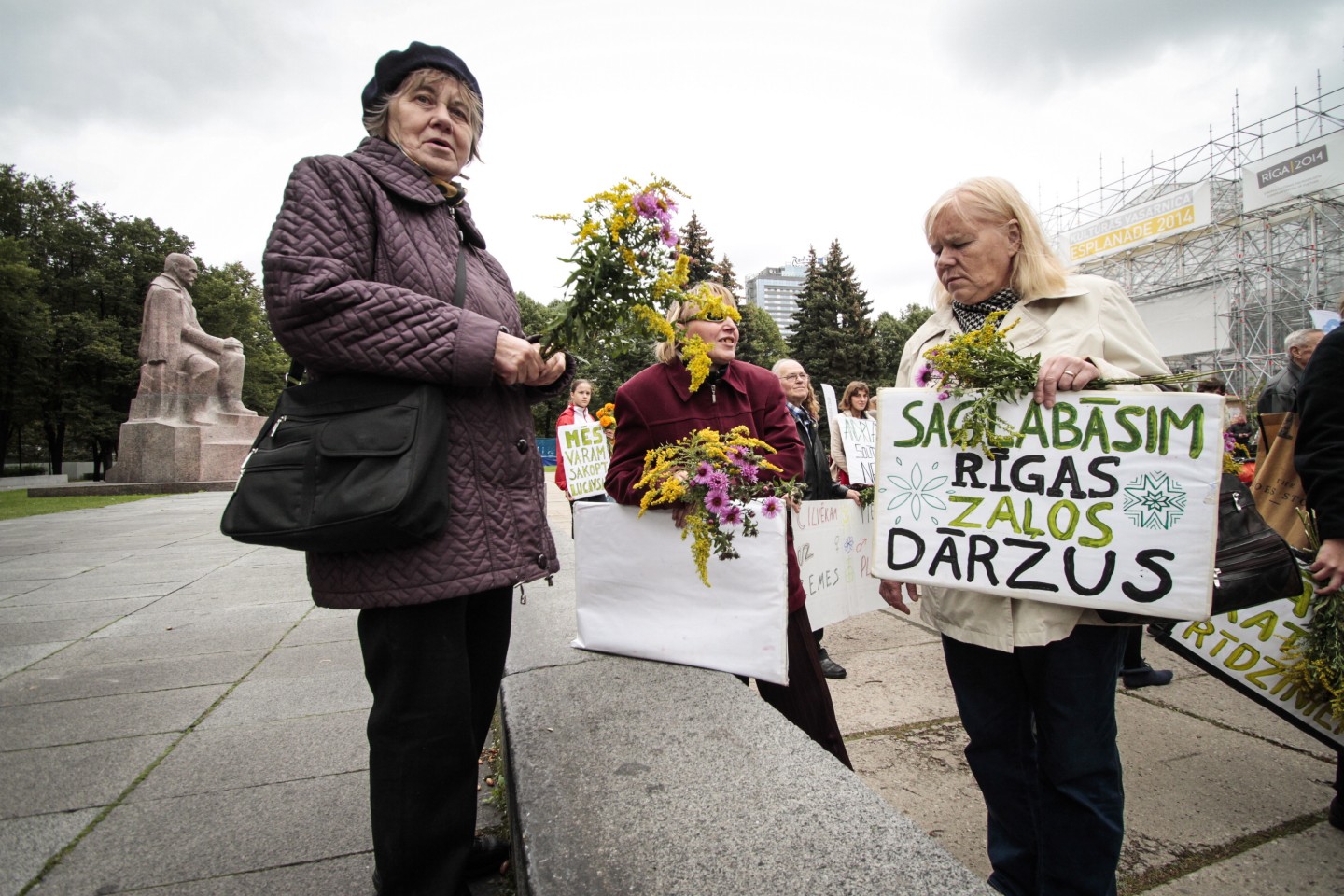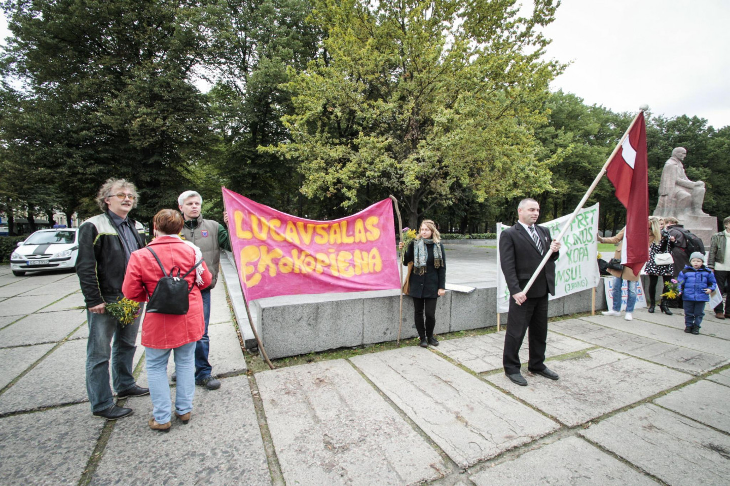 Daži desmiti cilvēku svētdien, 28.septembrī, pie Raiņa pieminekļa Esplanādē pulcējās Lucavsalas aizsardzības biedrības rīkotajam gājienam pret Lucavsalas pārdošanu.
