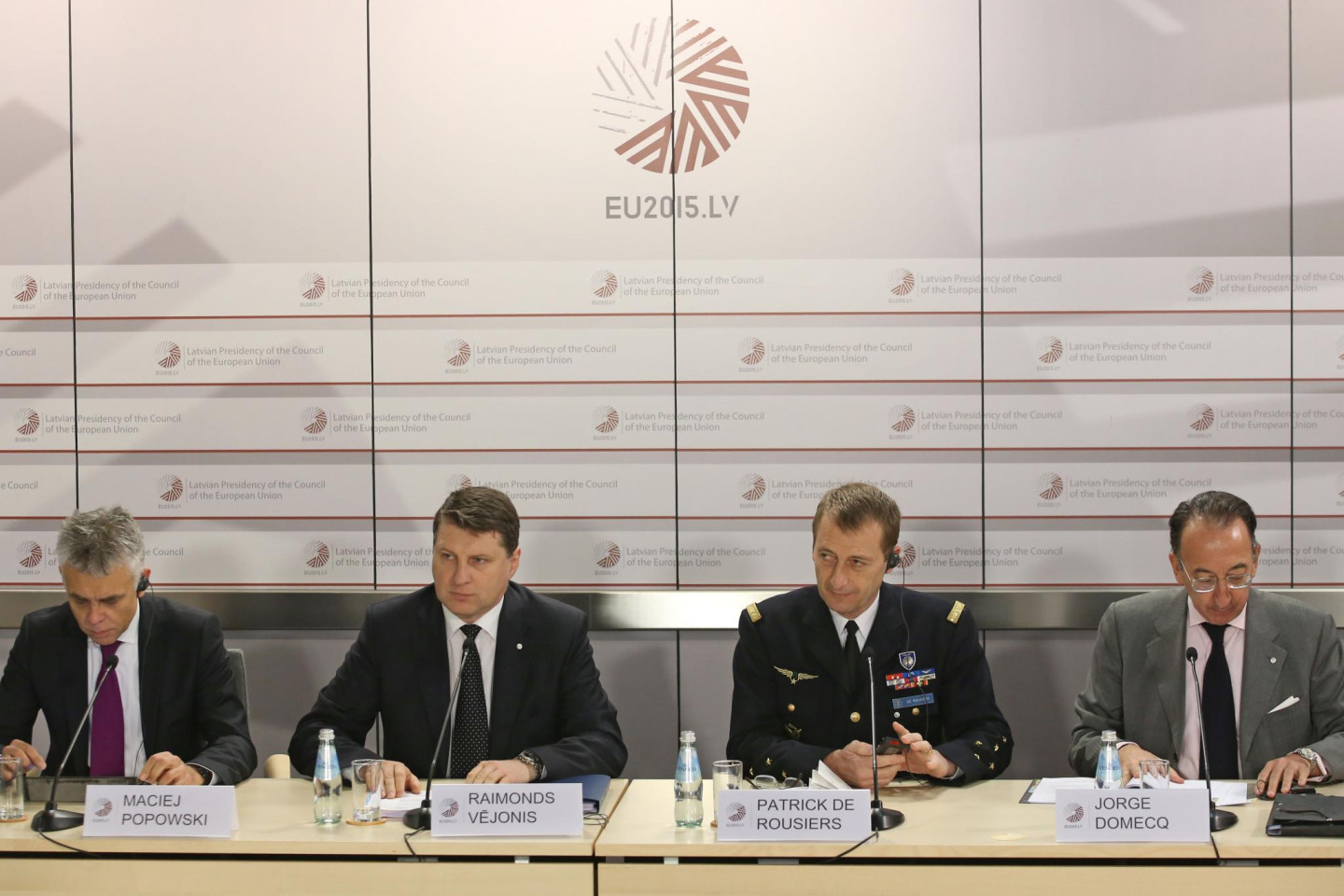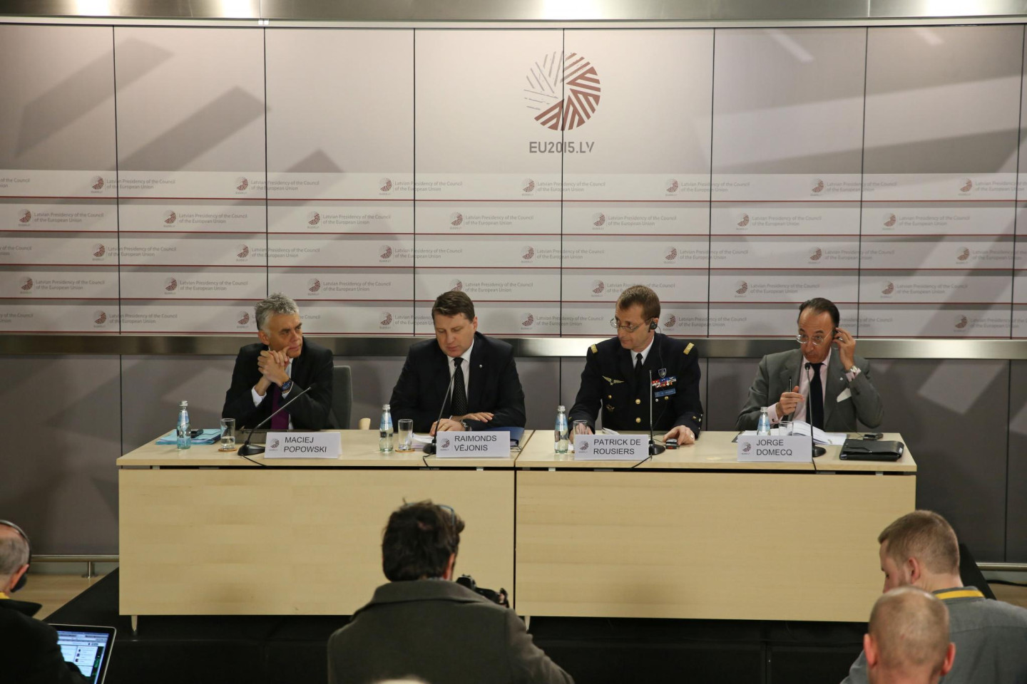No 18. līdz 19. februārim Latvijas Nacionālajā bibliotēkā norisinās ES aizsardzības ministru neformālā sanāksme, gatavojoties 2015. gada jūnija Eiropadomes diskusijai par aizsardzību, kas ir būtiskākais aizsardzības jomas notikums Latvijas prezidentūras laikā. ES aizsardzības ministri diskutē par iepriekšējās Eiropadomes secinājumu ieviešanu, hibrīddraudiem un stratēģisko komunikāciju, ES starptautiskajām operācijām un ES Kaujas grupu izmantošanu, kā arī izmaiņām starptautiskajā drošībā. Sanāksmē piedalās 28 ES dalībvalstu ministri, ES Augstā pārstāve ārlietās un drošības politikas jautājumos un Eiropas Komisijas priekšsēdētāja vietniece Federika Mogerīnī, ES operāciju komandieri, tai skaitā, NATO Sabiedroto spēku augstākās virspavēlniecības Eiropā komandiera vietnieks ģenerālis Adrians Bredšovs, kurš šobrīd ir ES militārās operācijas ALTHEA Bosnijā un Hercegovinā komandieris, un NATO ģenerālsekretārs Jenss Stoltenbergs.