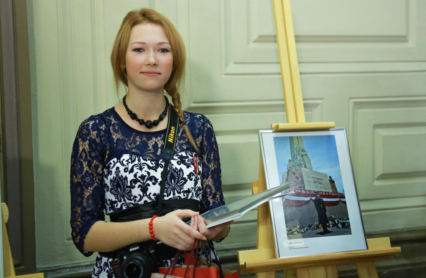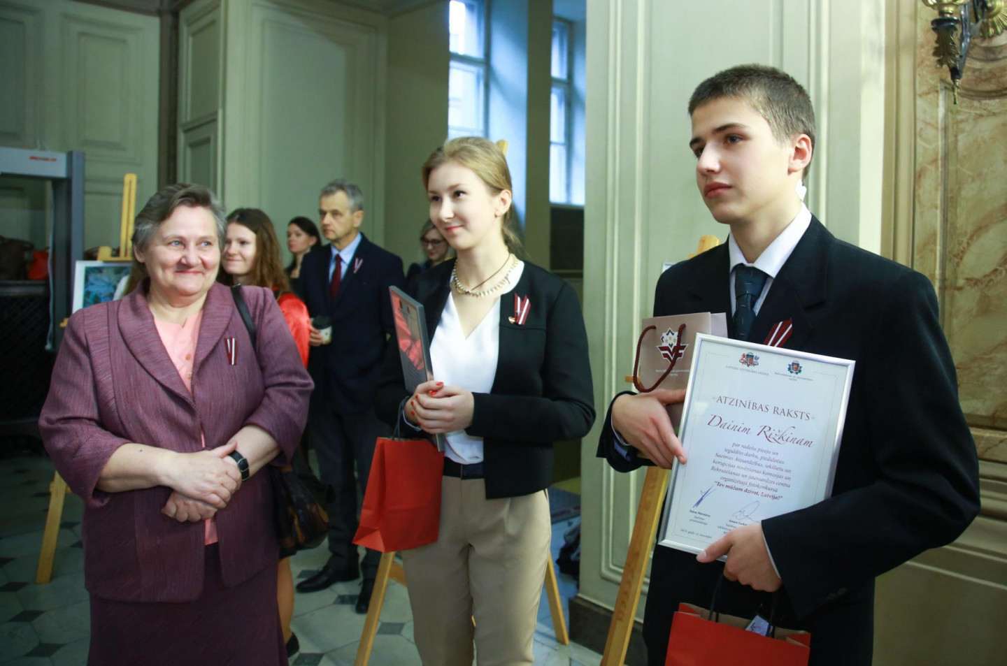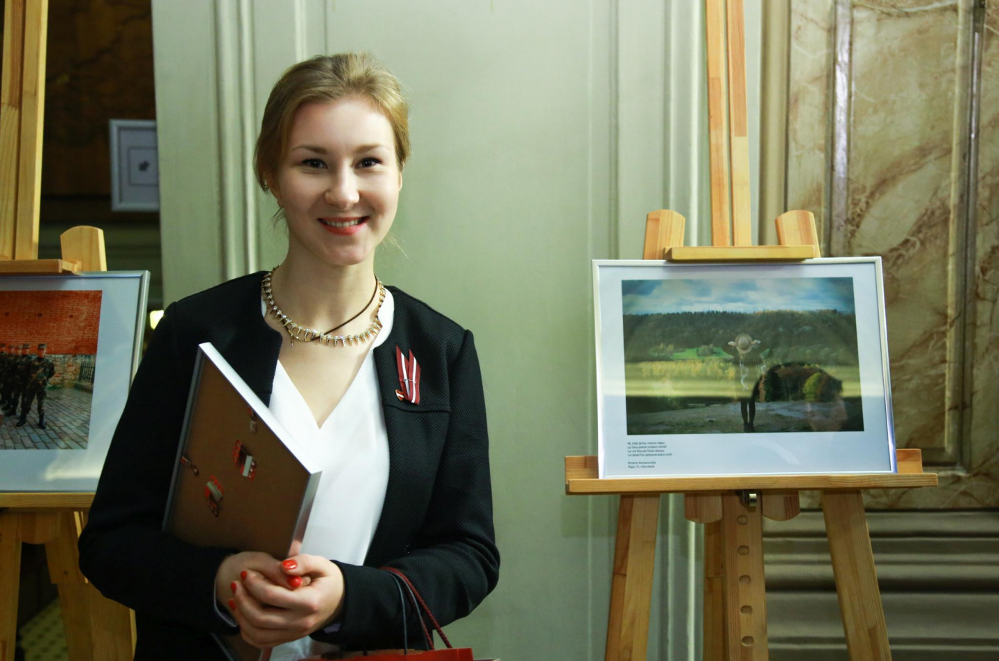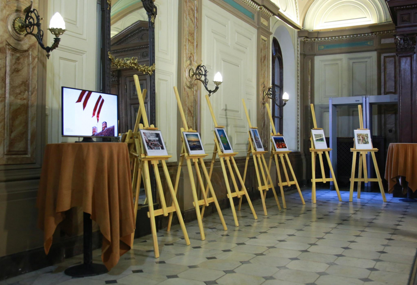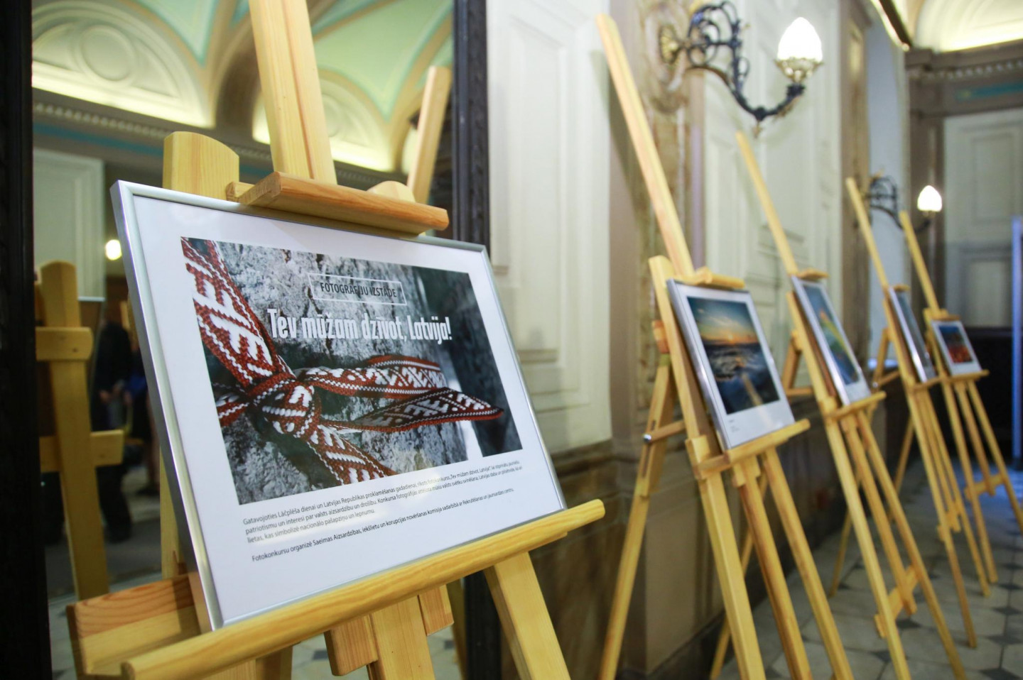 Saeimas nama Lielajā vestibilā tika atklāta valsts svētkiem veltītā jauniešu fotogrāfiju konkursa “Tev mūžam dzīvot, Latvija!” uzvarētāju darbu izstāde un sveikti fotodarbu autori.