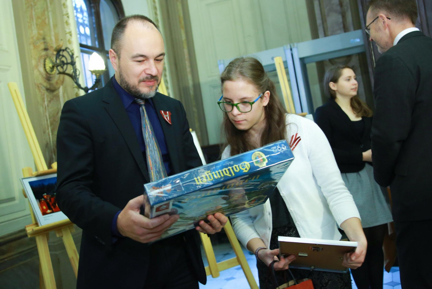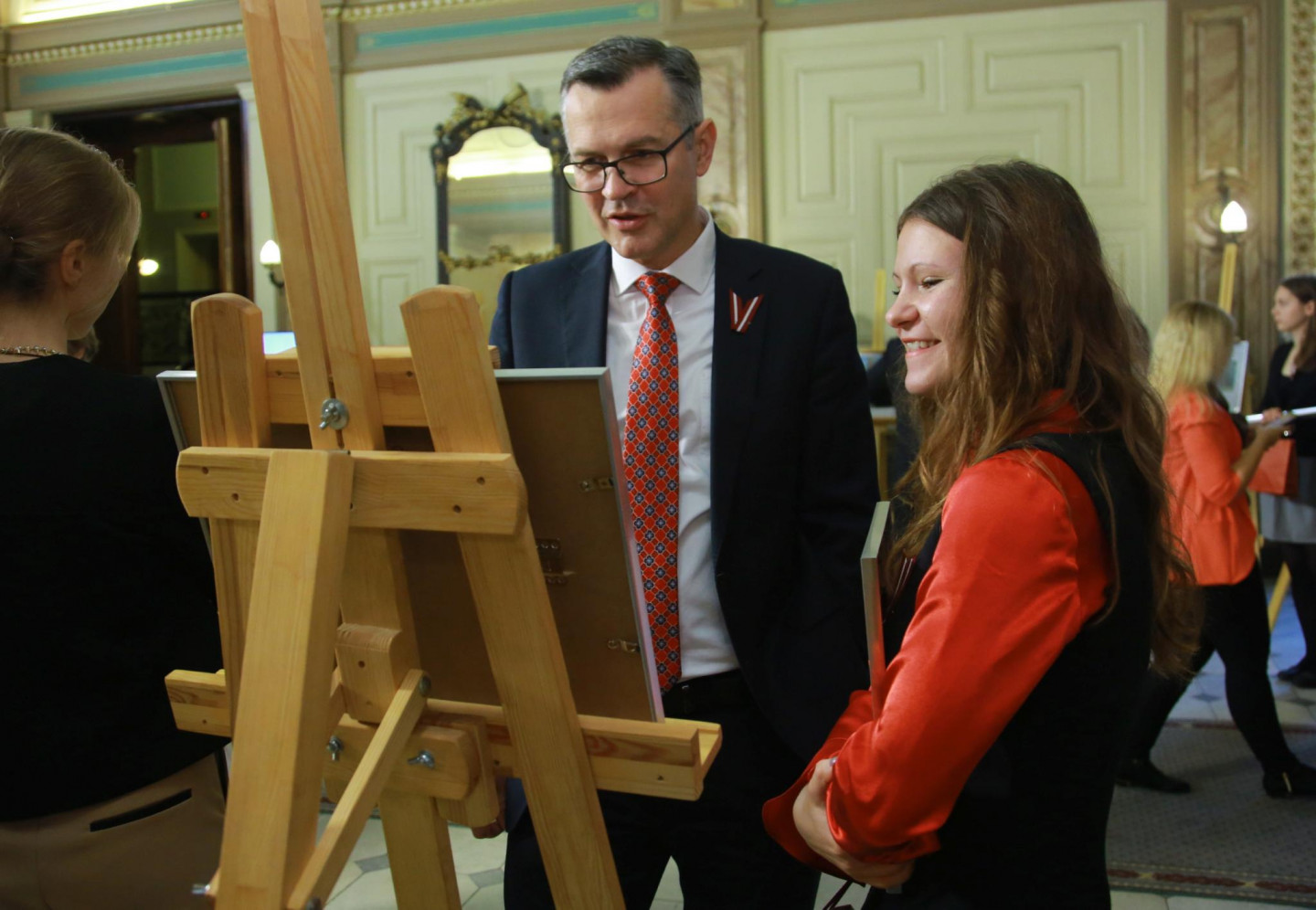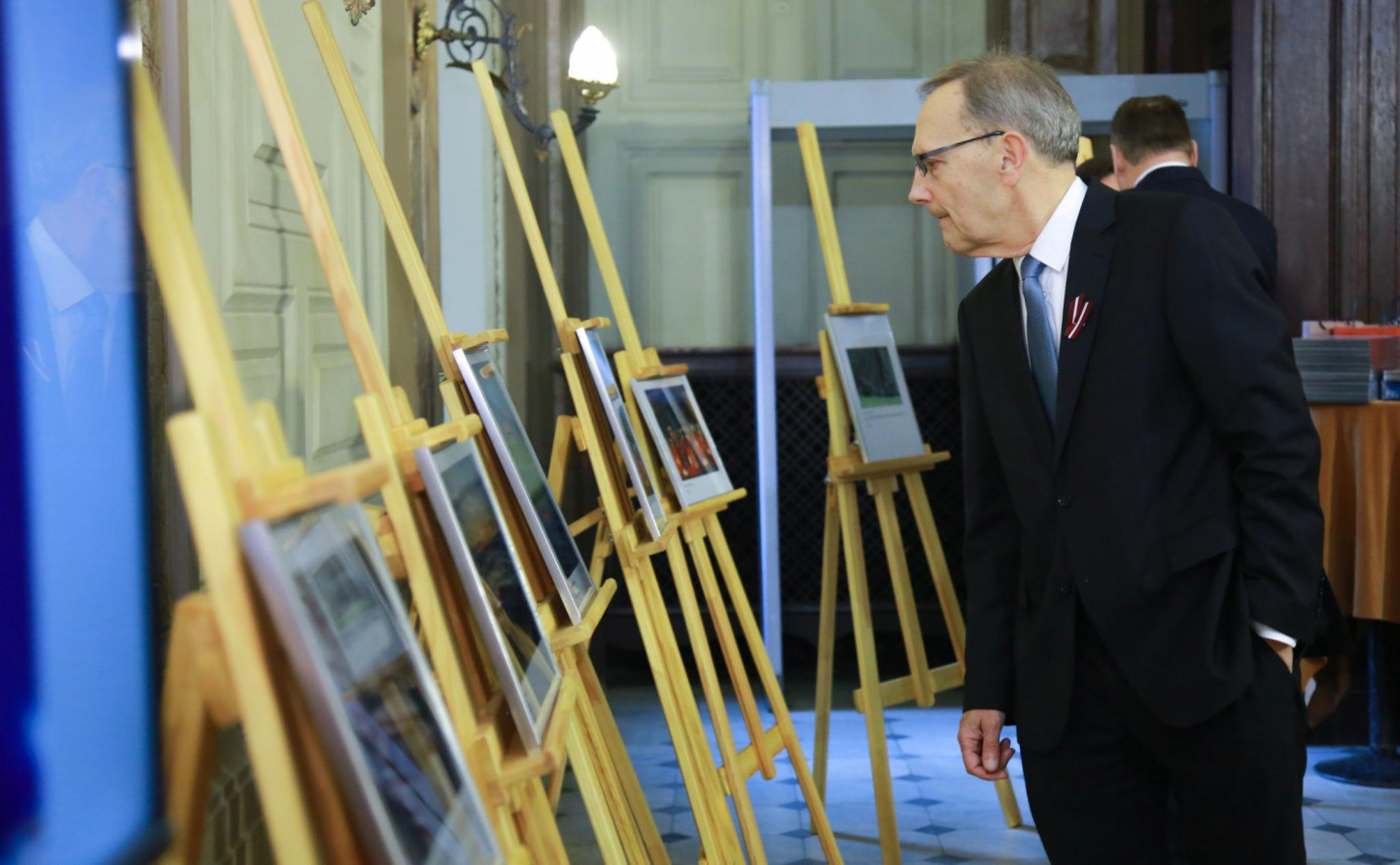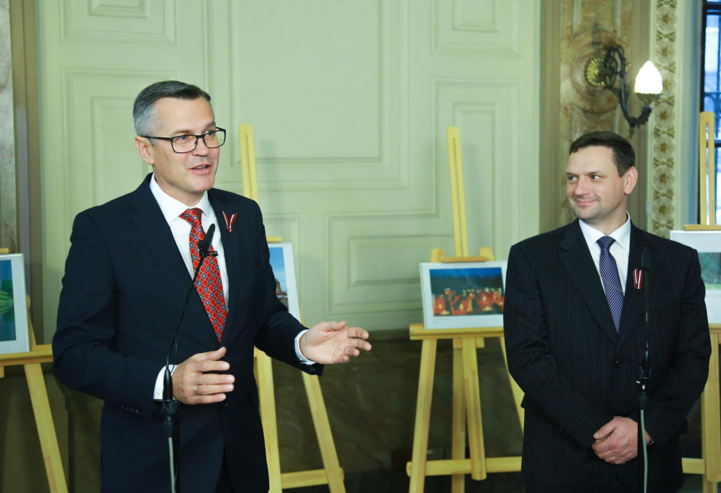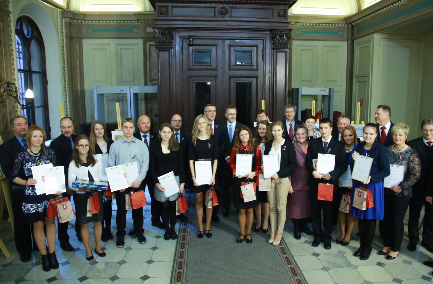 Saeimas nama Lielajā vestibilā tika atklāta valsts svētkiem veltītā jauniešu fotogrāfiju konkursa “Tev mūžam dzīvot, Latvija!” uzvarētāju darbu izstāde un sveikti fotodarbu autori.