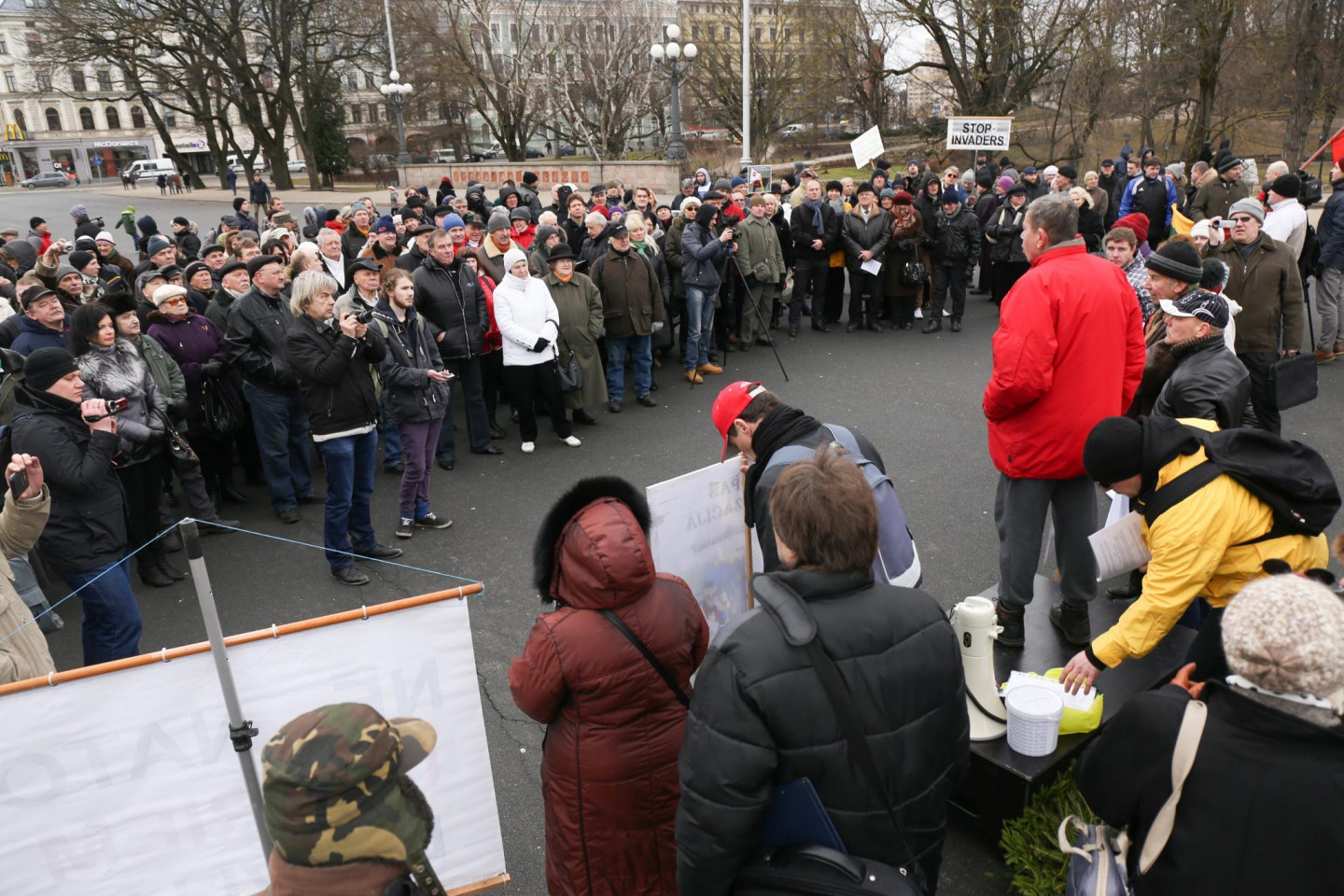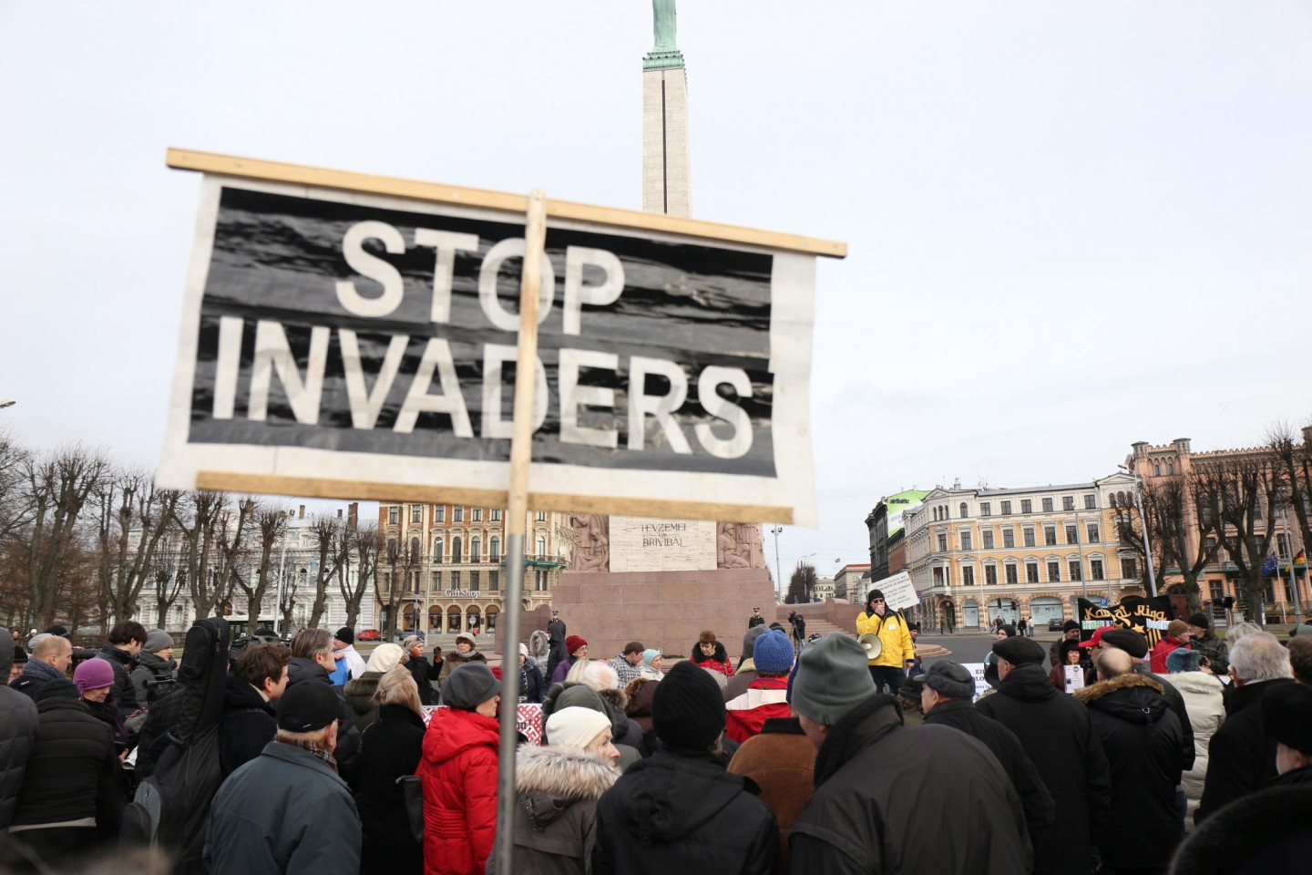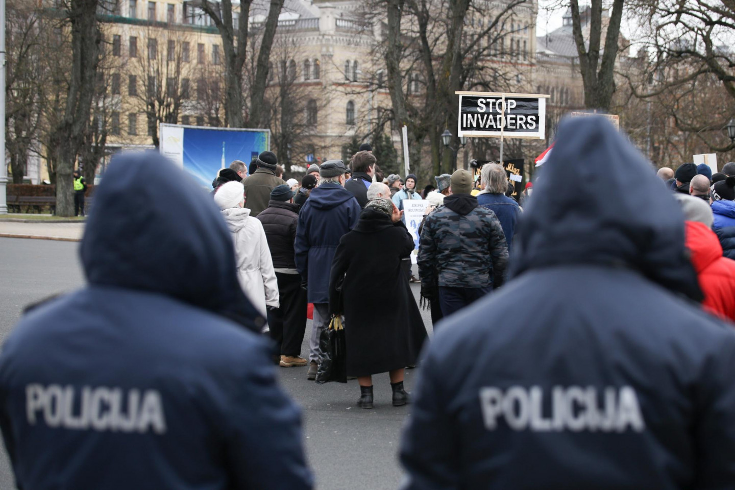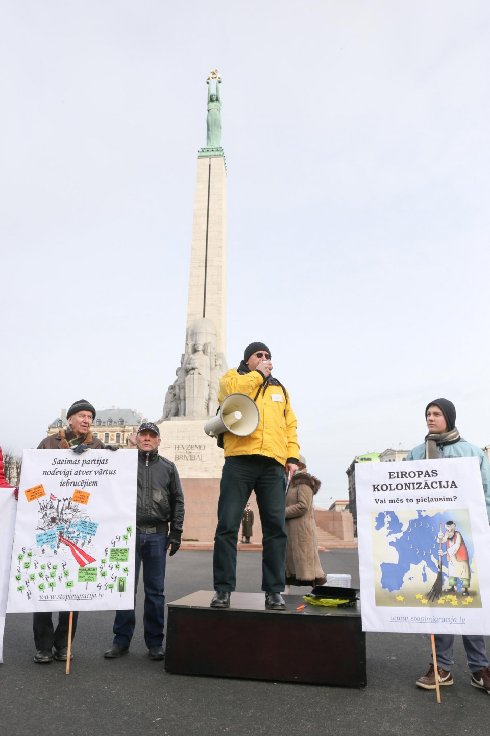 Šodien pie Brīvības pieminekļa Rīgā pulcējās aptuveni 200 cilvēki, kuri piedalījās protestā "pret masu imigrāciju".