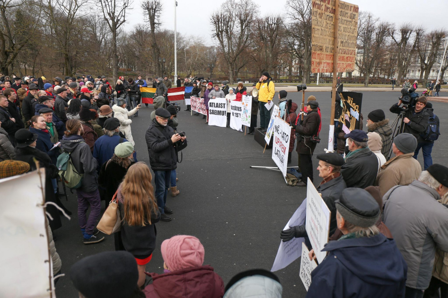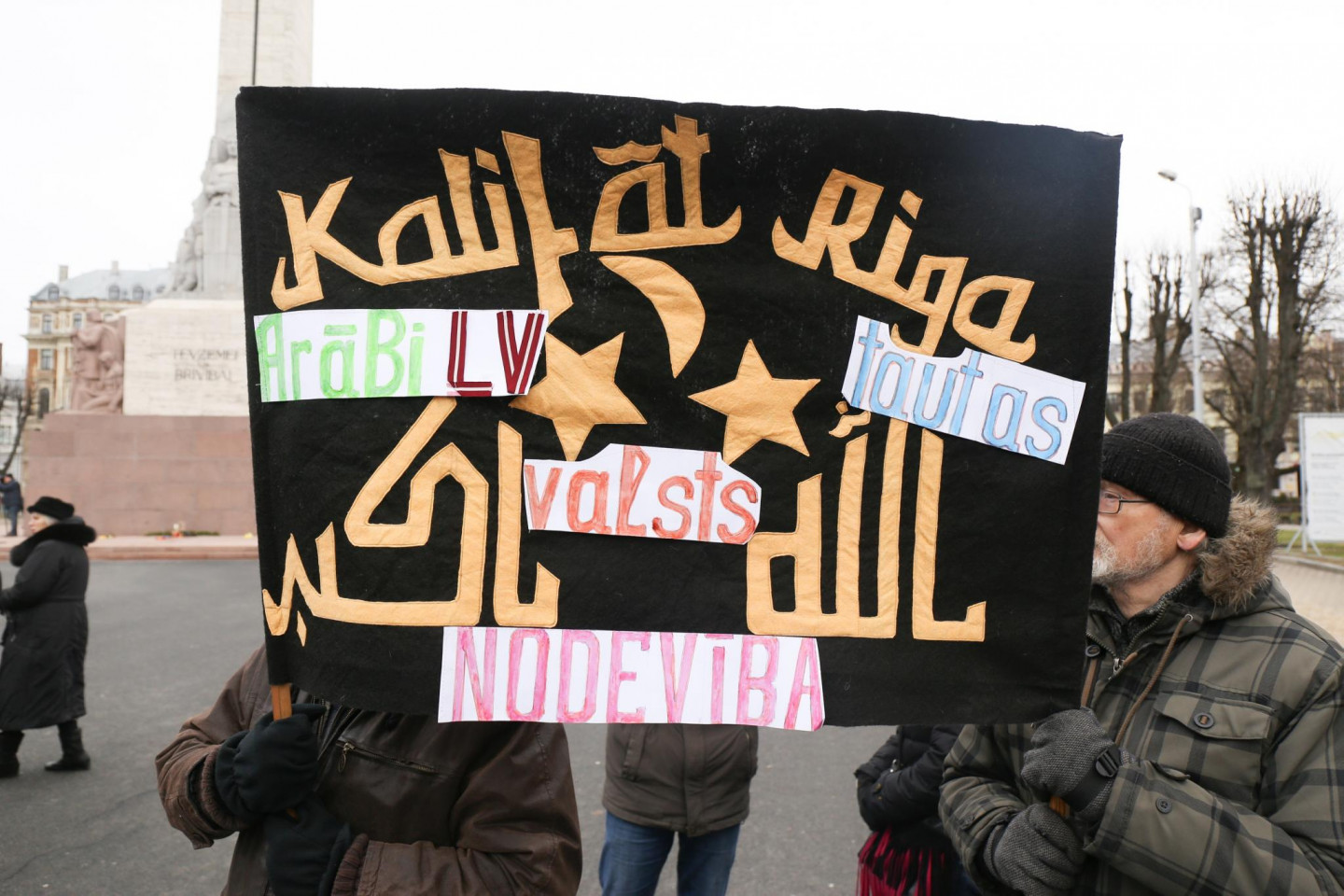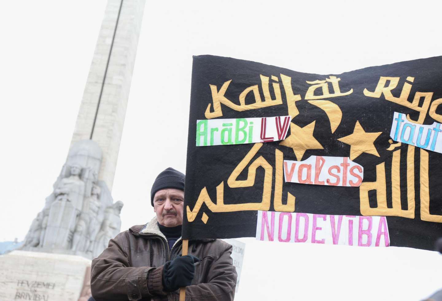 Šodien pie Brīvības pieminekļa Rīgā pulcējās aptuveni 200 cilvēki, kuri piedalījās protestā "pret masu imigrāciju".
