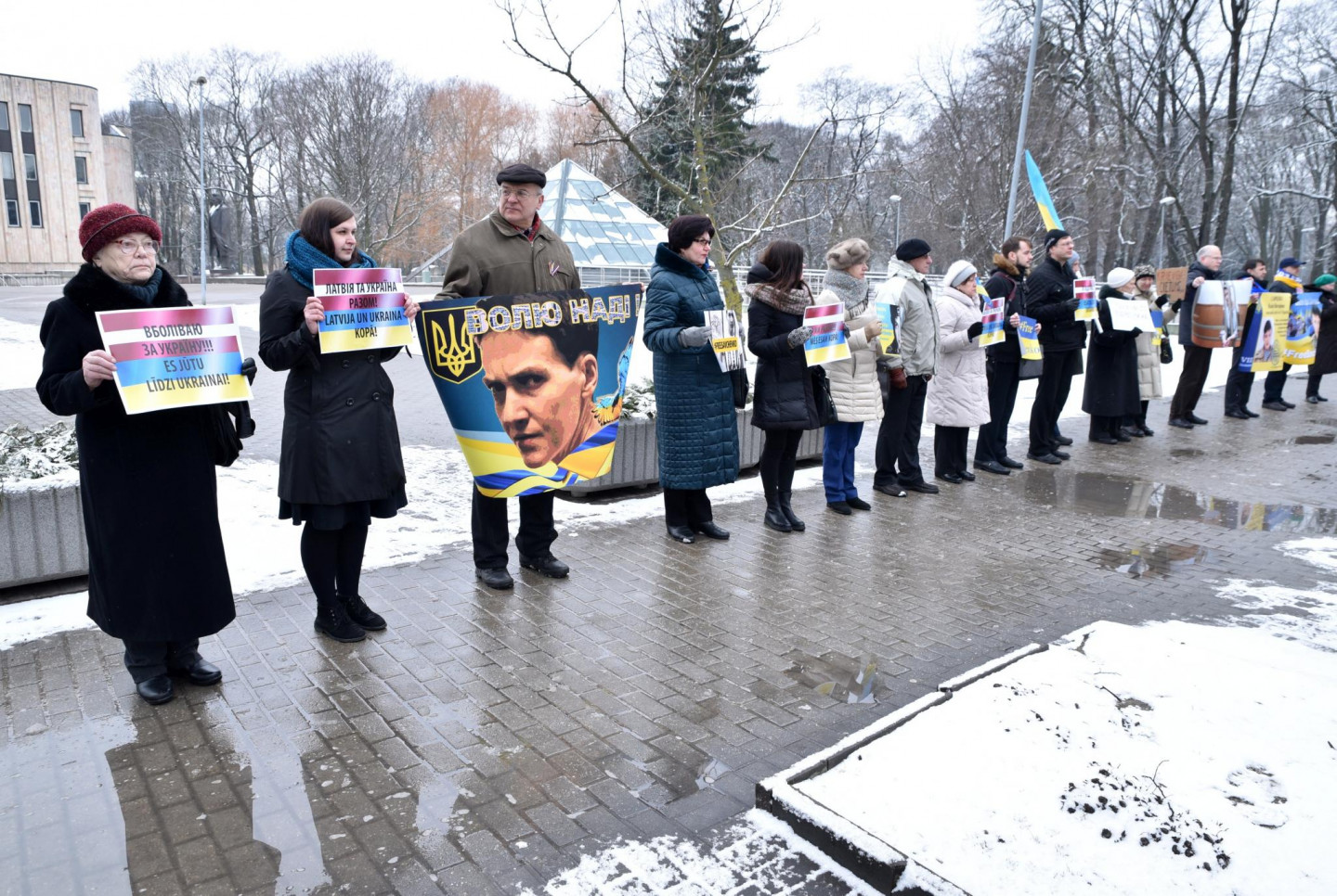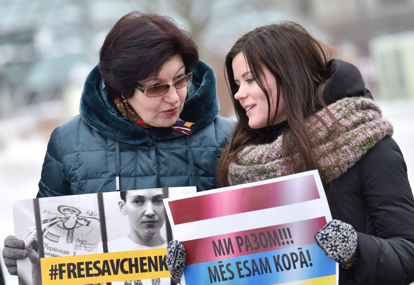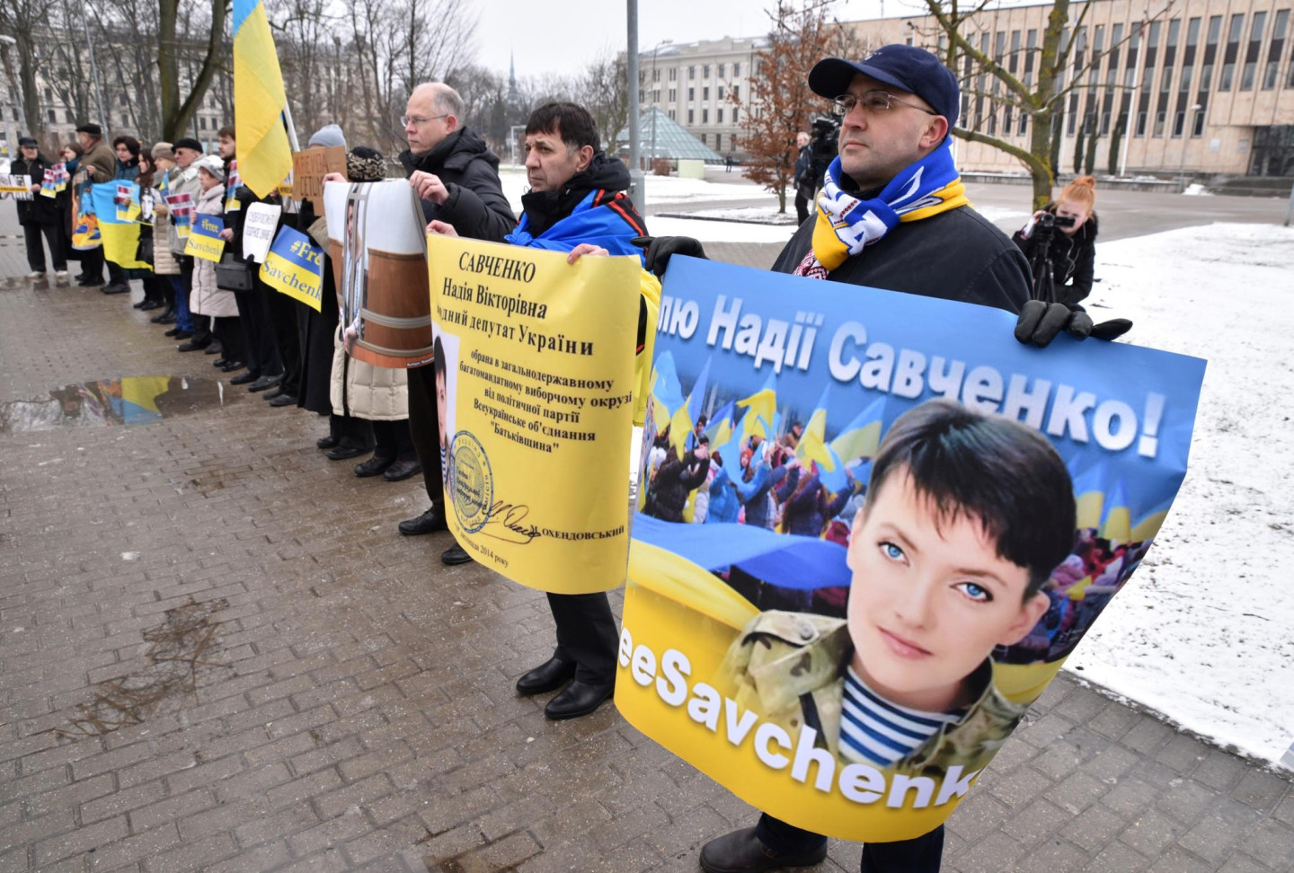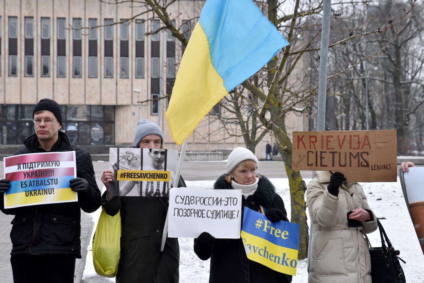Ap 20 cilvēku iepretim Krievijas vēstniecībai šodien pauda atbalstu ukraiņu pilotei Nadijai Savčenko.