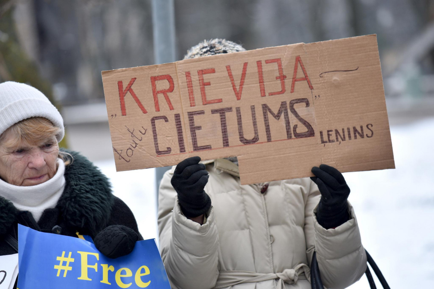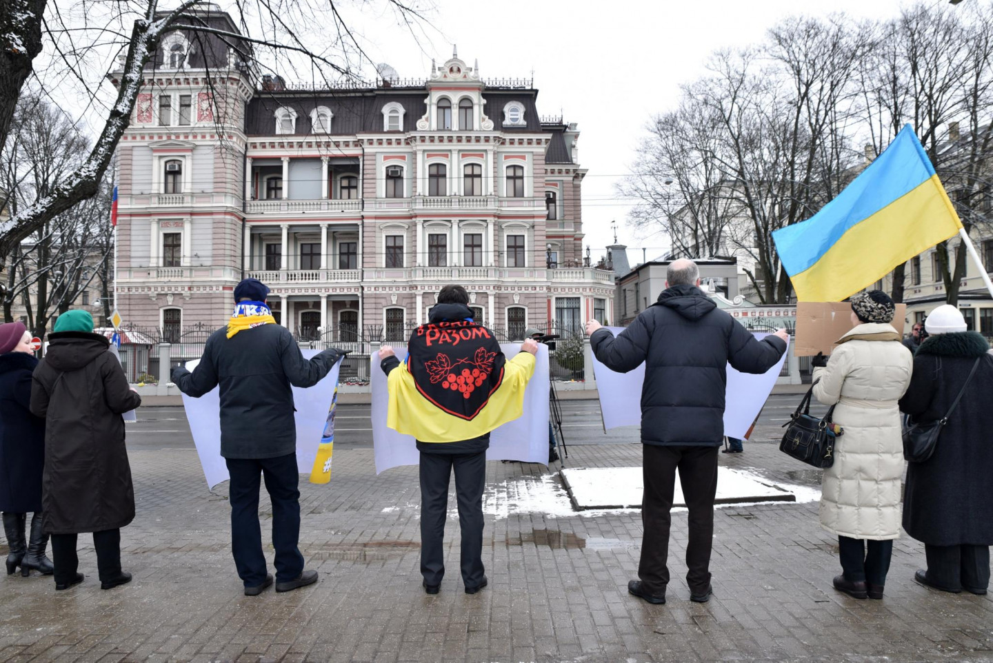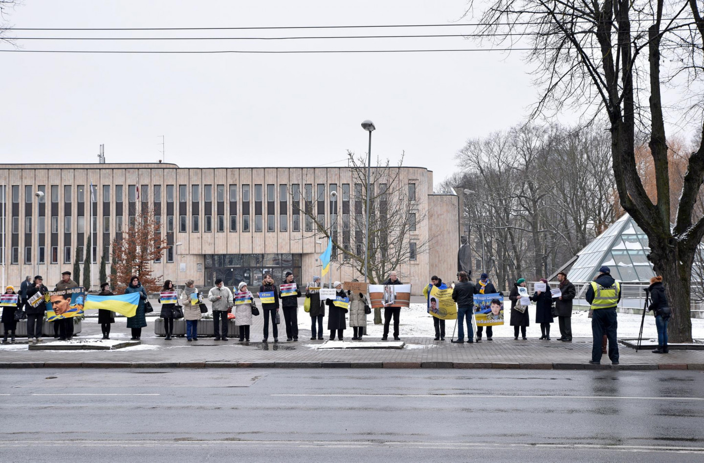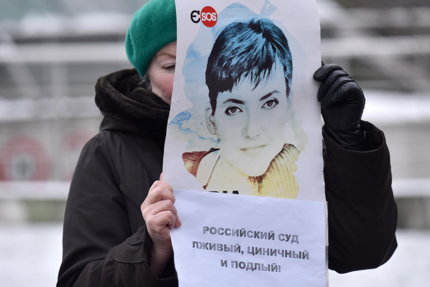 Ap 20 cilvēku iepretim Krievijas vēstniecībai šodien pauda atbalstu ukraiņu pilotei Nadijai Savčenko.