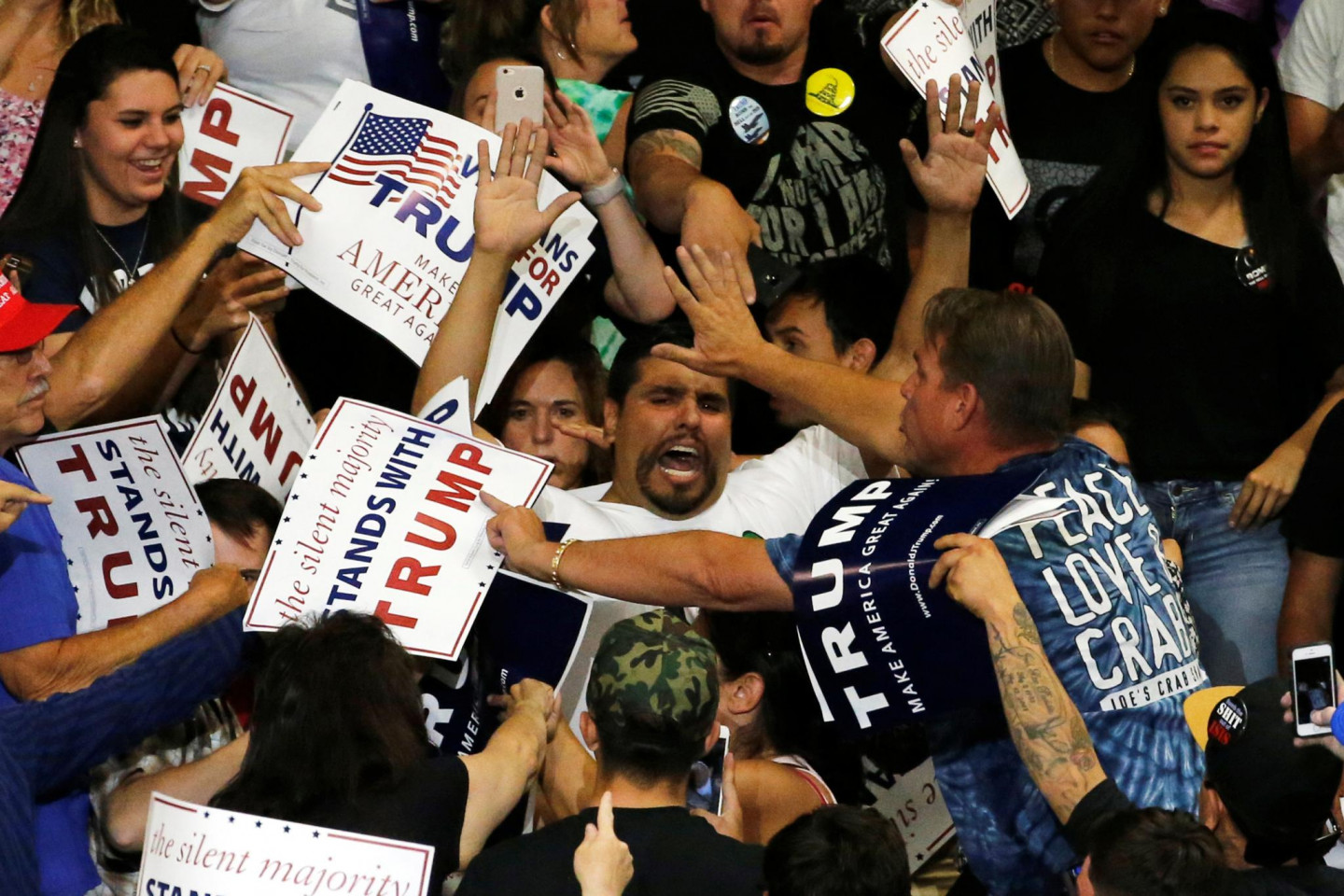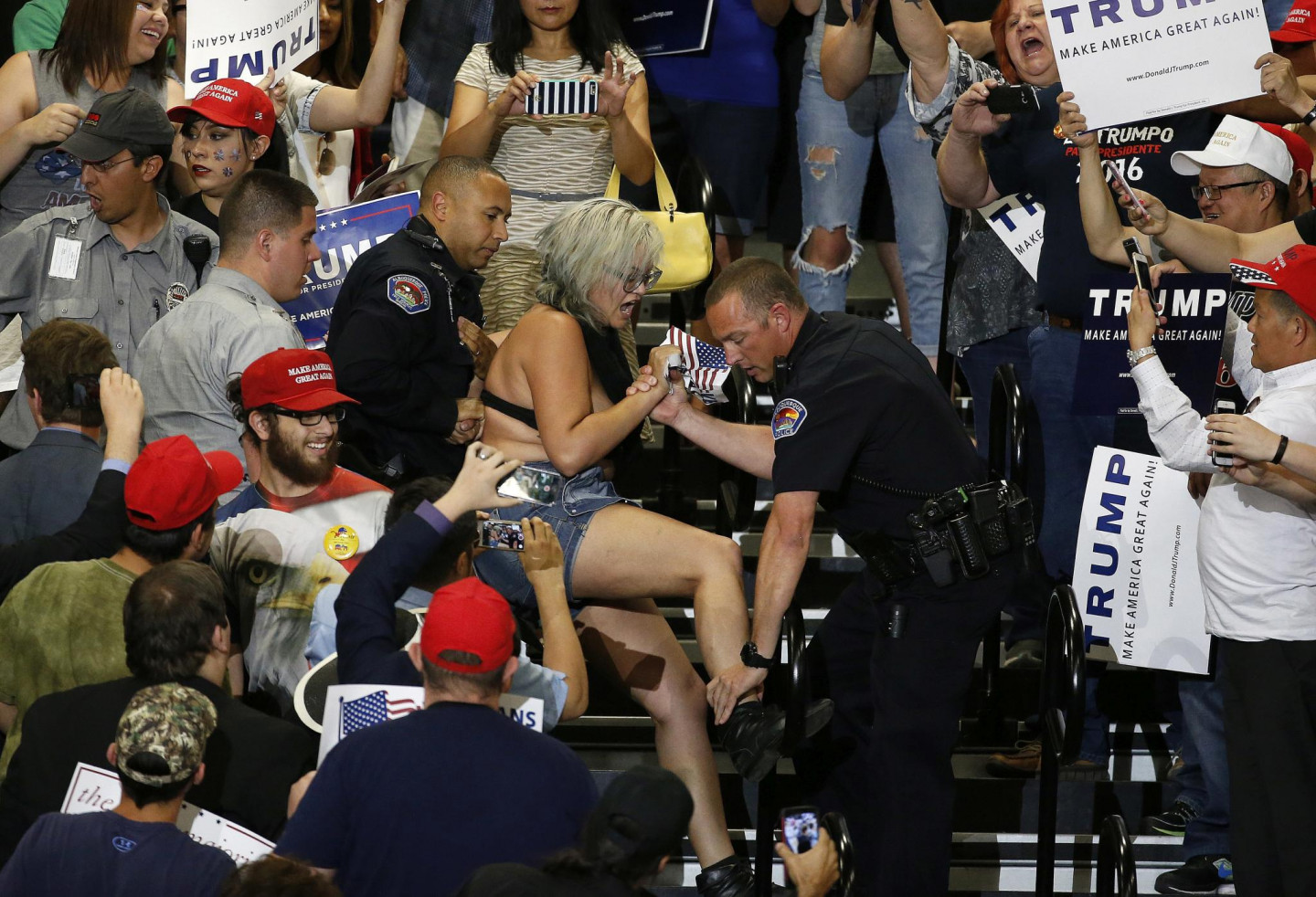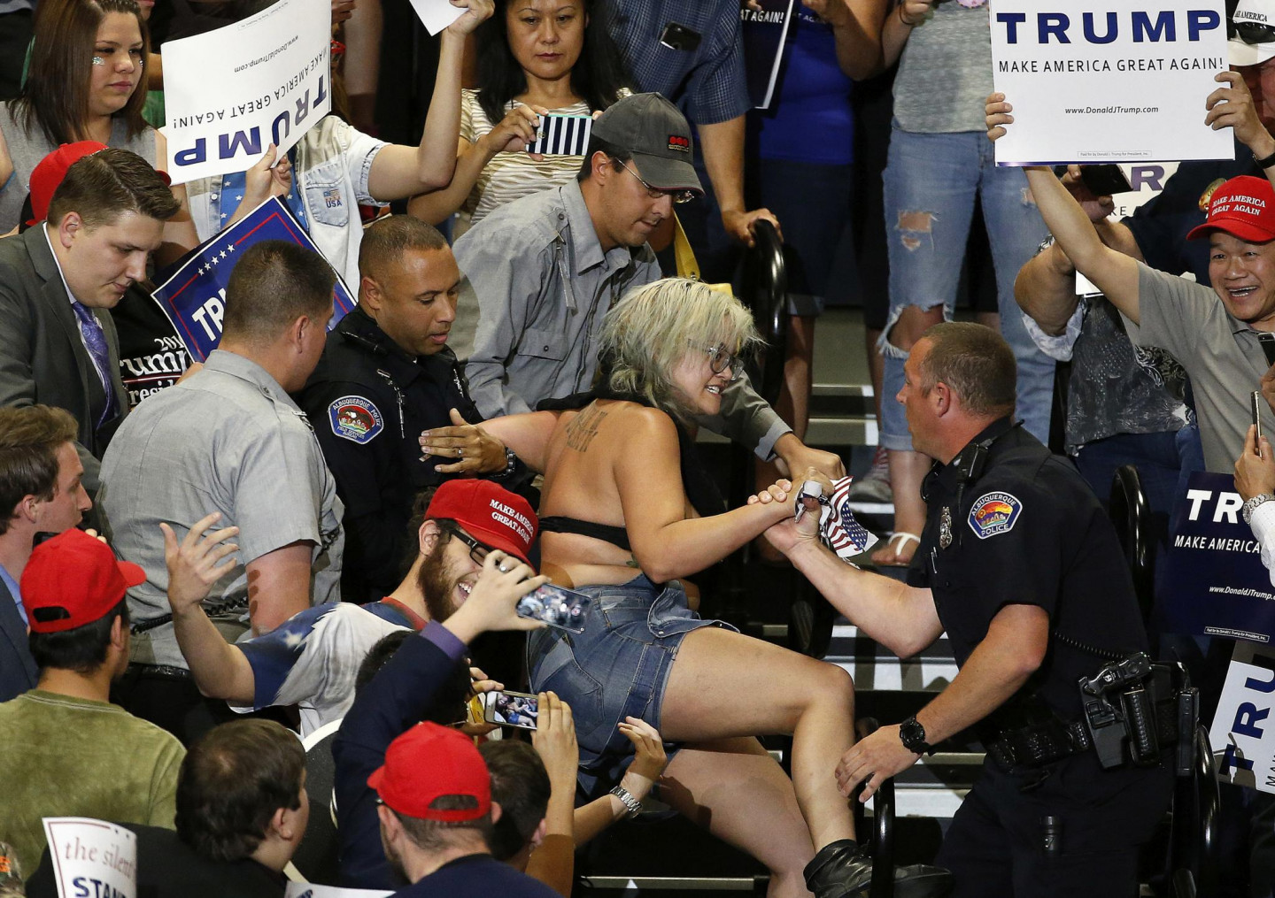 Neapmierināti protestētāji 24.maijā Donalda Trumpa priekšvēlēšanu uzrunas laikā sarīkojuši sadursmes. Viņi aktīvi iestājušies pret Trampa īstenoto politiku,